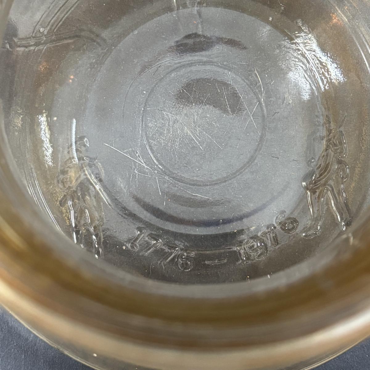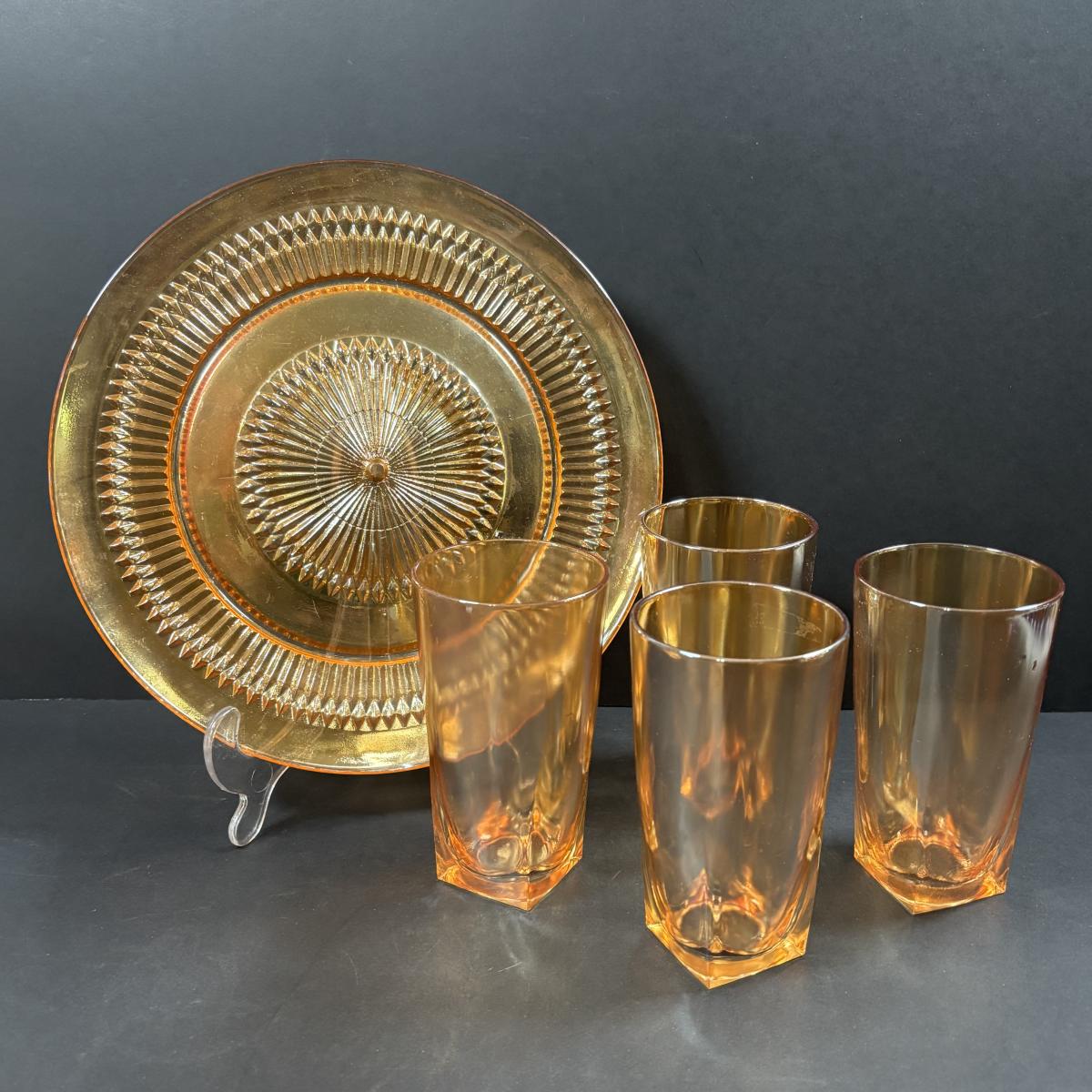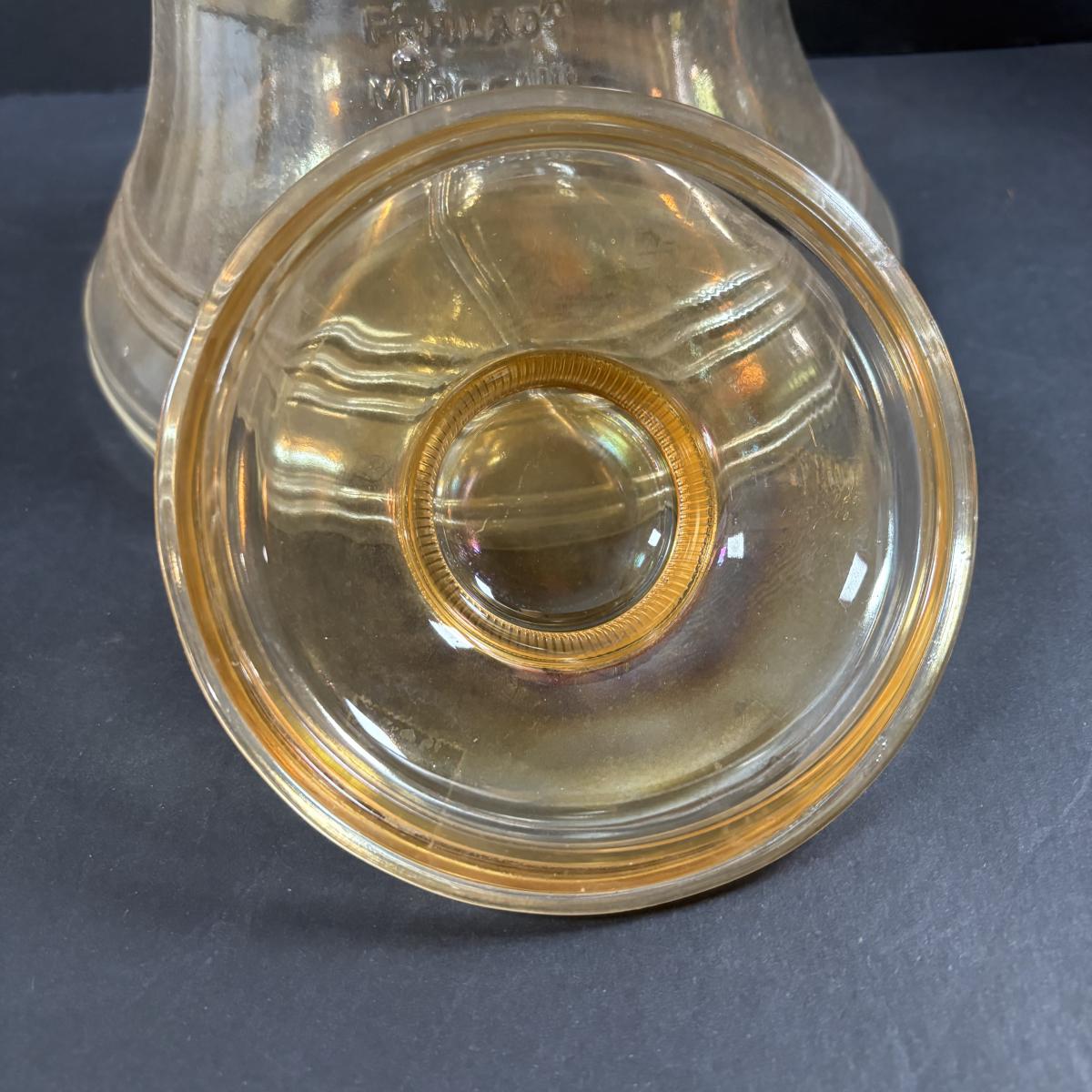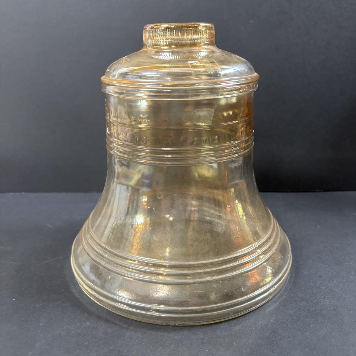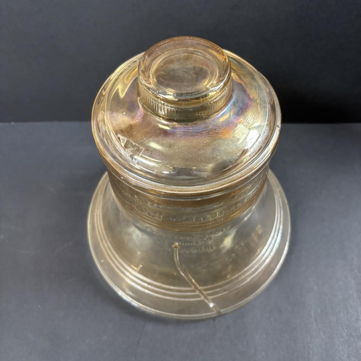 LOT 244: Bicentennial Amber Glass Liberty Bell Cookie Jar, Iridescent Marigold Tumblers & Serving Plate