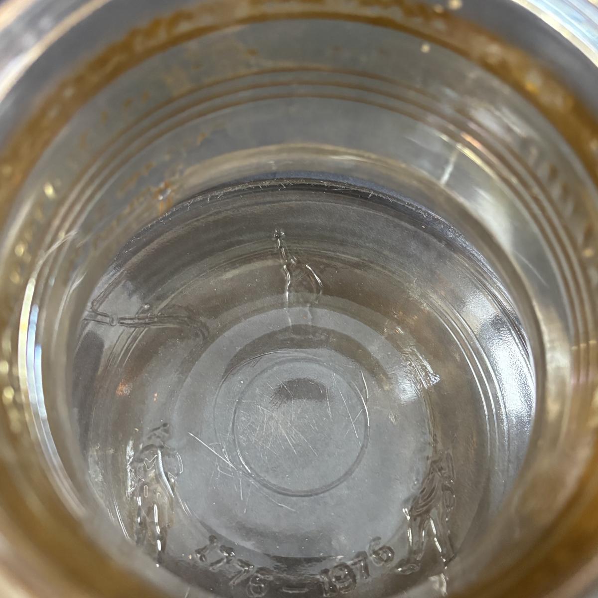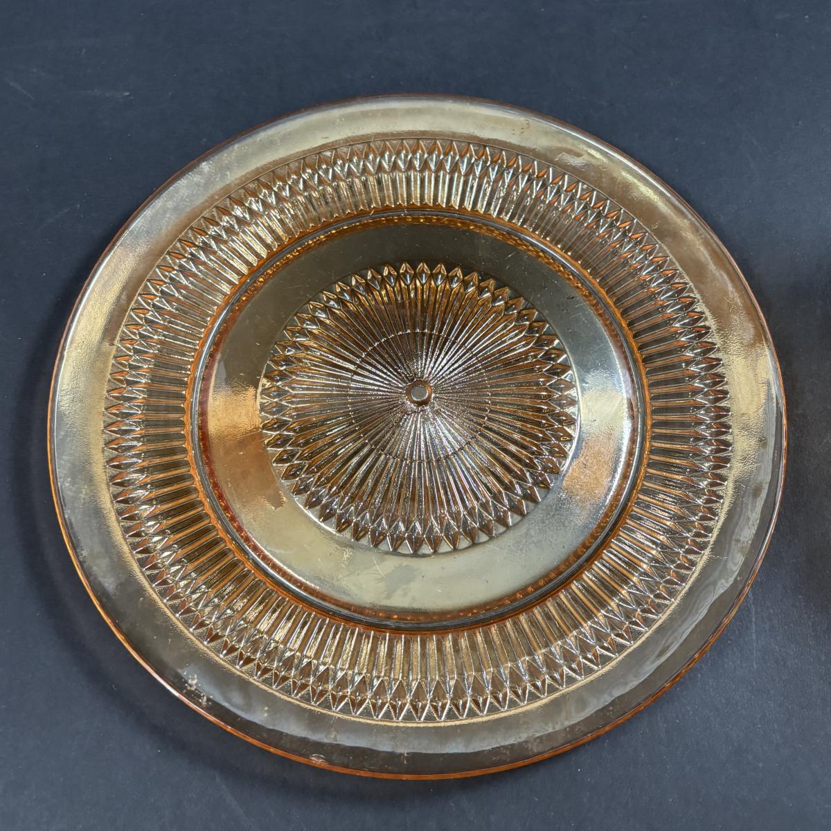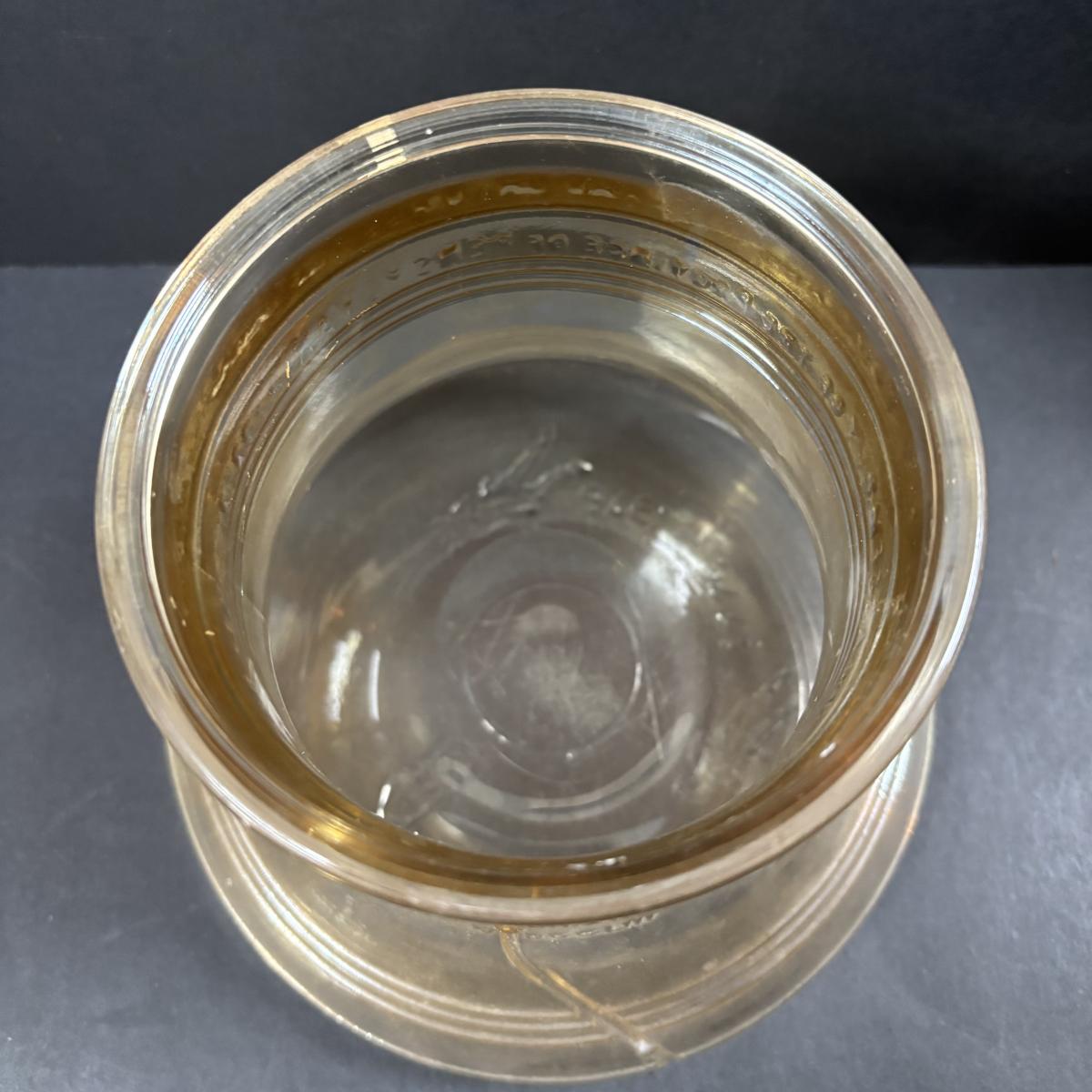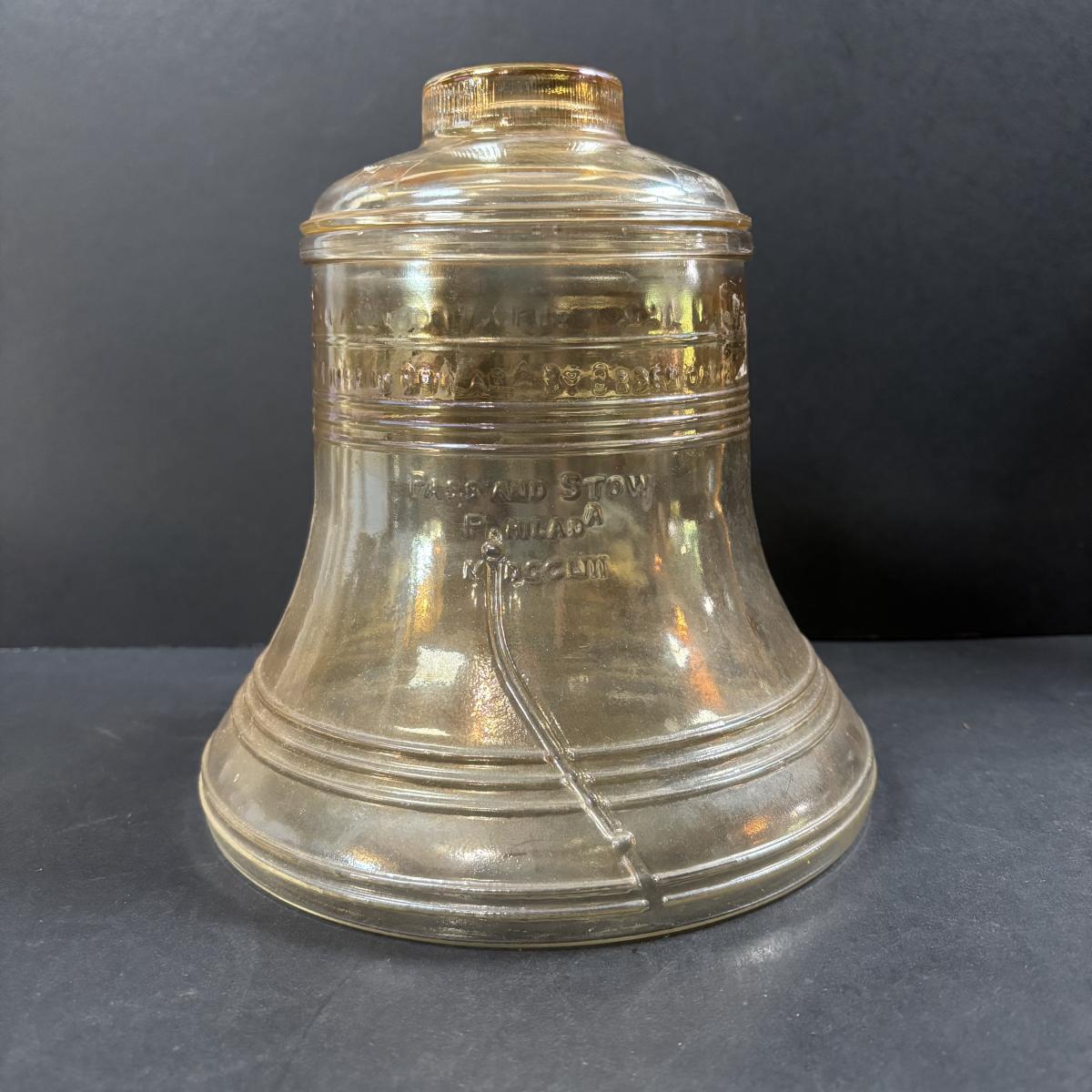 LOT 244: Bicentennial Amber Glass Liberty Bell Cookie Jar, Iridescent Marigold Tumblers & Serving Plate