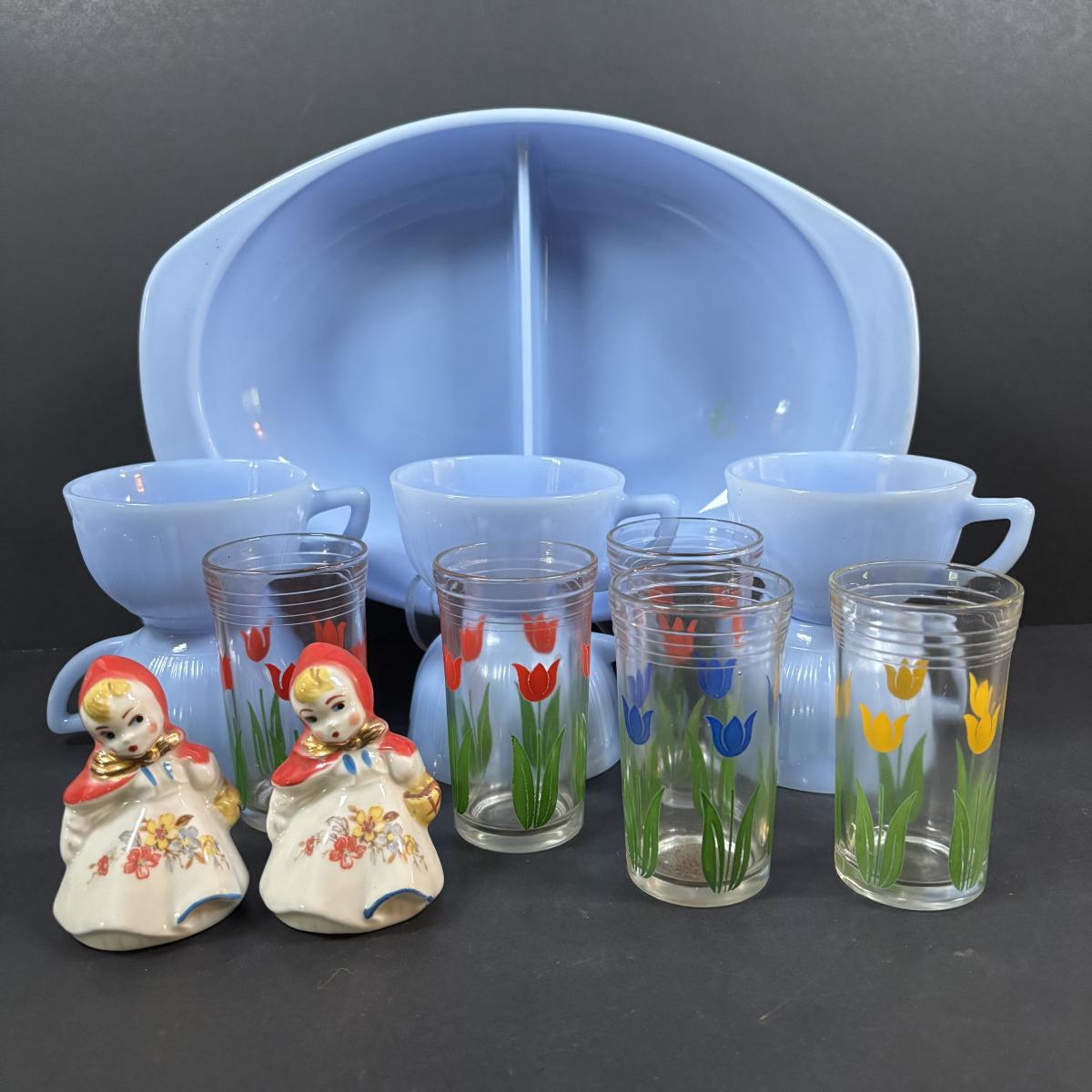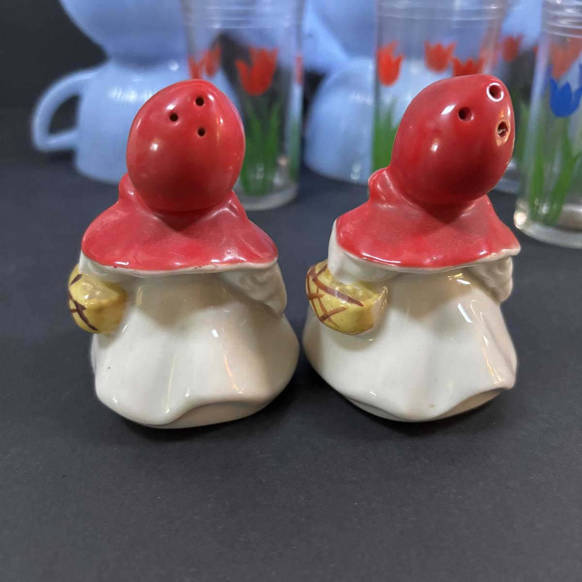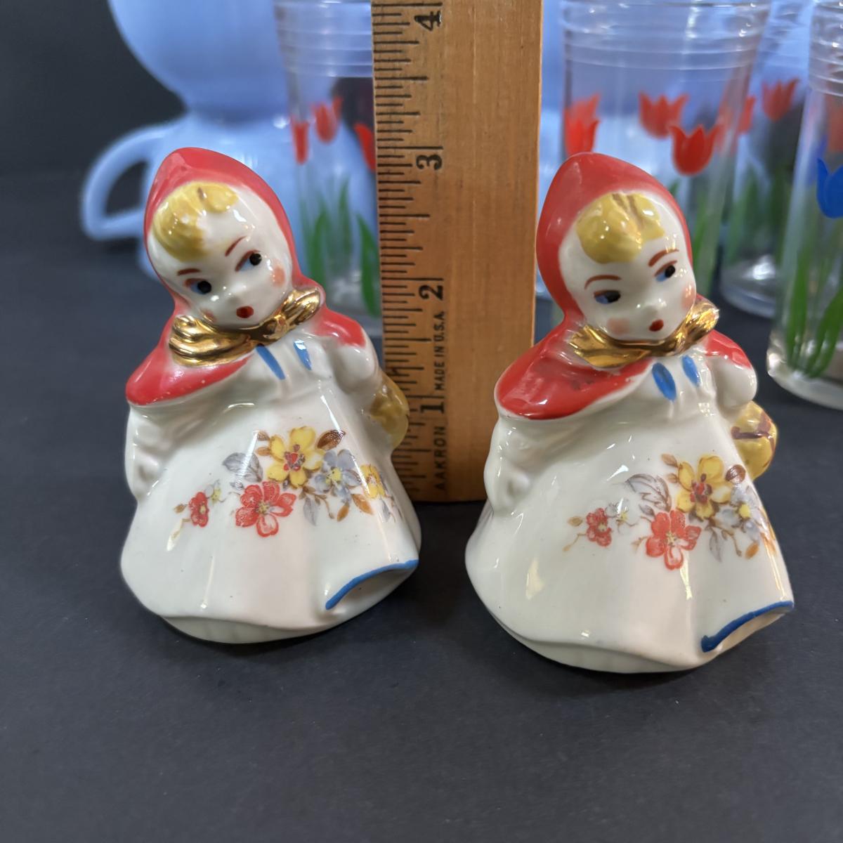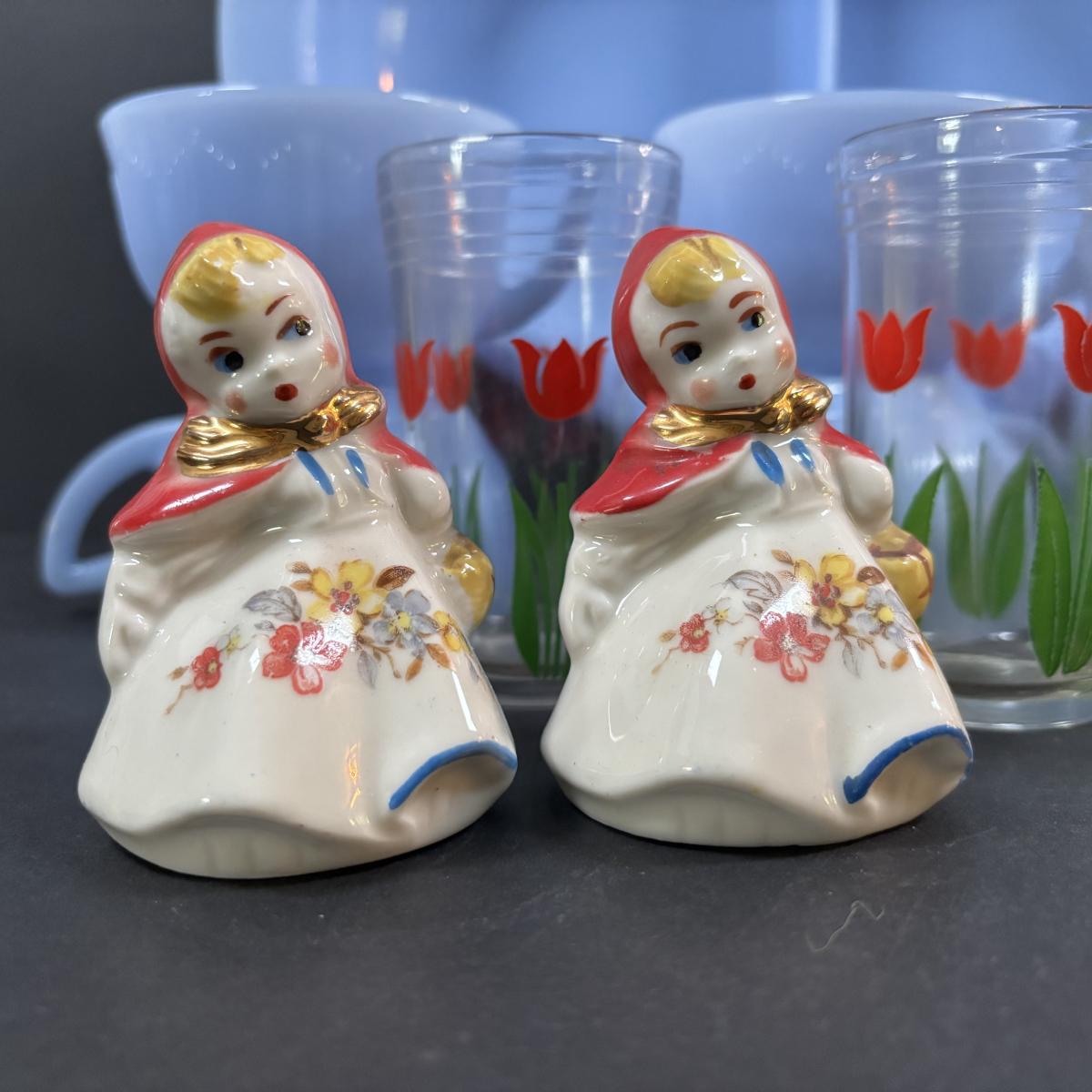 LOT 251: Hull Pottery Little Red Riding Hood Salt/Pepper Shakers, Blue Pyrex and Tulip Juice Glasses