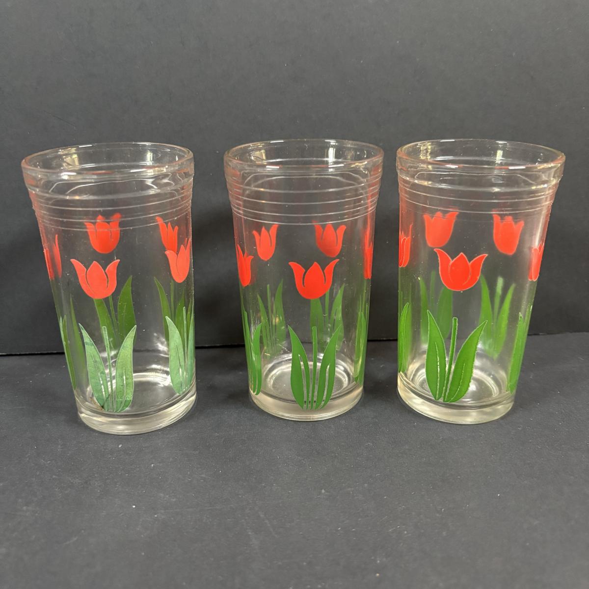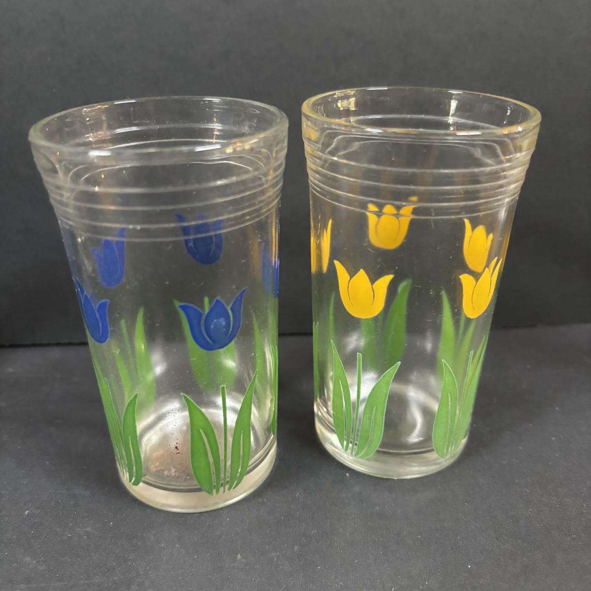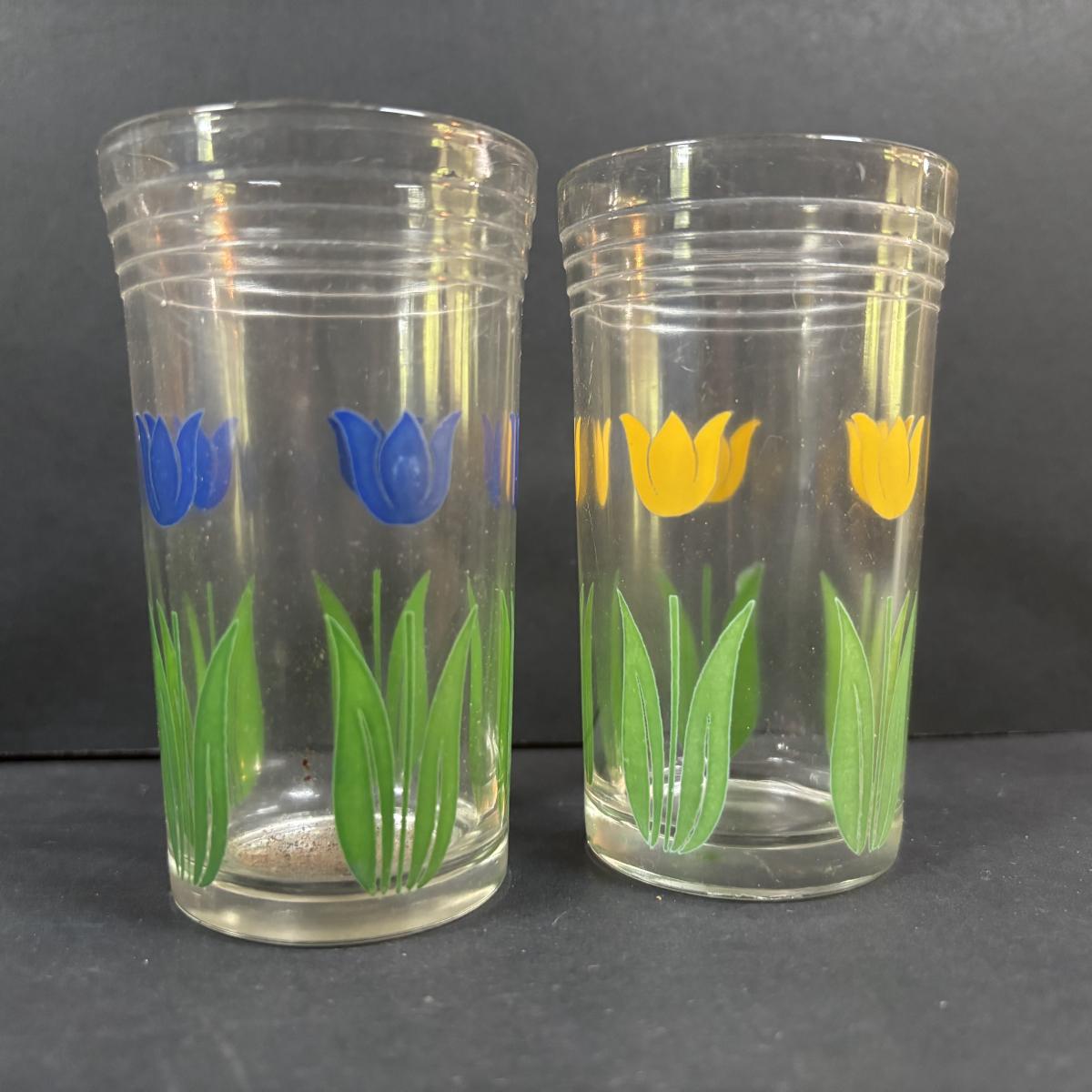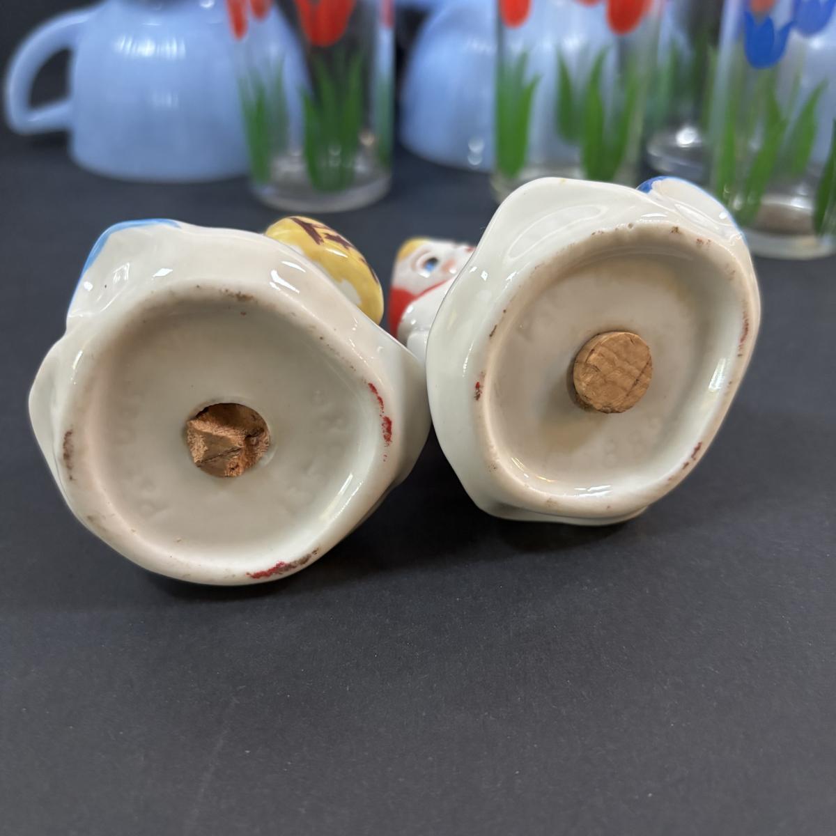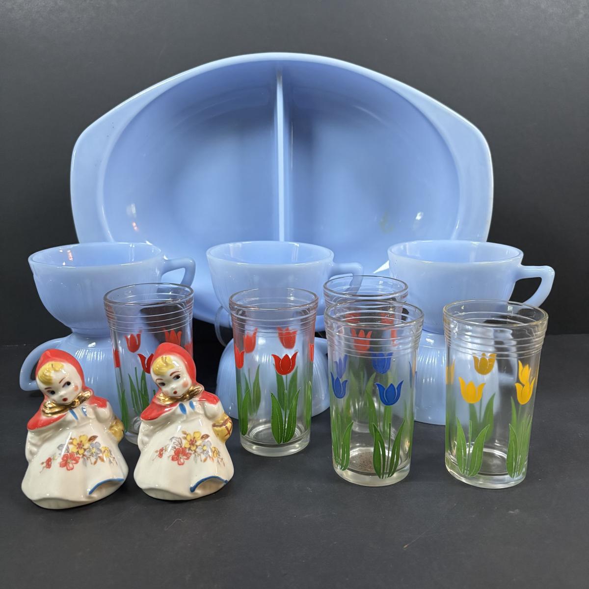 LOT 251: Hull Pottery Little Red Riding Hood Salt/Pepper Shakers, Blue Pyrex and Tulip Juice Glasses
