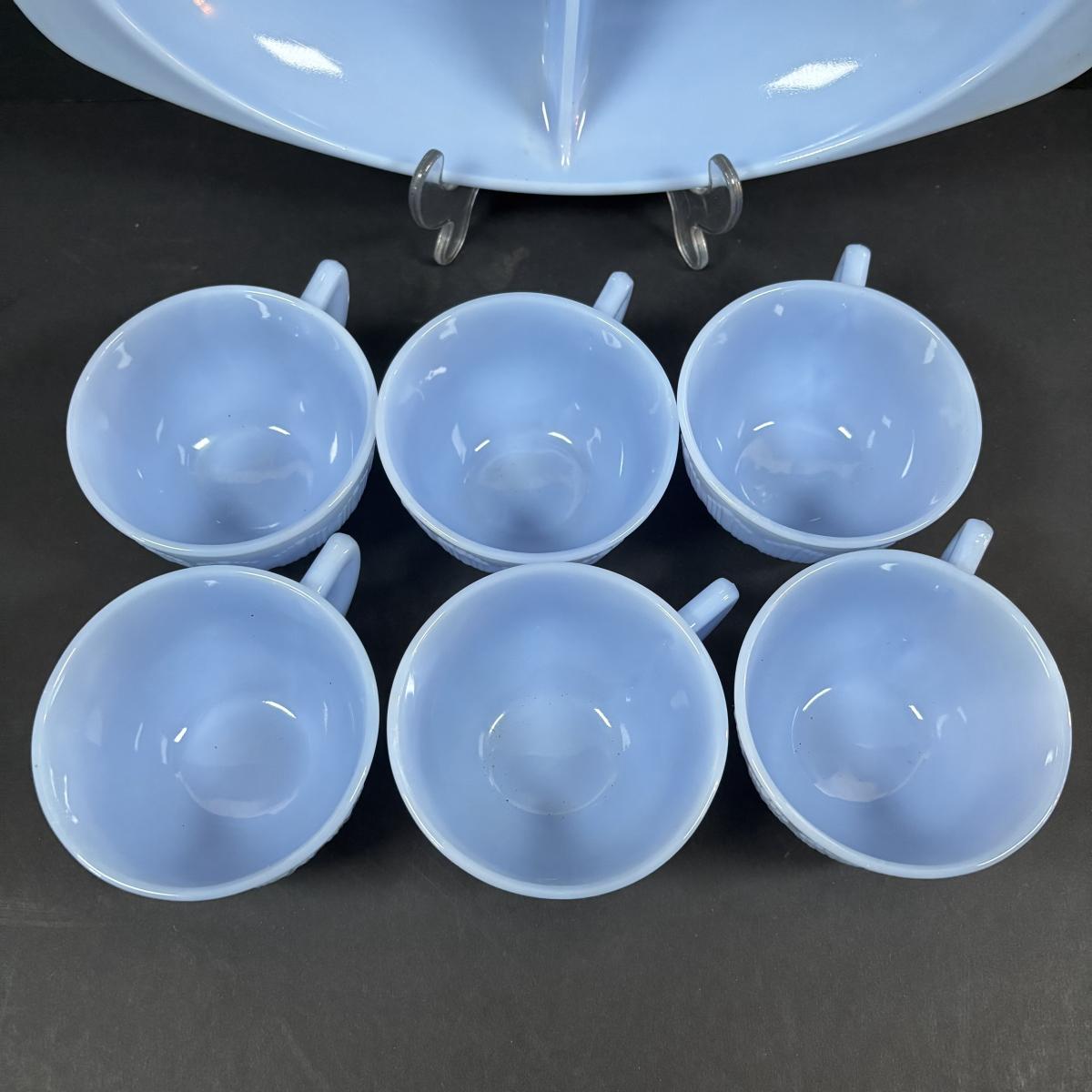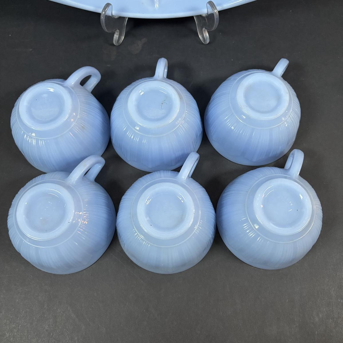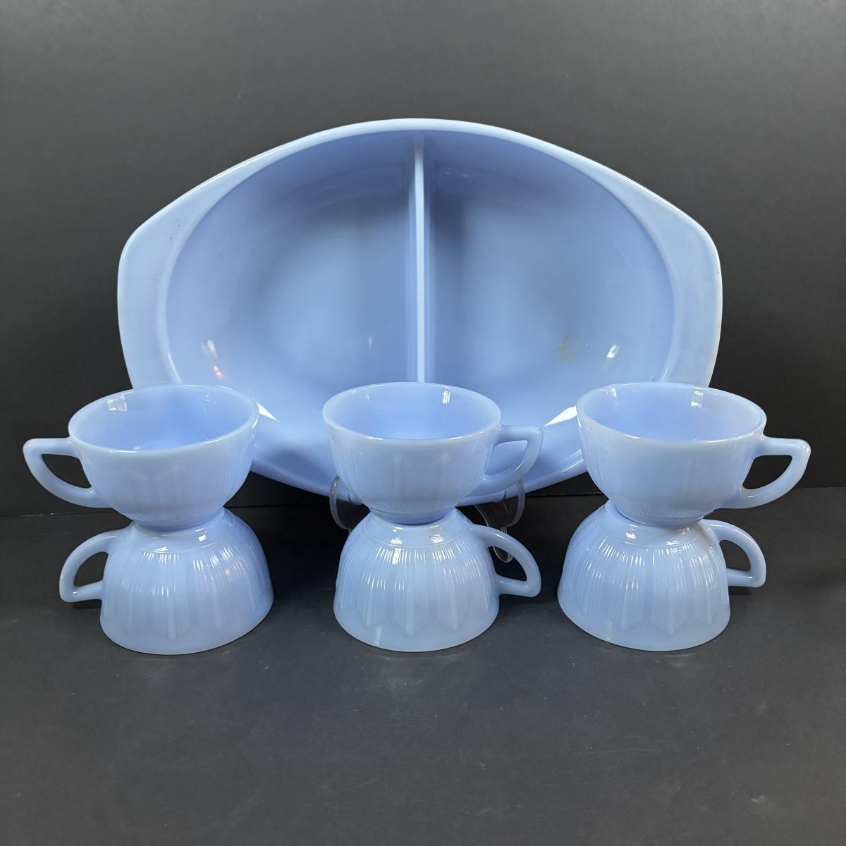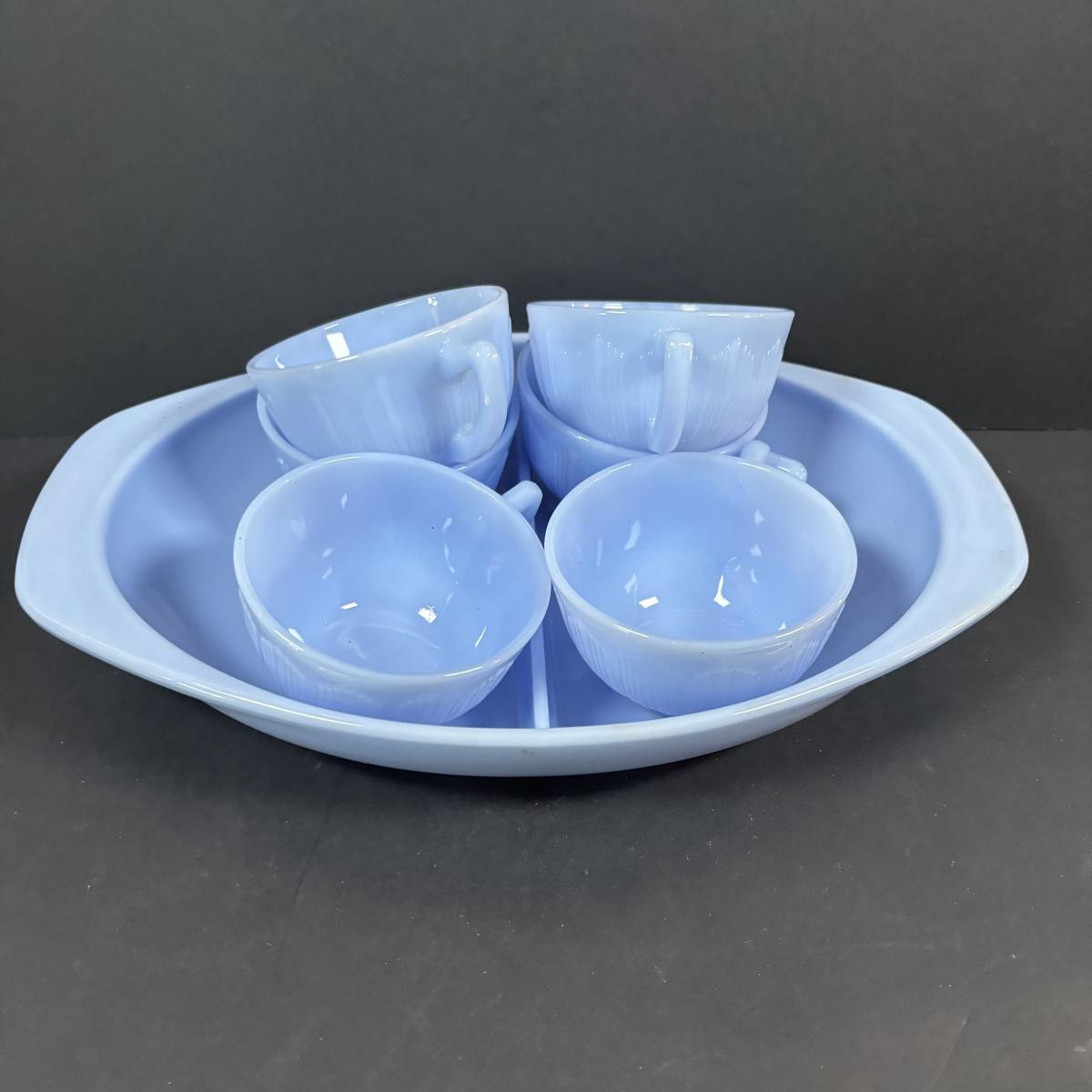 LOT 251: Hull Pottery Little Red Riding Hood Salt/Pepper Shakers, Blue Pyrex and Tulip Juice Glasses
