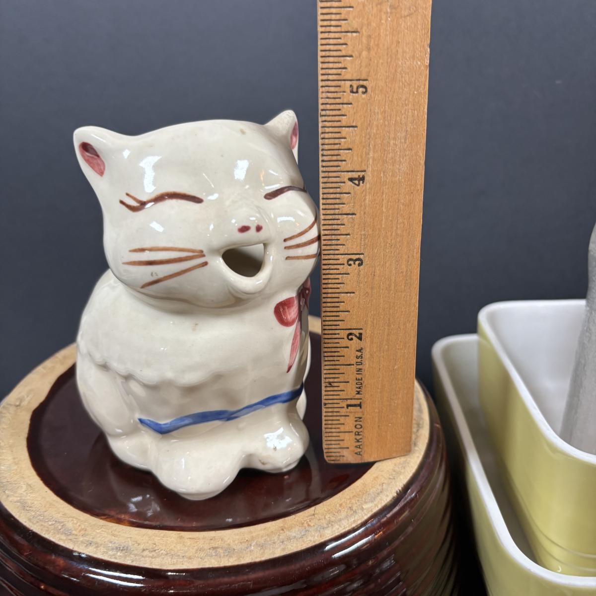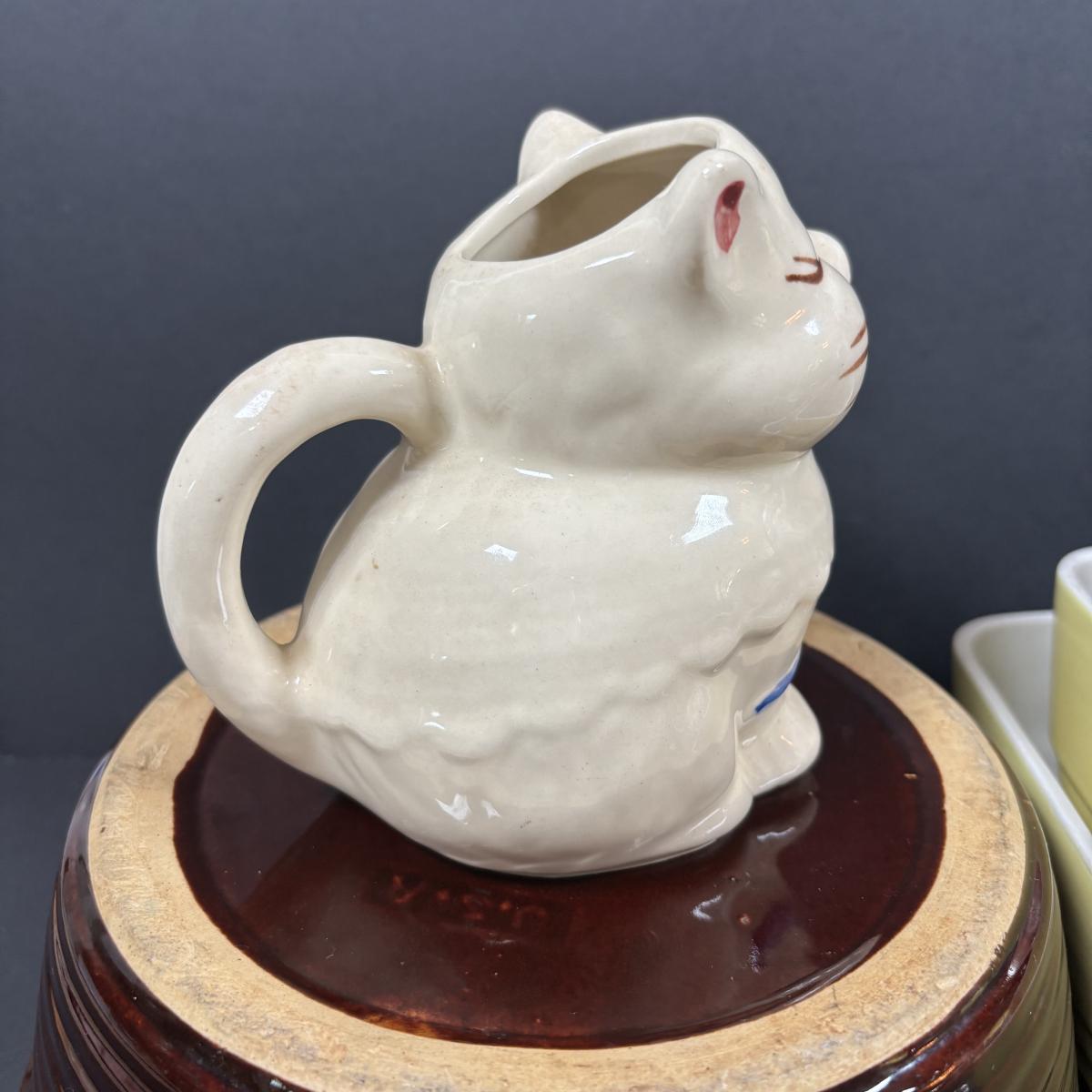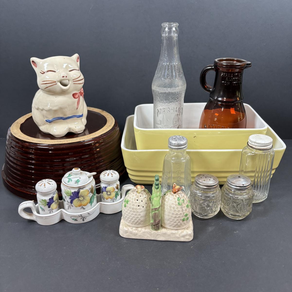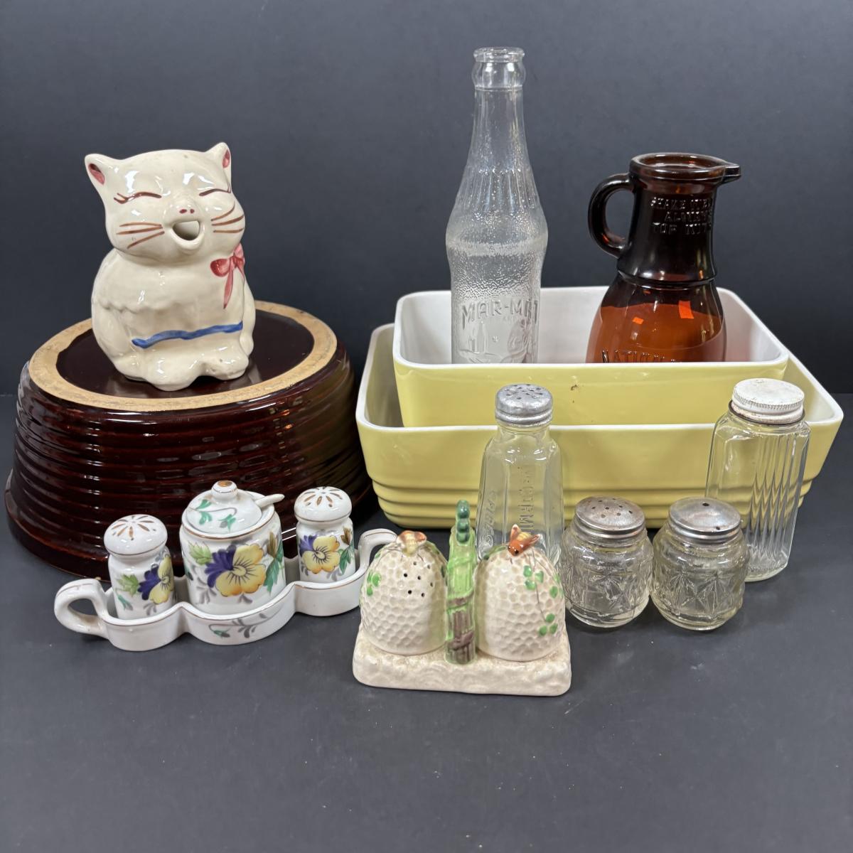 LOT 261: Hall for Westing House Refrigerator Dishes (no lids), Brown Glaze Bowl USA, Shawnee Cat Creamer, National Dairy Orange Juice Bottle & More