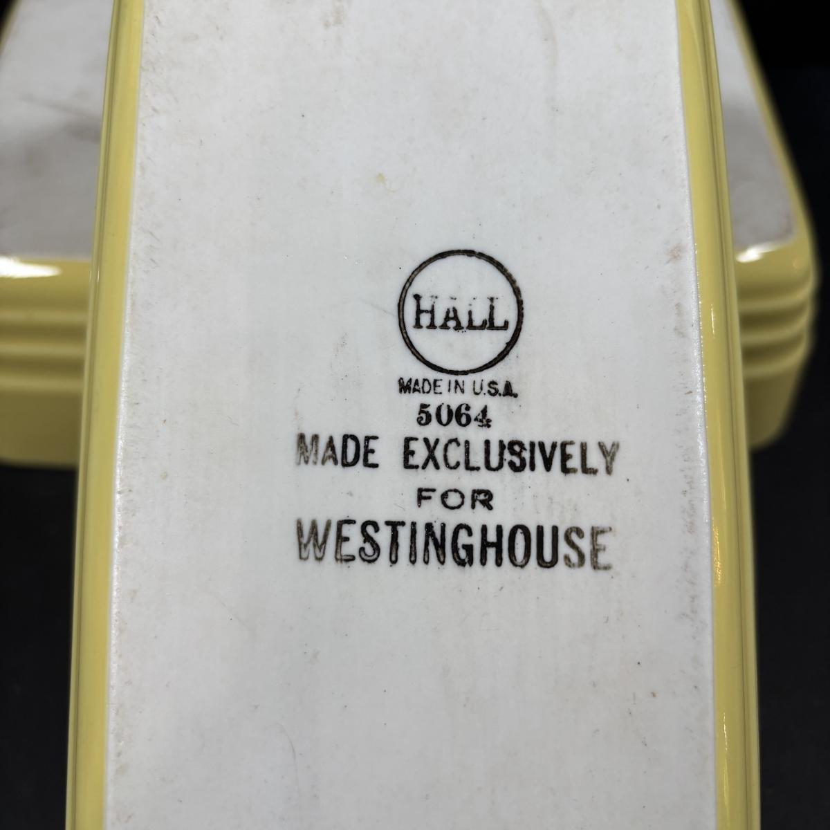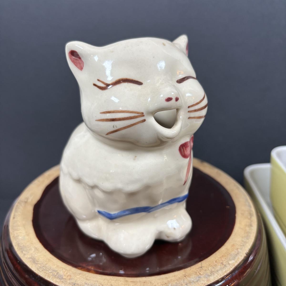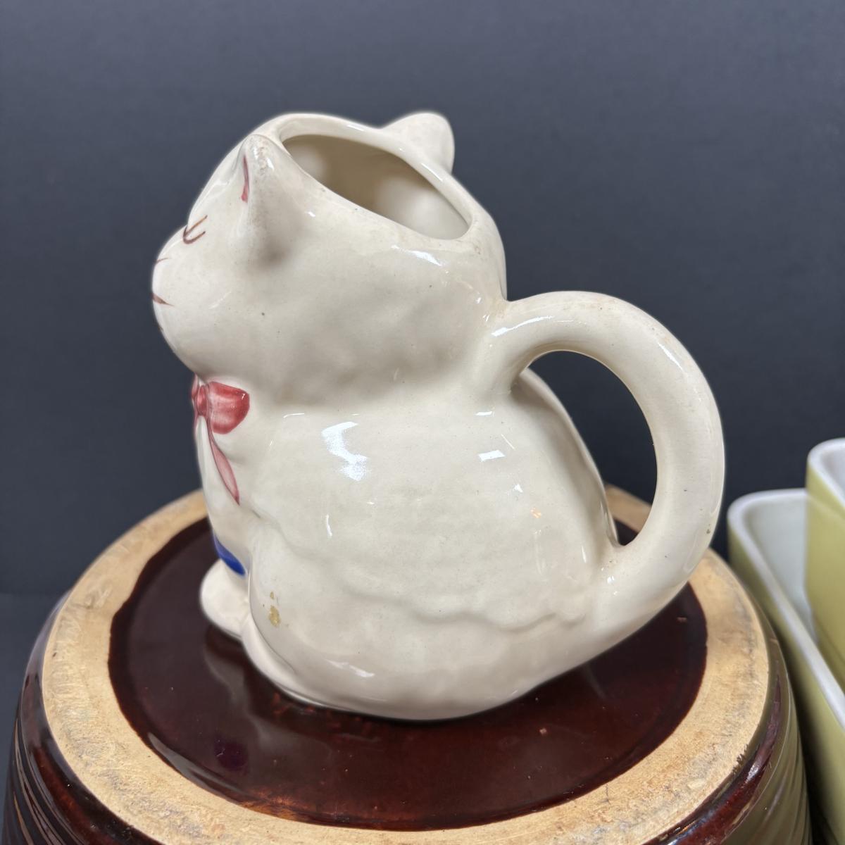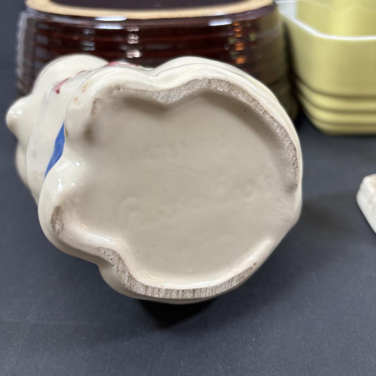 LOT 261: Hall for Westing House Refrigerator Dishes (no lids), Brown Glaze Bowl USA, Shawnee Cat Creamer, National Dairy Orange Juice Bottle & More