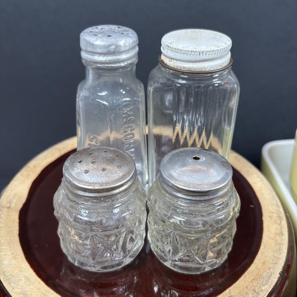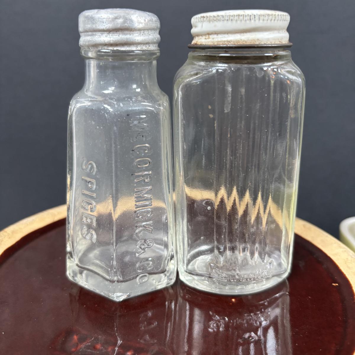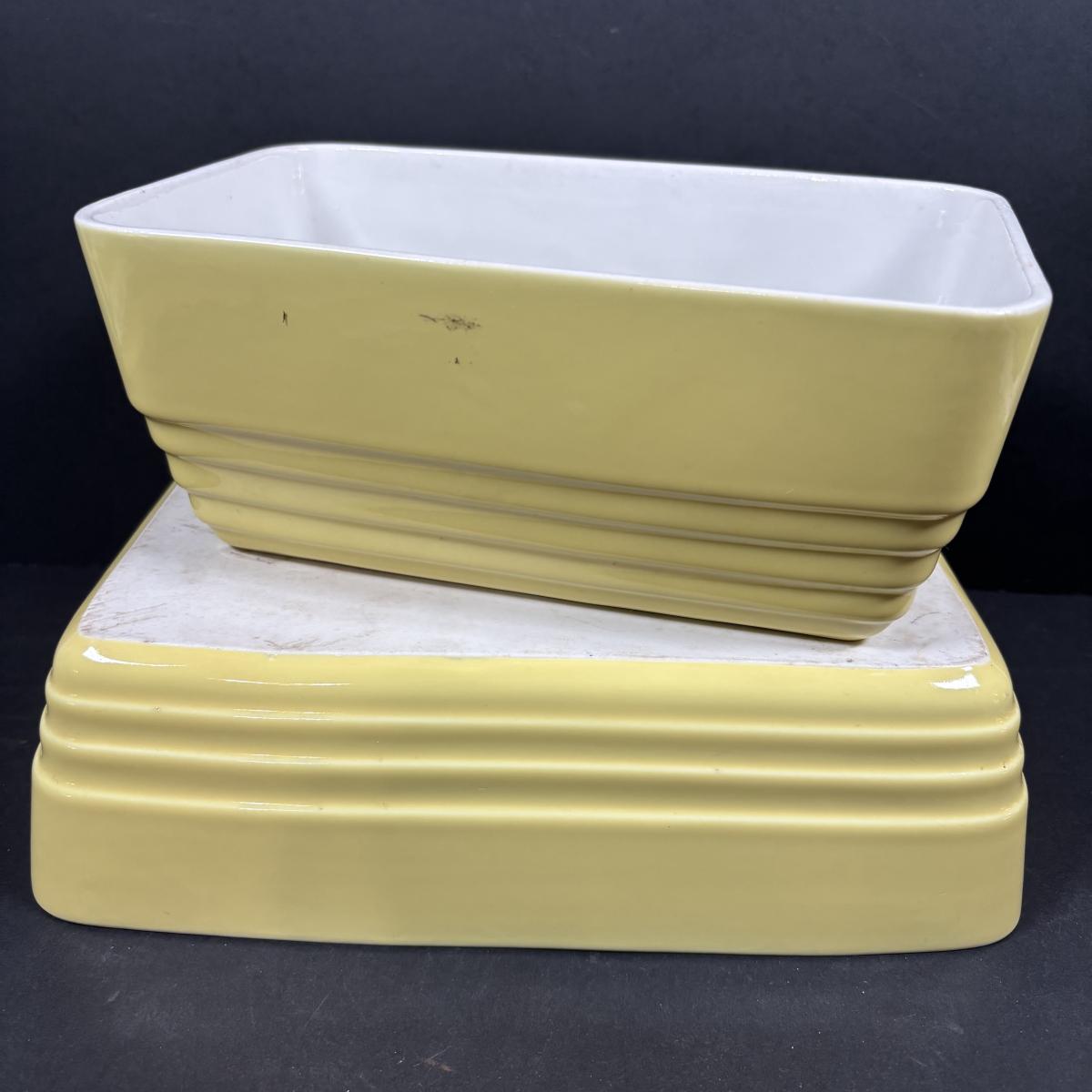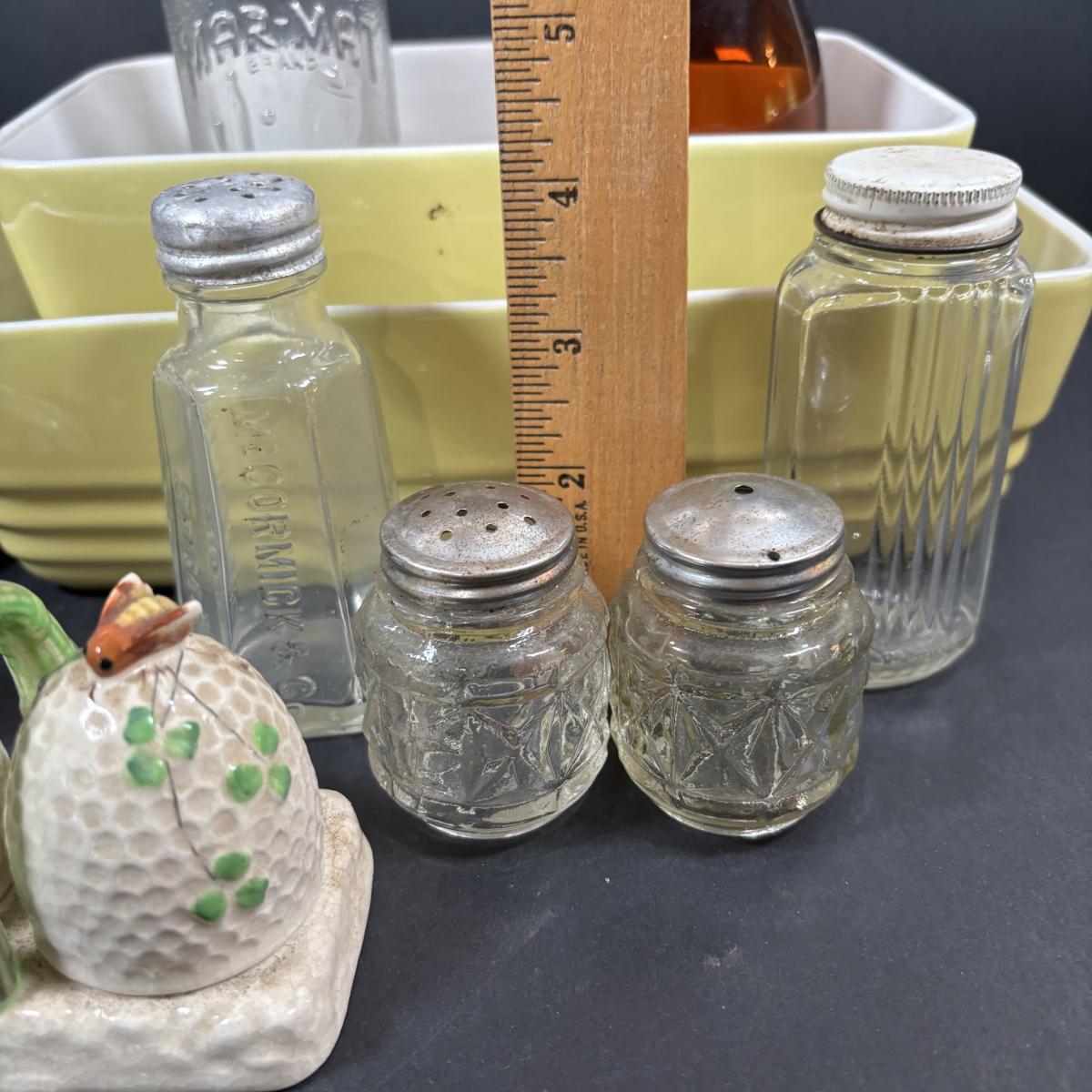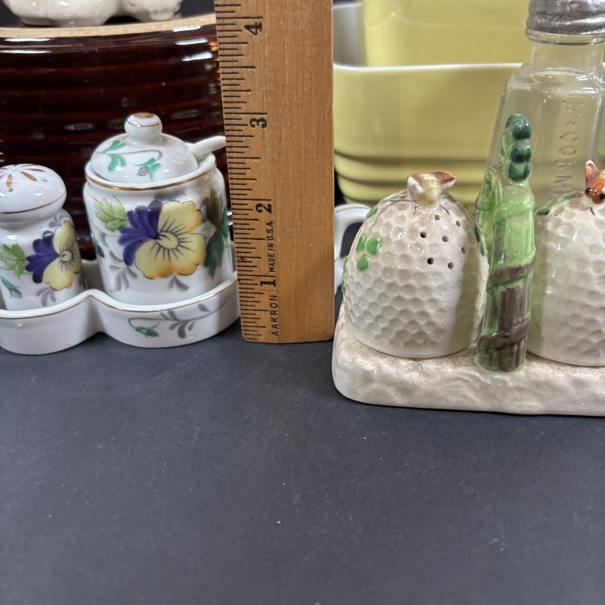 LOT 261: Hall for Westing House Refrigerator Dishes (no lids), Brown Glaze Bowl USA, Shawnee Cat Creamer, National Dairy Orange Juice Bottle & More