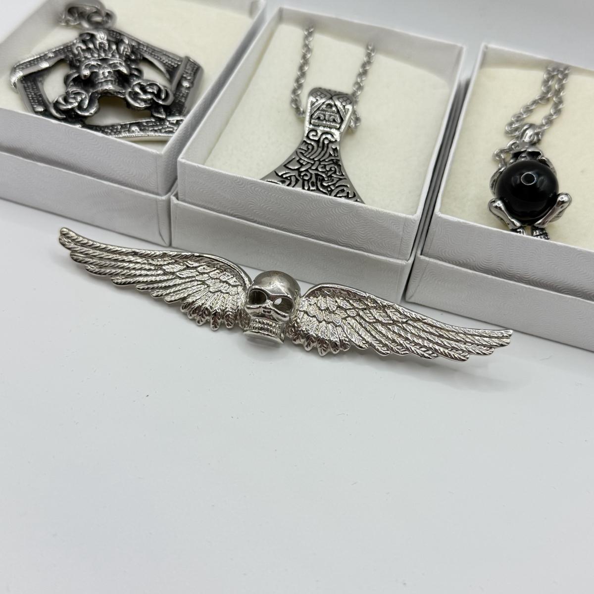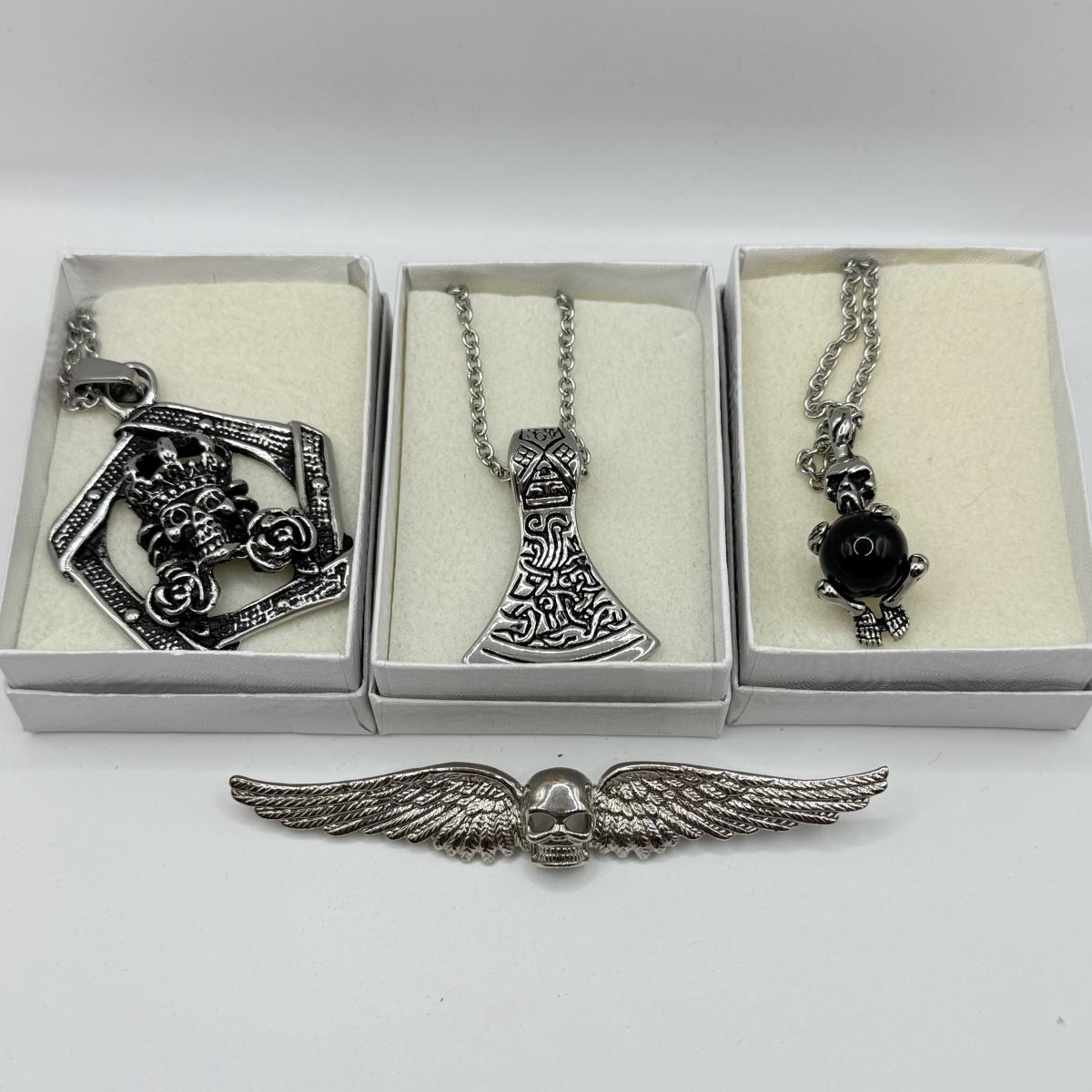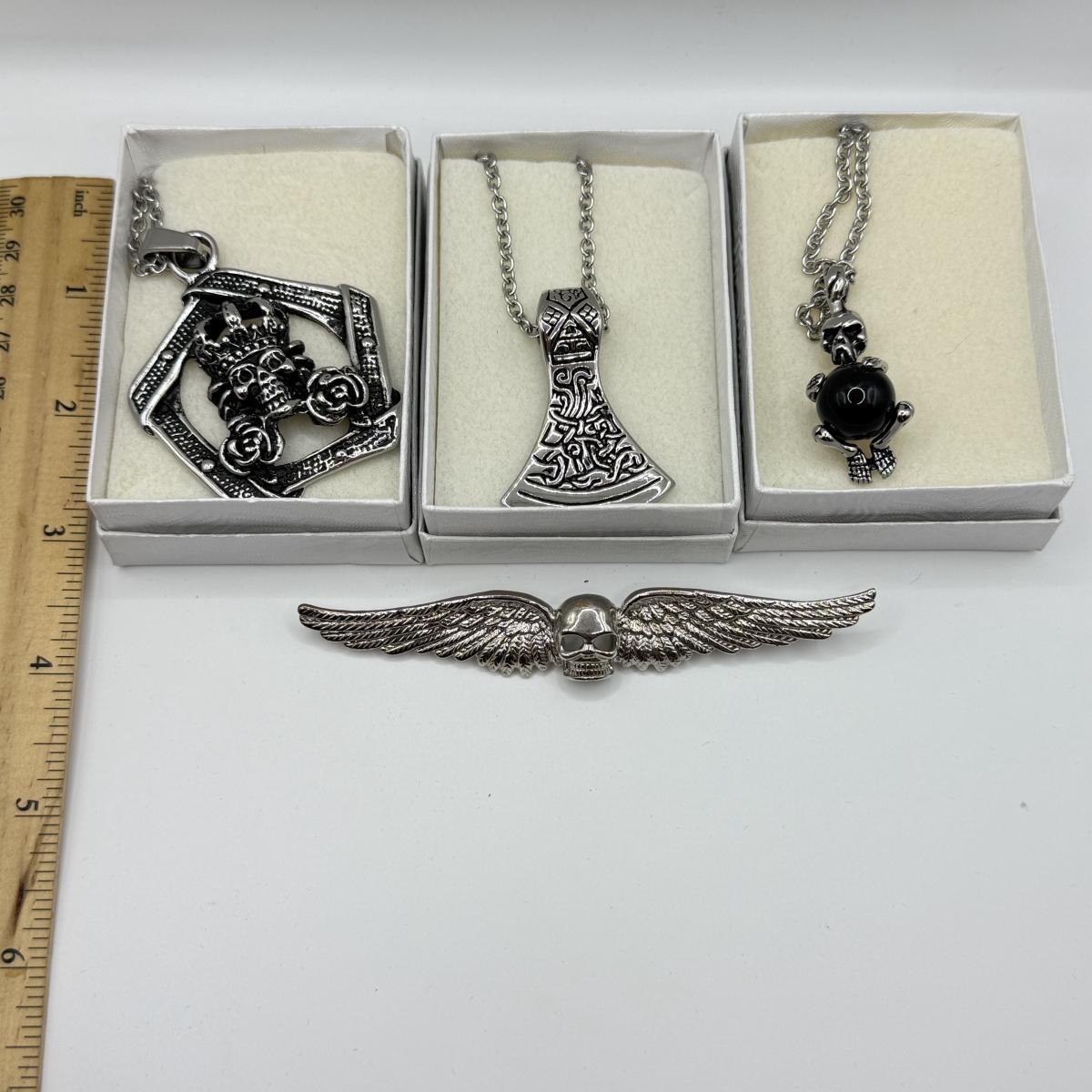 LOT 26: Skull / Skeleton Jewelry Collection: Three Necklaces & Pin