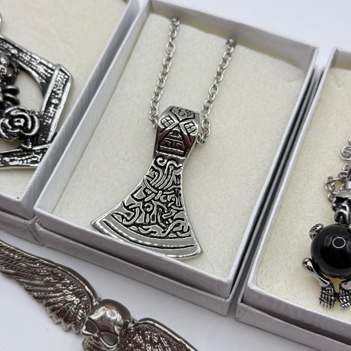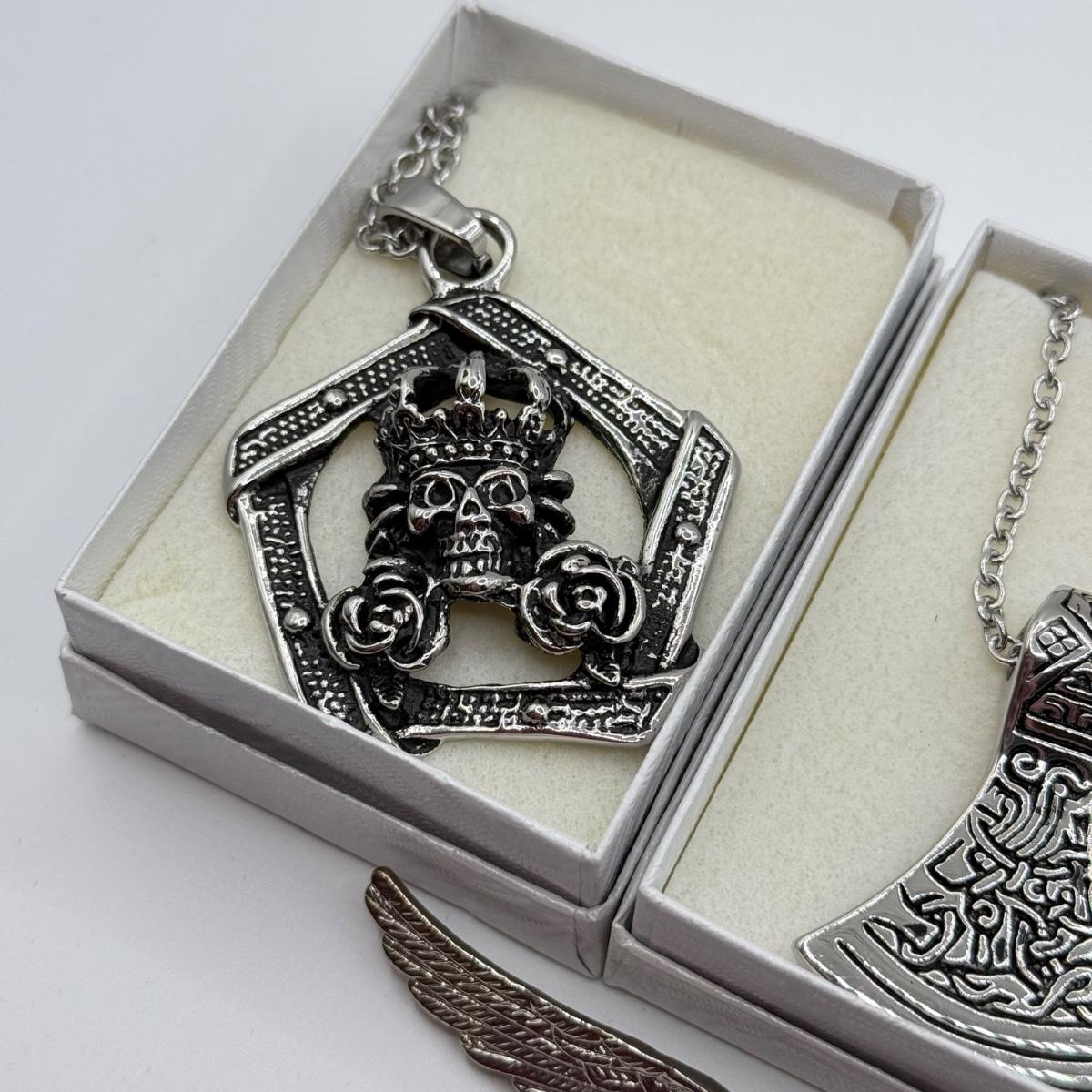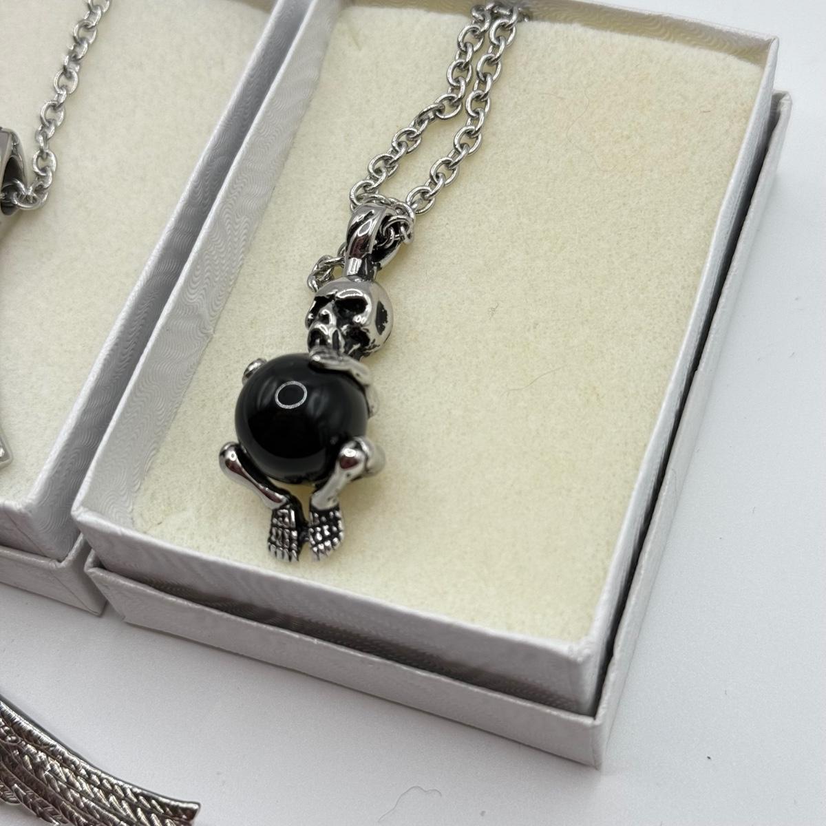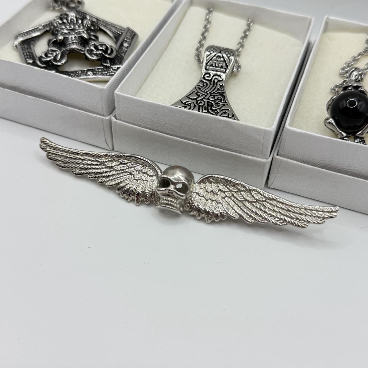 LOT 26: Skull / Skeleton Jewelry Collection: Three Necklaces & Pin