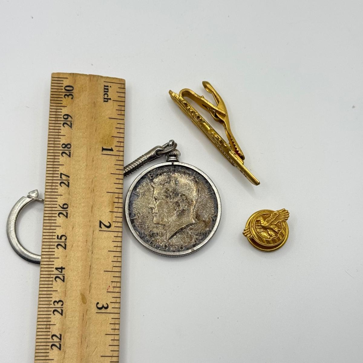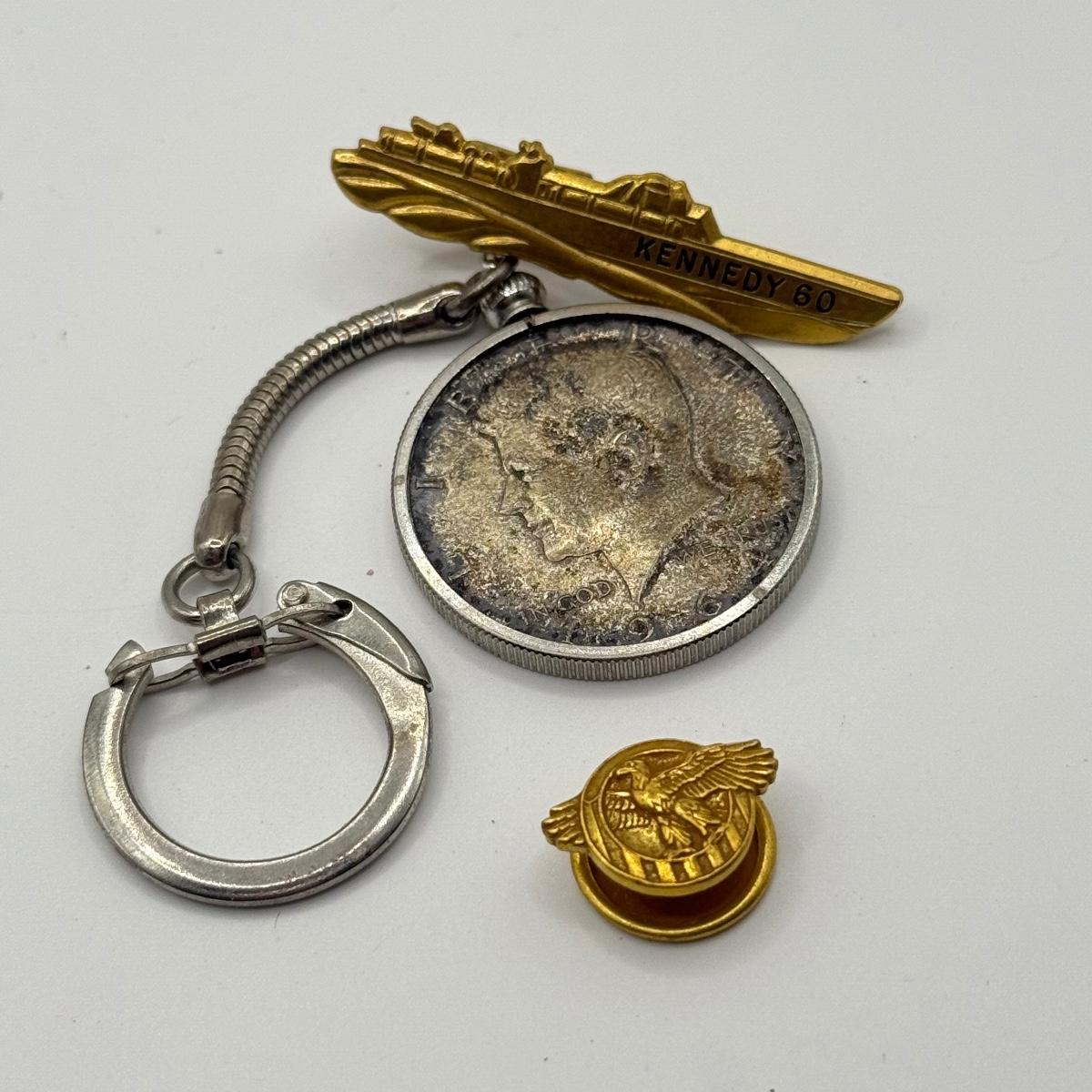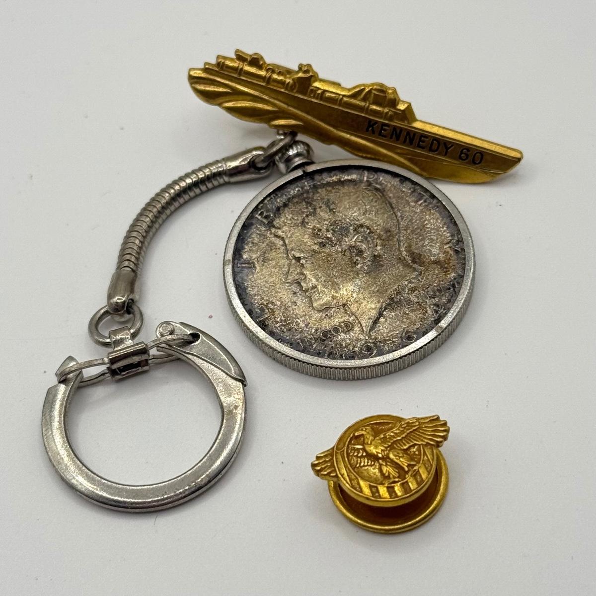 LOT 45: Vintage PT Boat 1960 Kennedy Presidency Campaign Tie Clip, WWII Honorable Discharge "Ruptured Duck" Lapel Pin & 90% Silver Kennedy Half Dollar Keychain