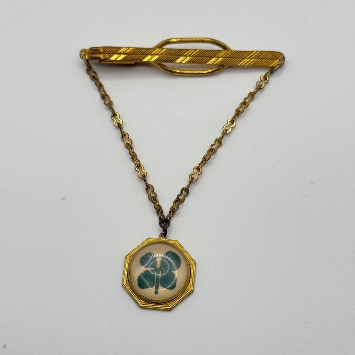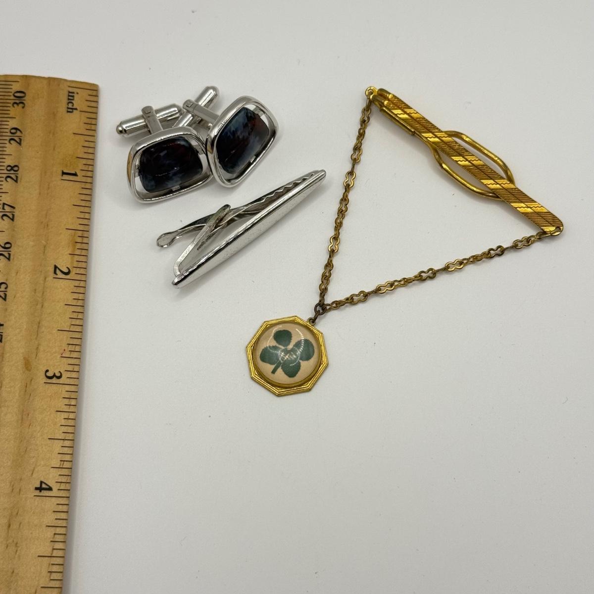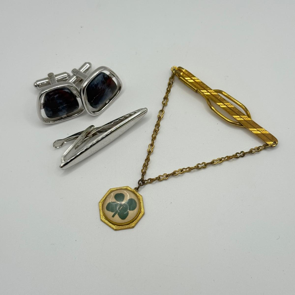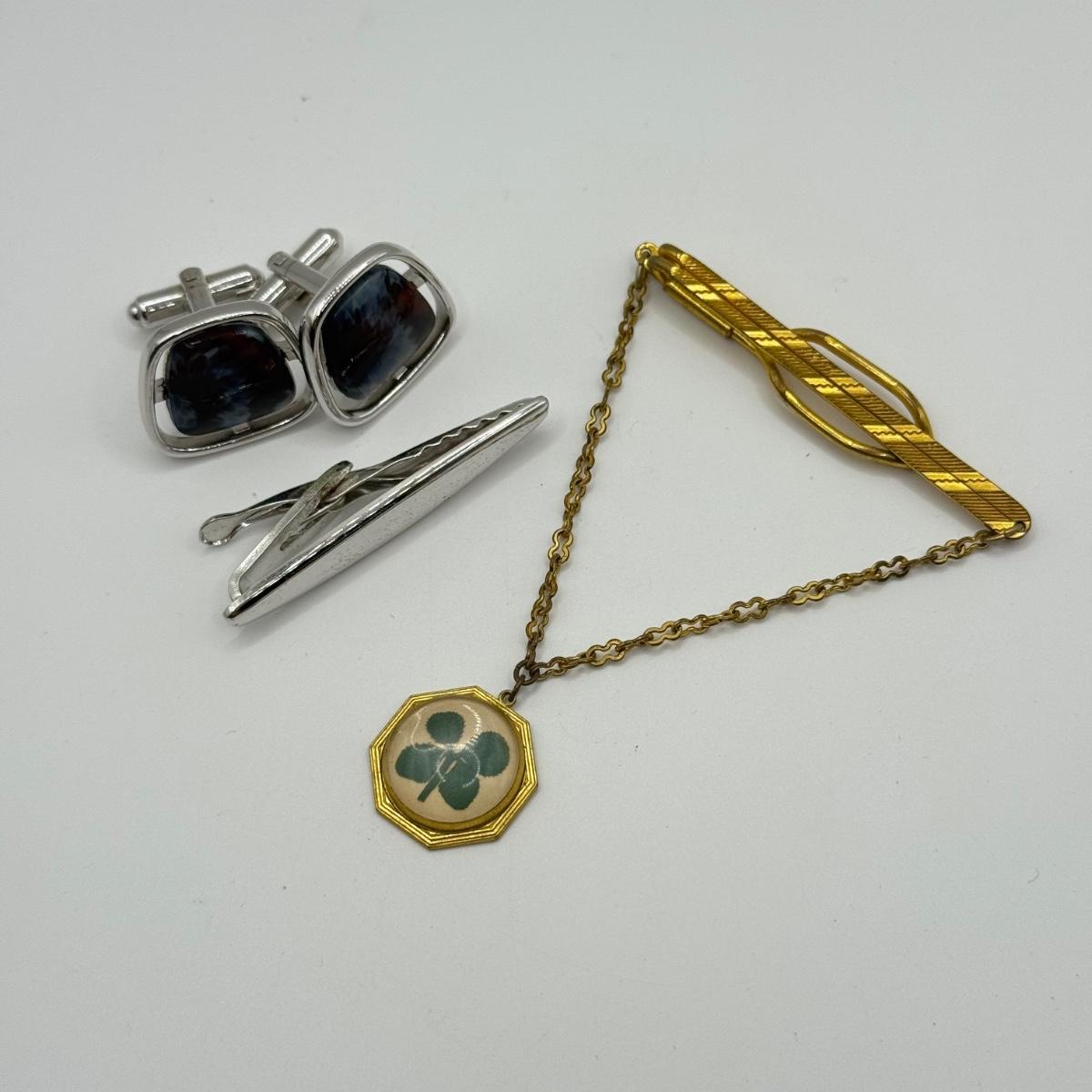 LOT 50: Vintage Hickok 4 Leaf Clover Tie Bar, Hickok Cufflinks w/ Enameled Stone Center & Silvertone Tie Clip
