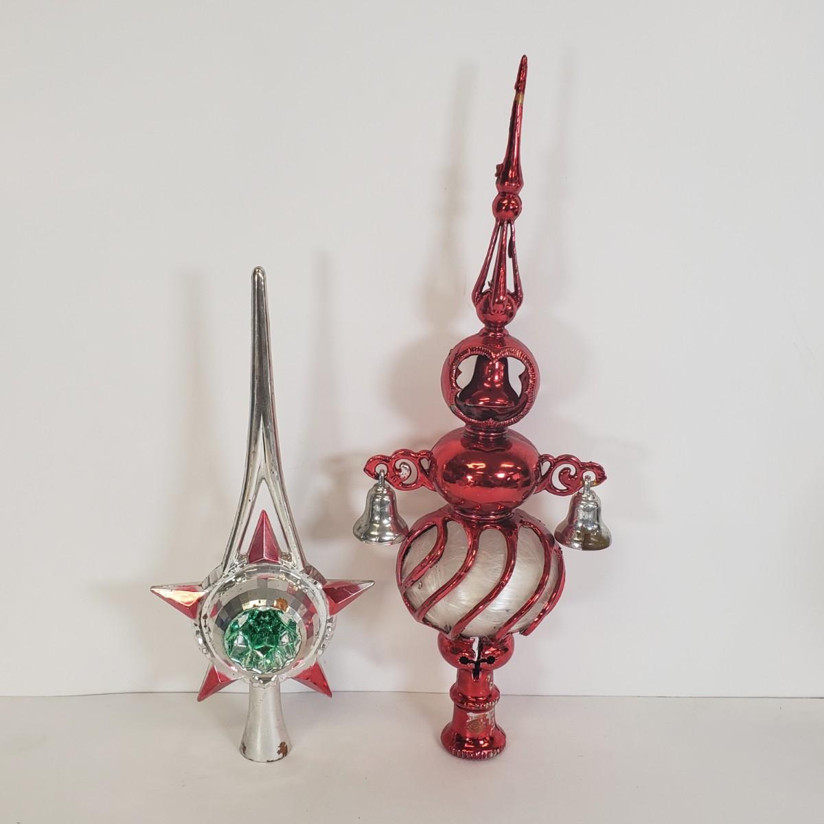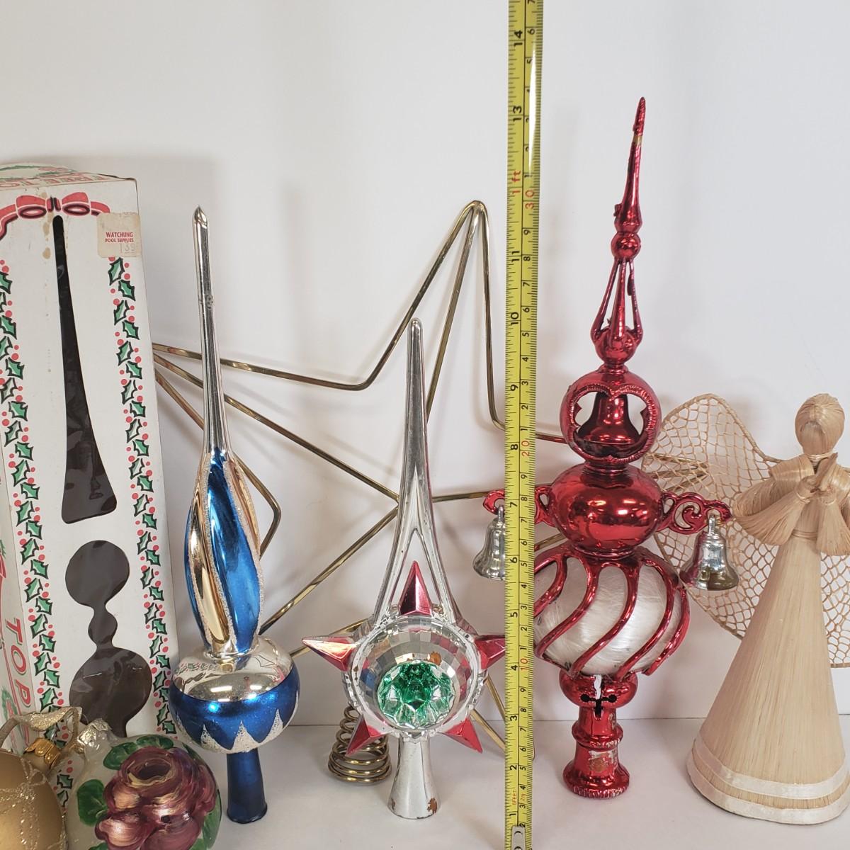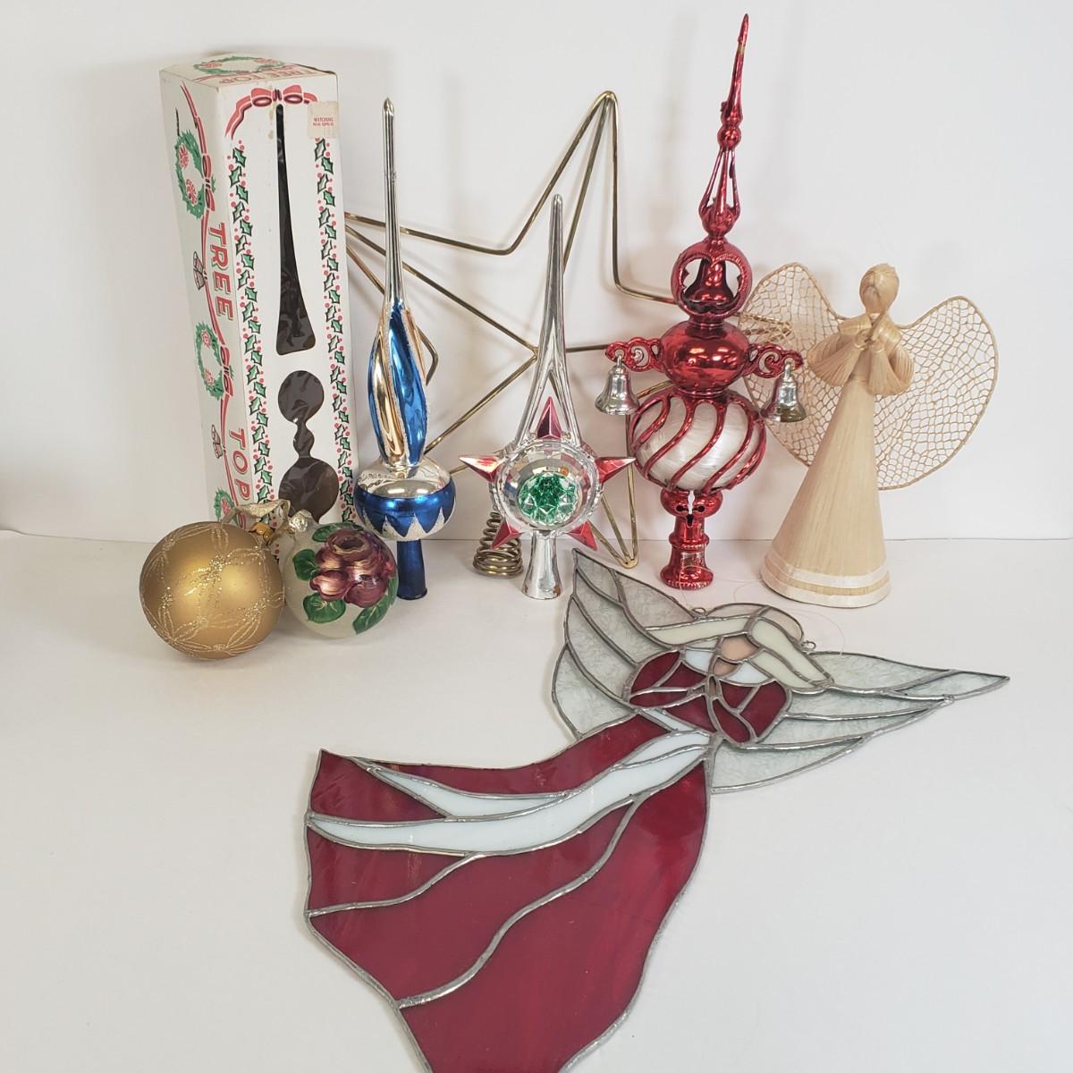 LOT 57: Vintage Christmas Tree Toppers, Large Stained Glass Angel, and Ornaments