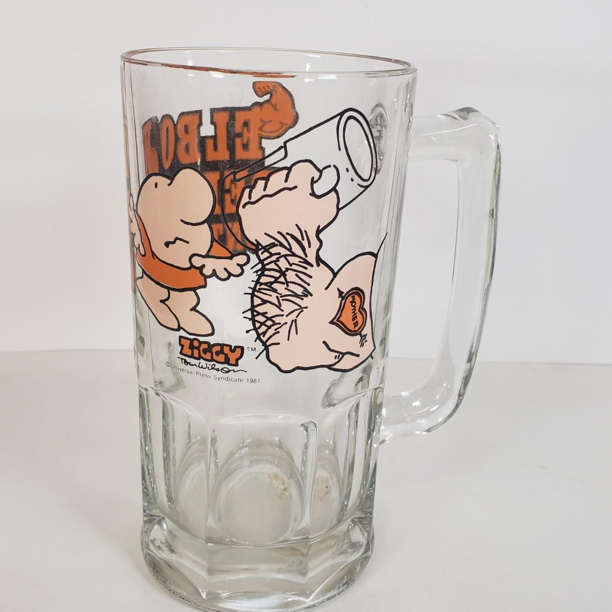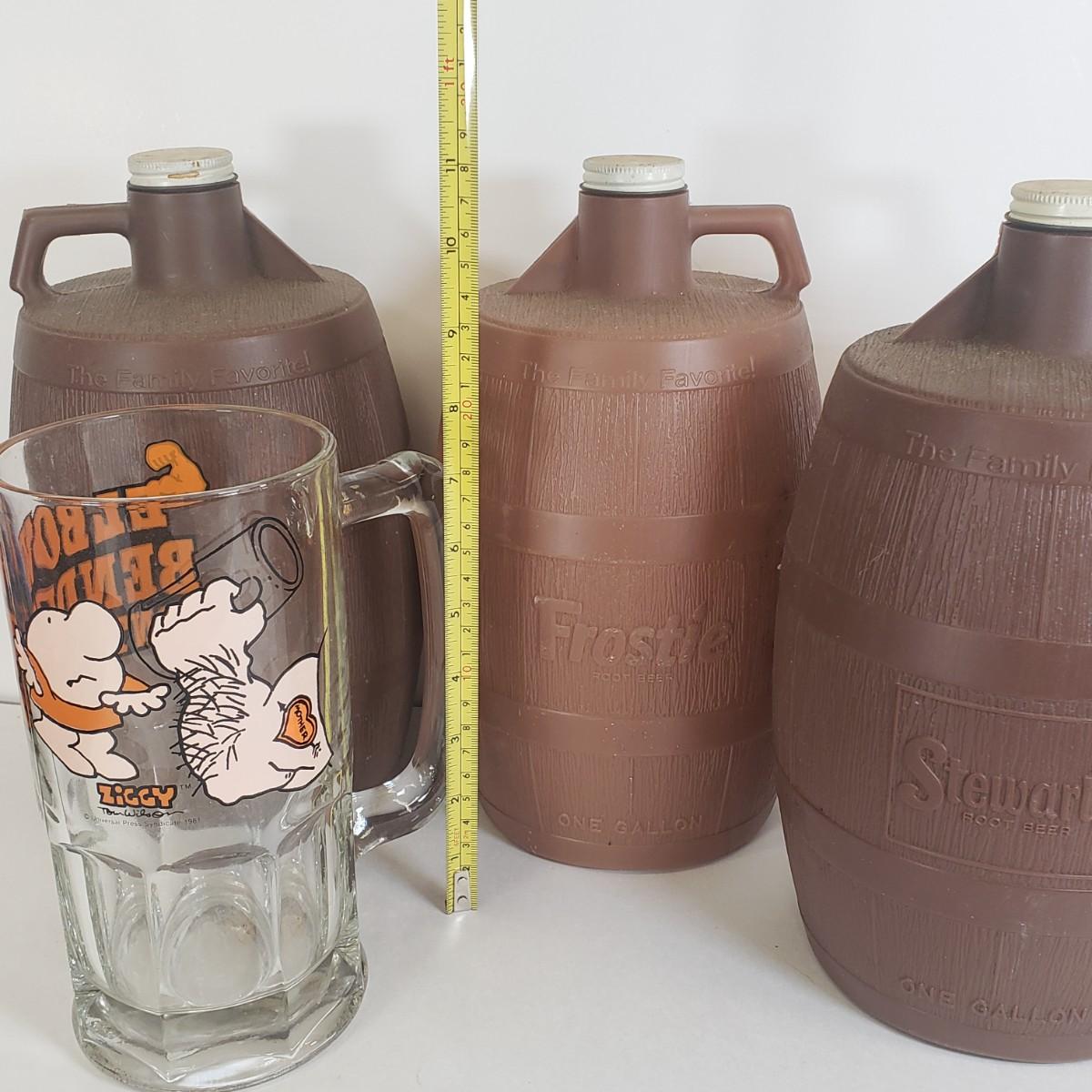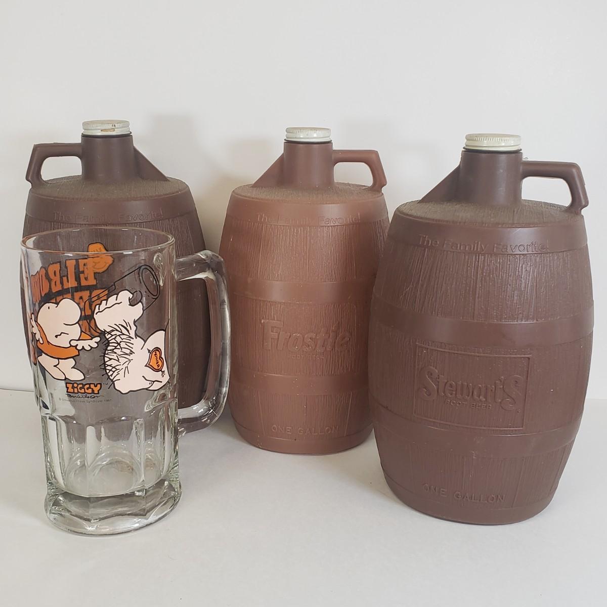 LOT 58: Vintage Frostie & Stewarts Root Beer Barrels with Ziggy Glass Beer Stein