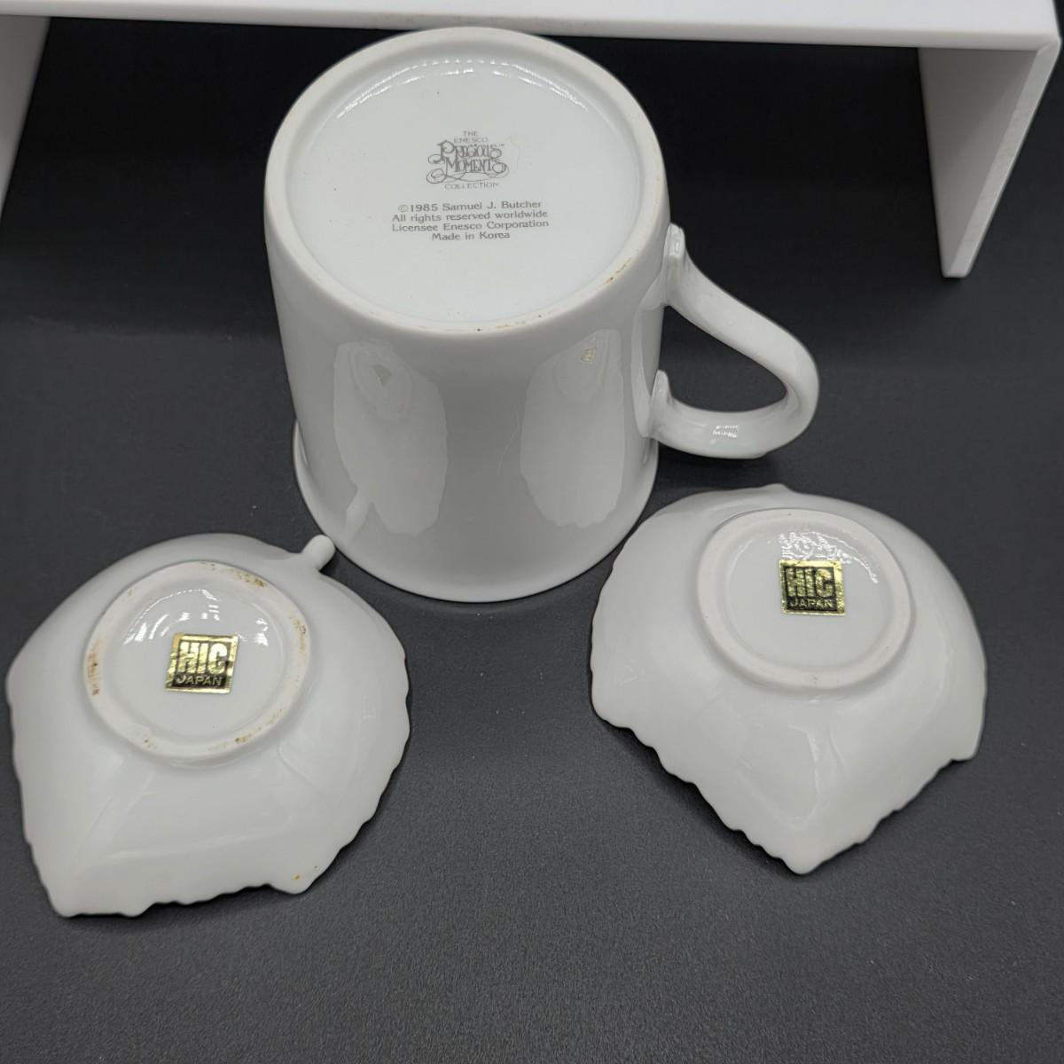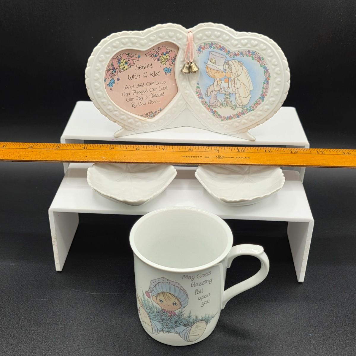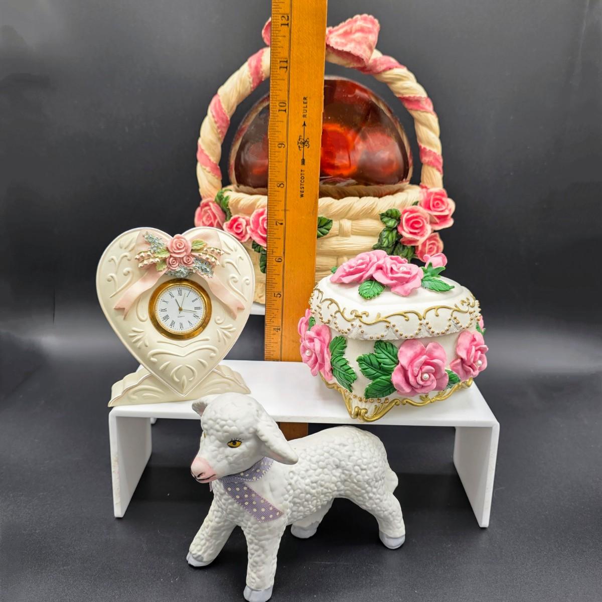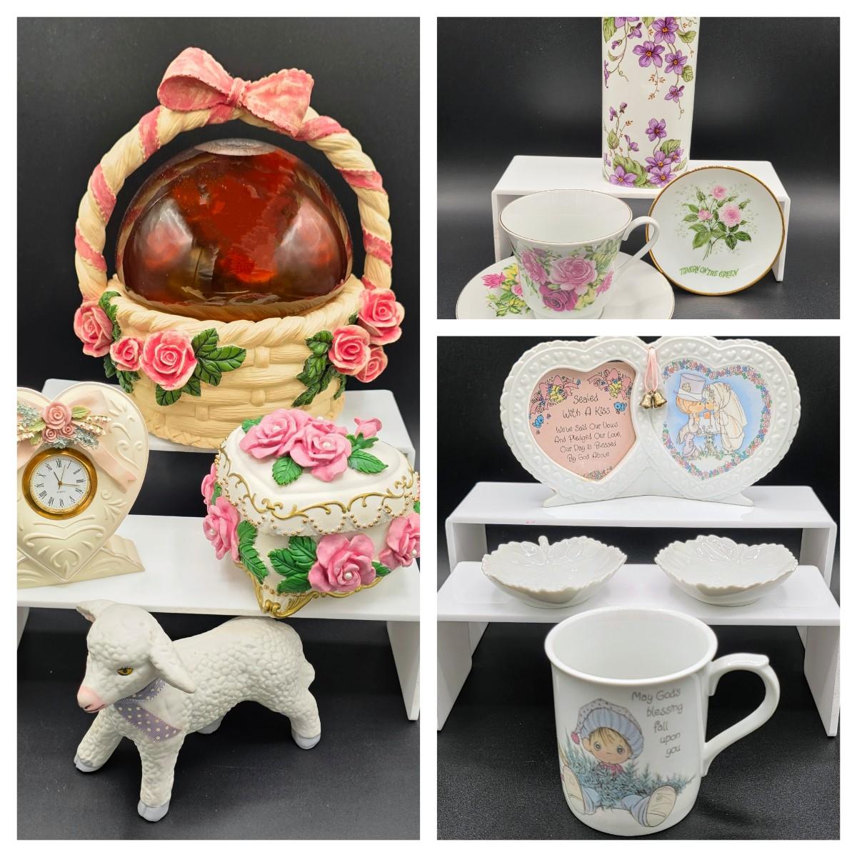 LOT 64: Darling Collection of Vintage Precious Moments, Figurines, Mugs, Lefton Vase, Small Tavern on The Green Porcelain Plate, Heart & Rose Themed Clock, Music Box & More