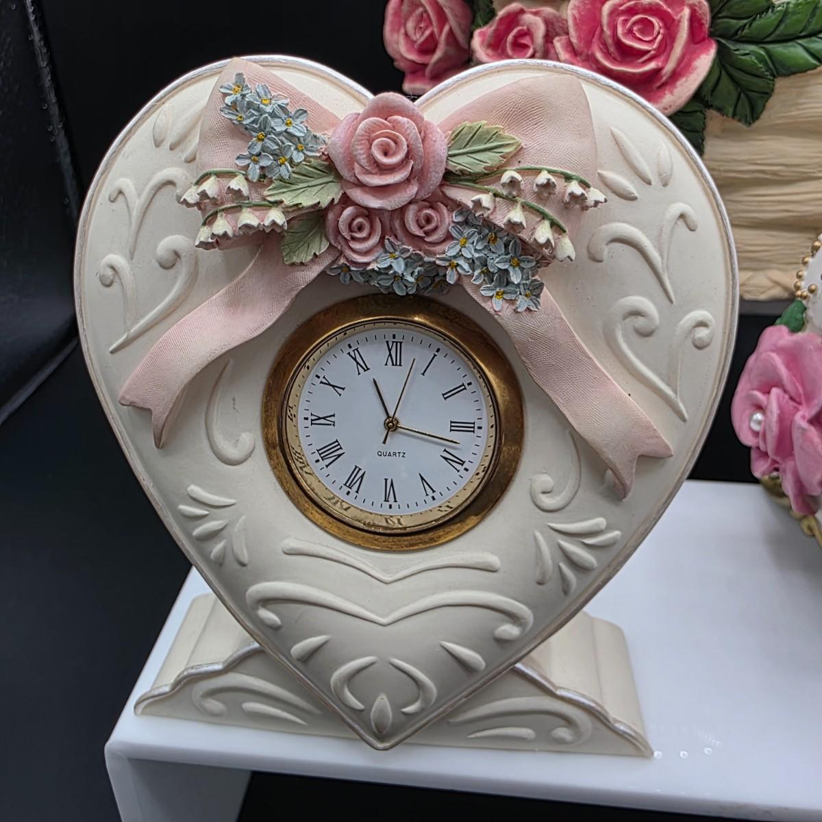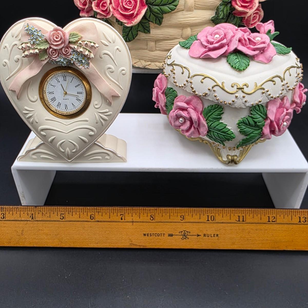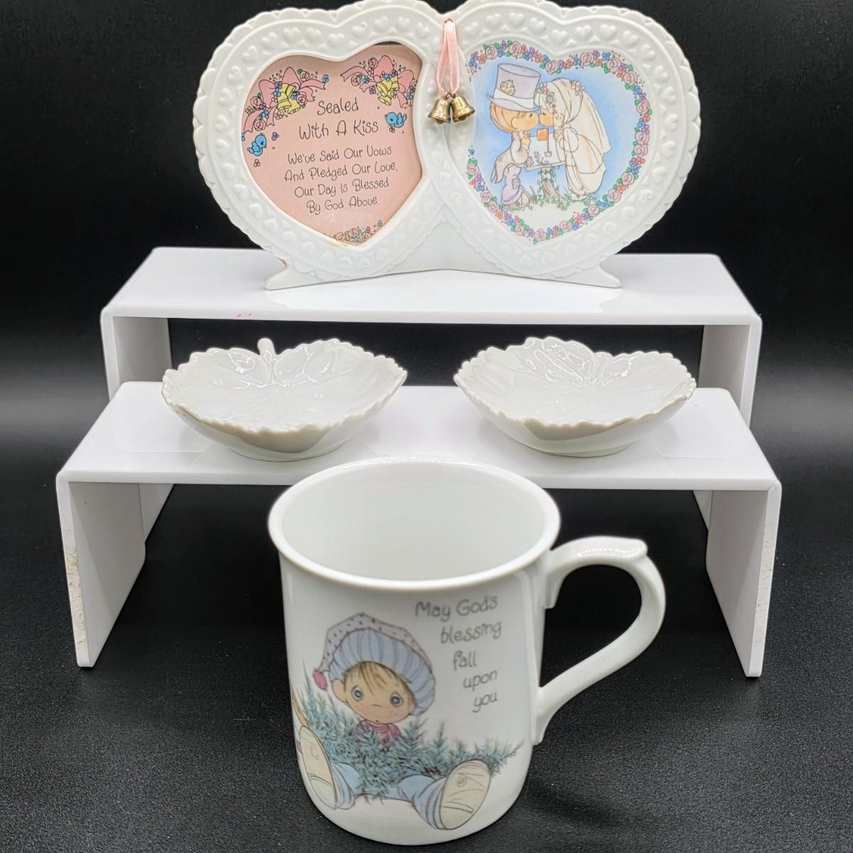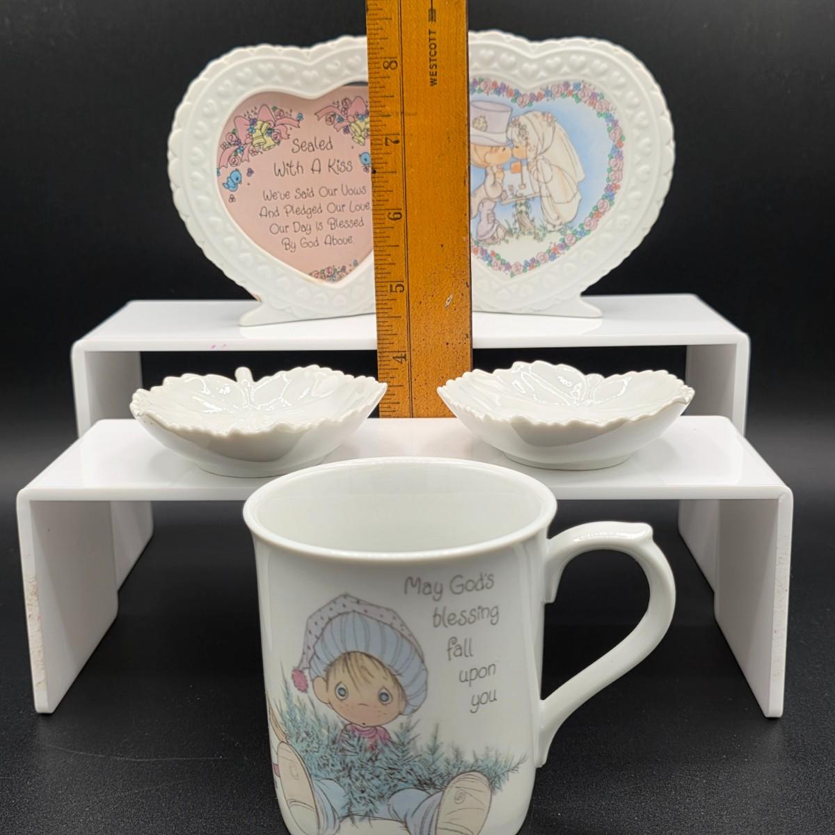 LOT 64: Darling Collection of Vintage Precious Moments, Figurines, Mugs, Lefton Vase, Small Tavern on The Green Porcelain Plate, Heart & Rose Themed Clock, Music Box & More
