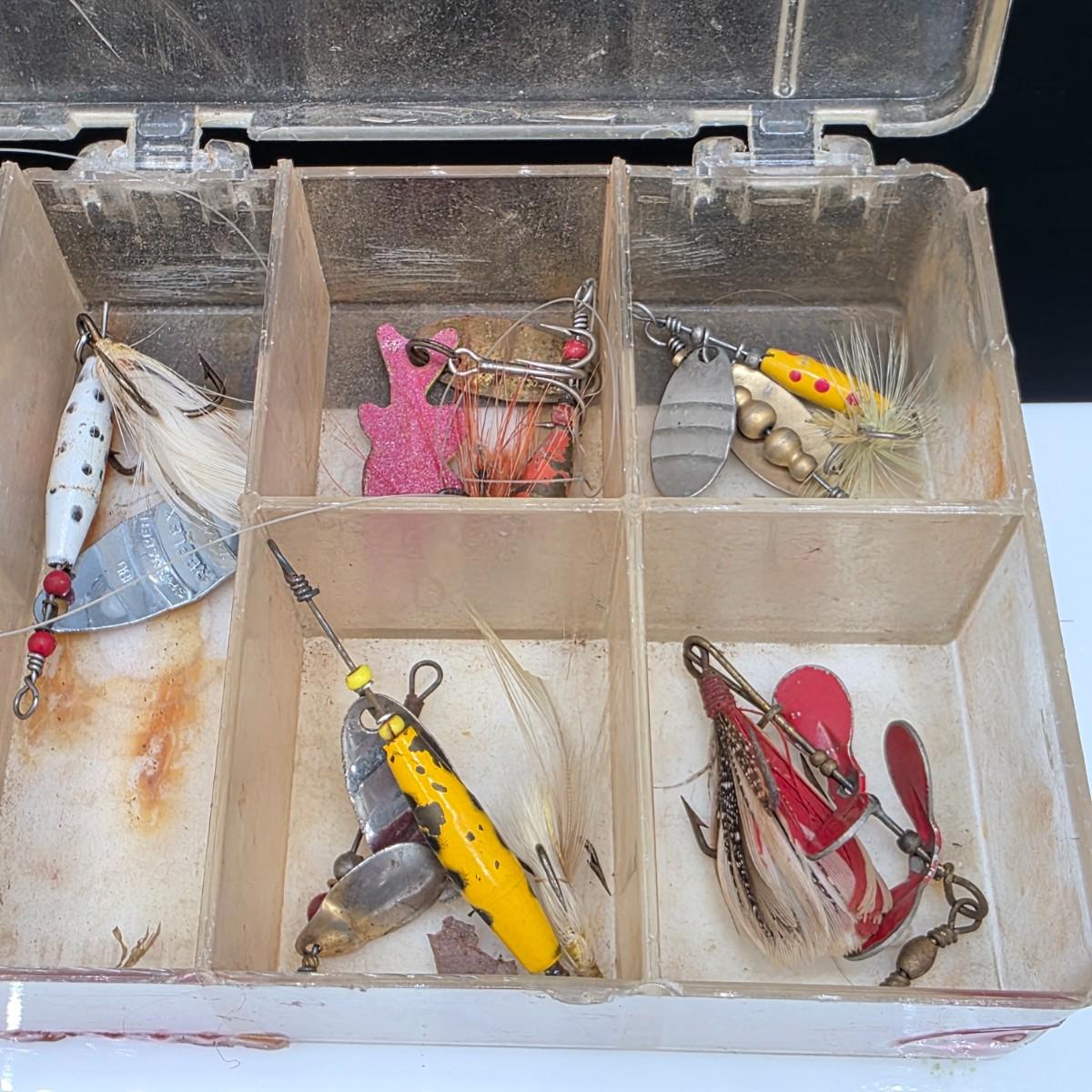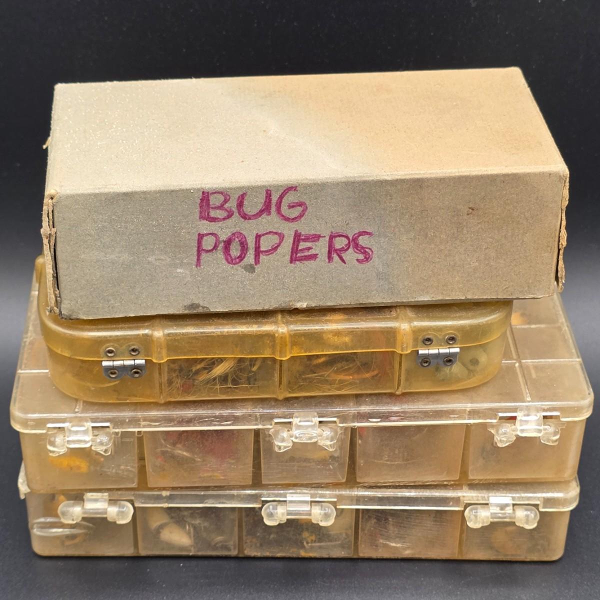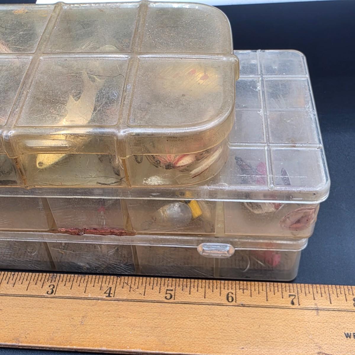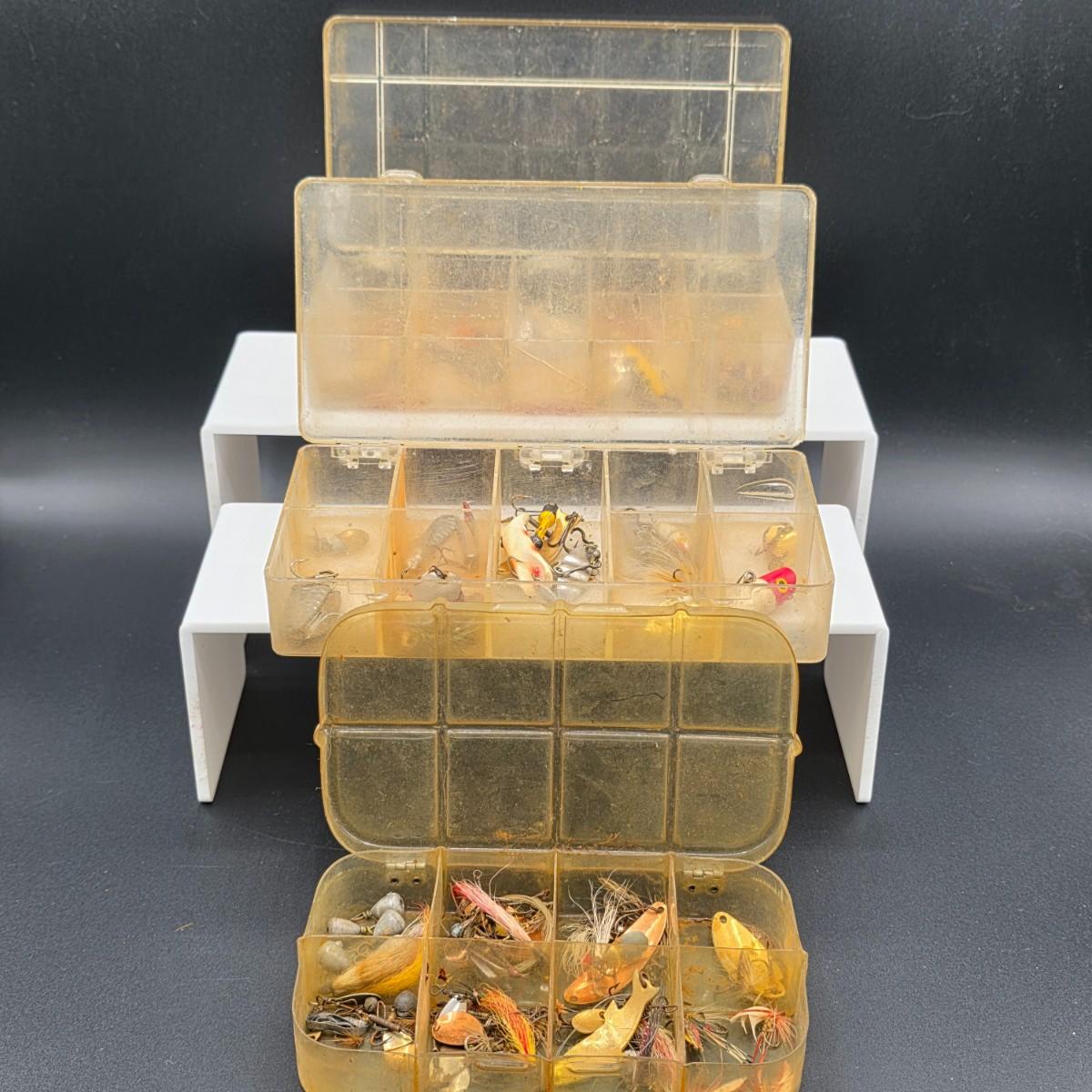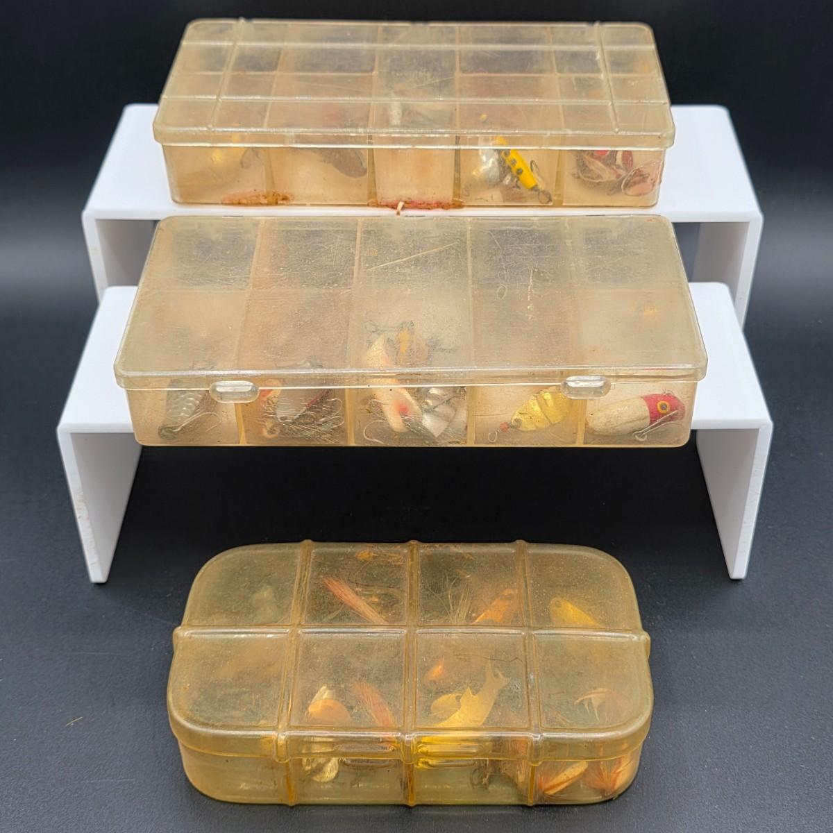 LOT 67: 3 Vintage Plastic Tackle Boxes Containing Assorted Fishing Lures & A Box of Topwater Lures