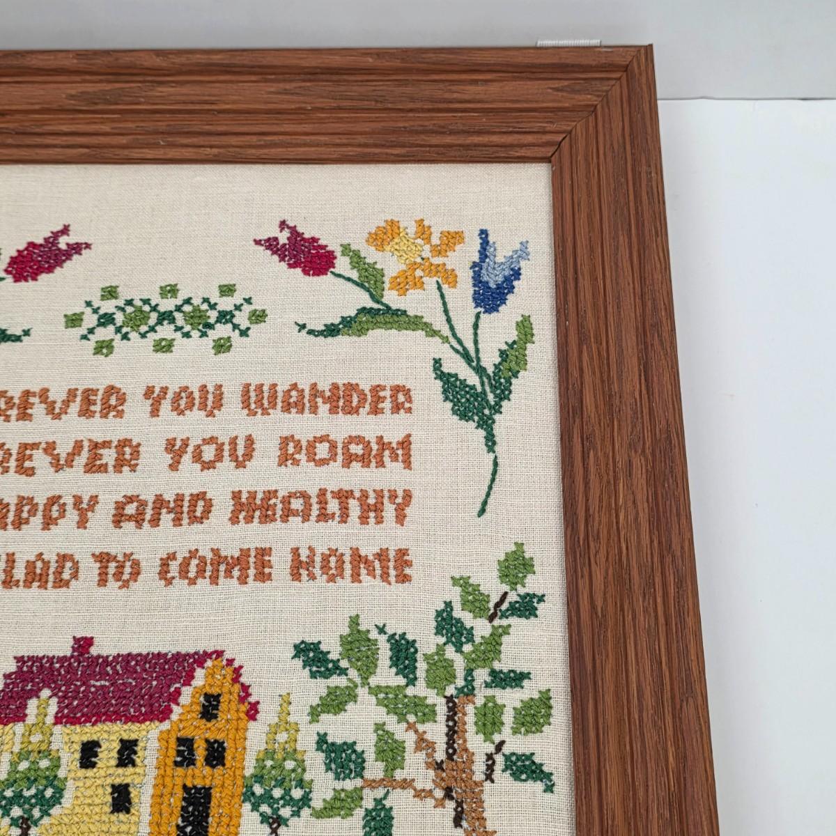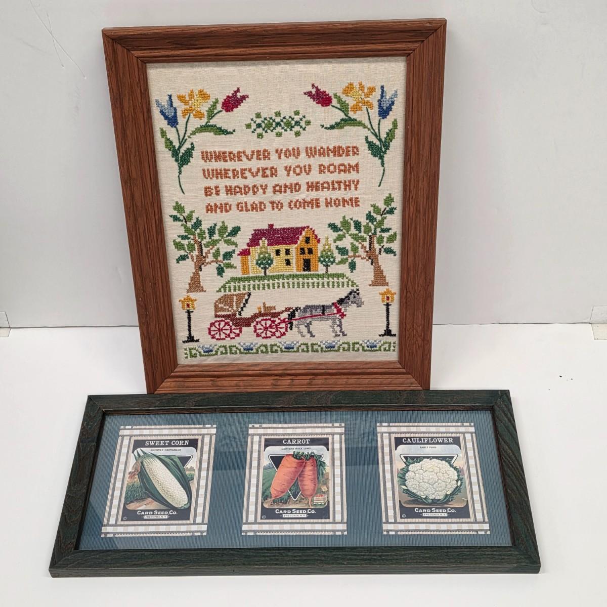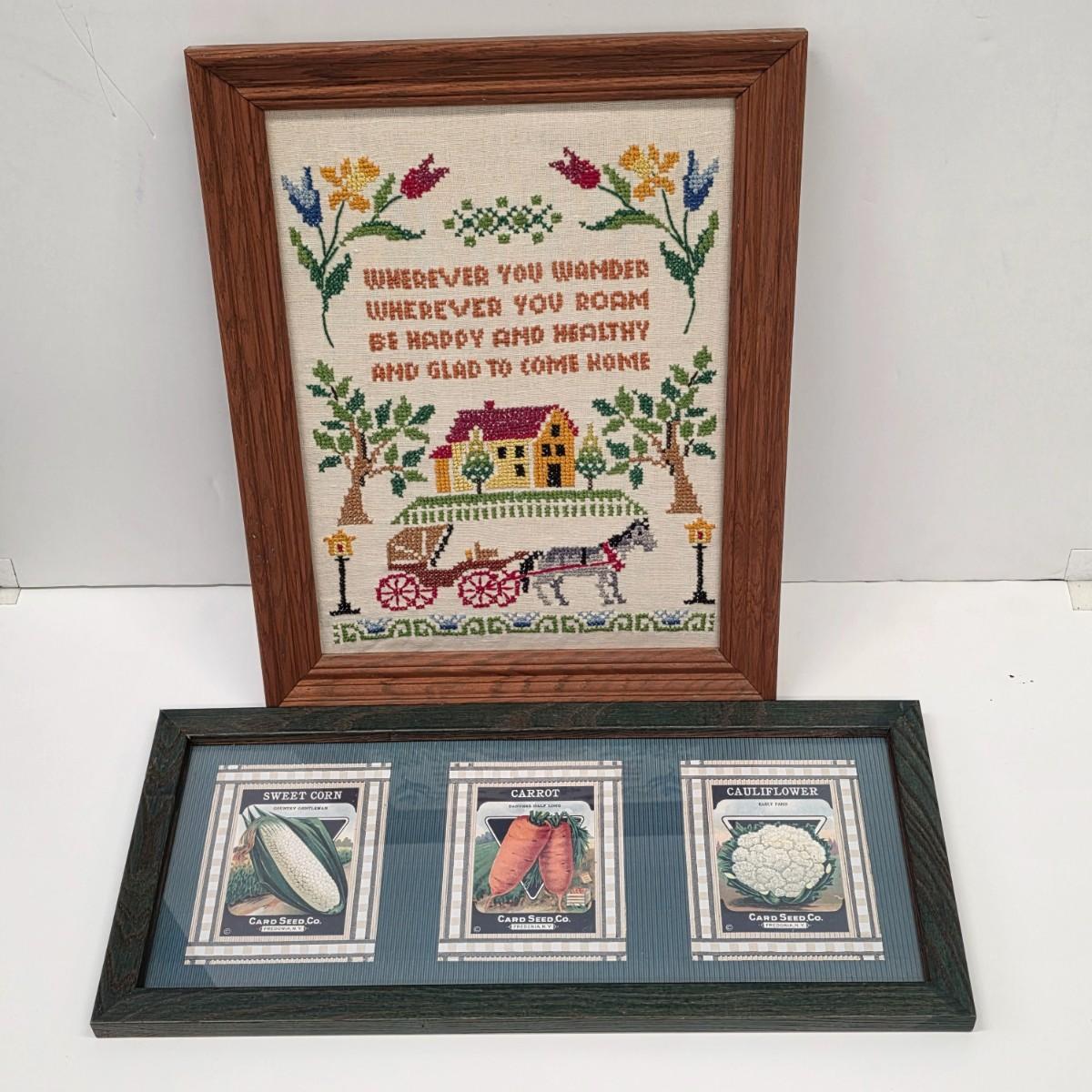 LOT 75: Vintage Cross-Stitch Sampler "Glad to Come Home" With Framed Vegetable Print
