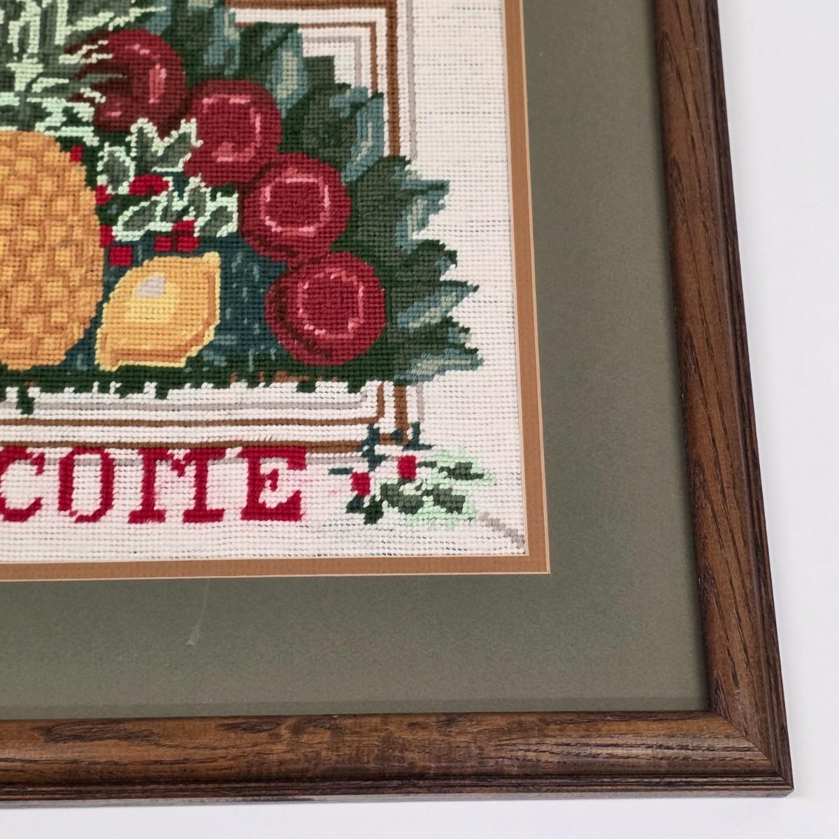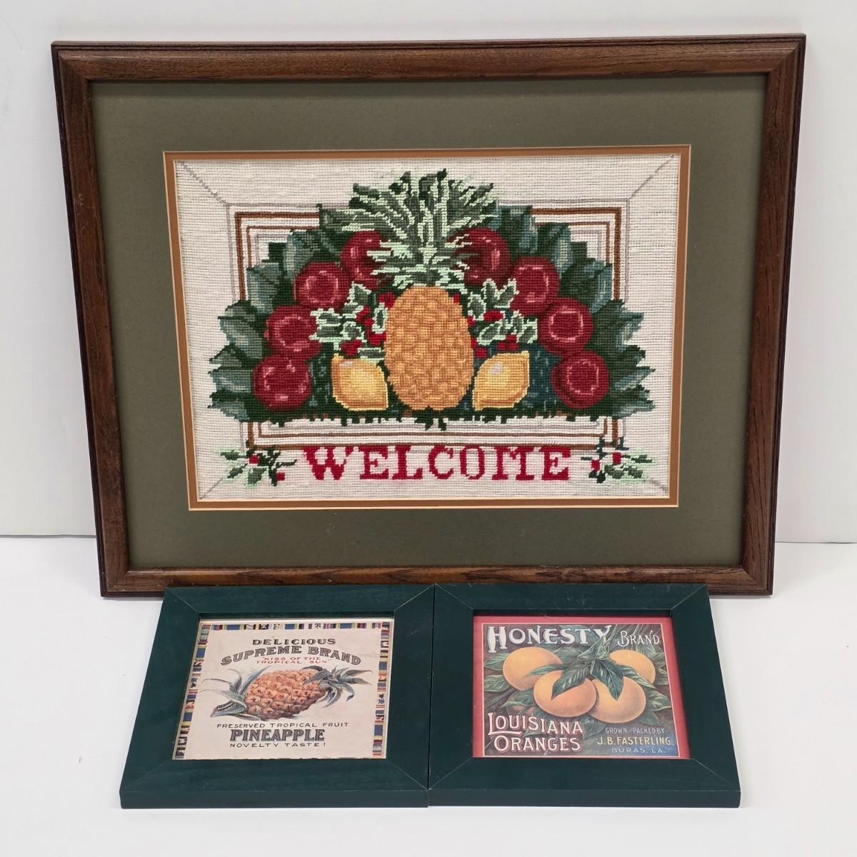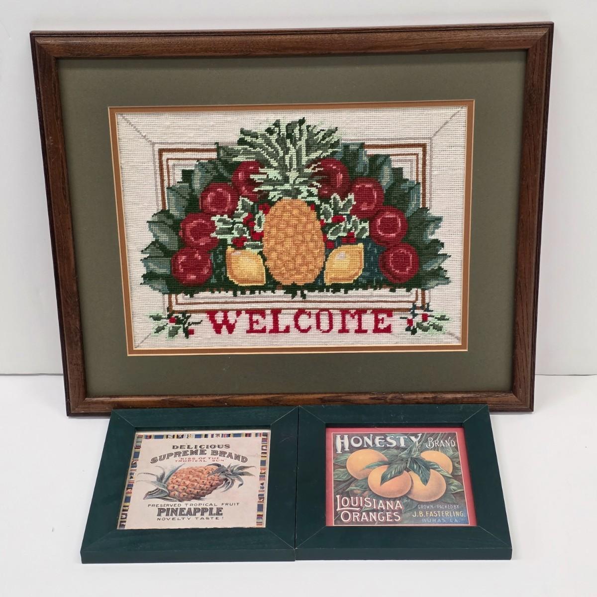 LOT 76: Vintage Williamsburg Needlepoint Framed Needle Treasure With Framed Fruit Prints