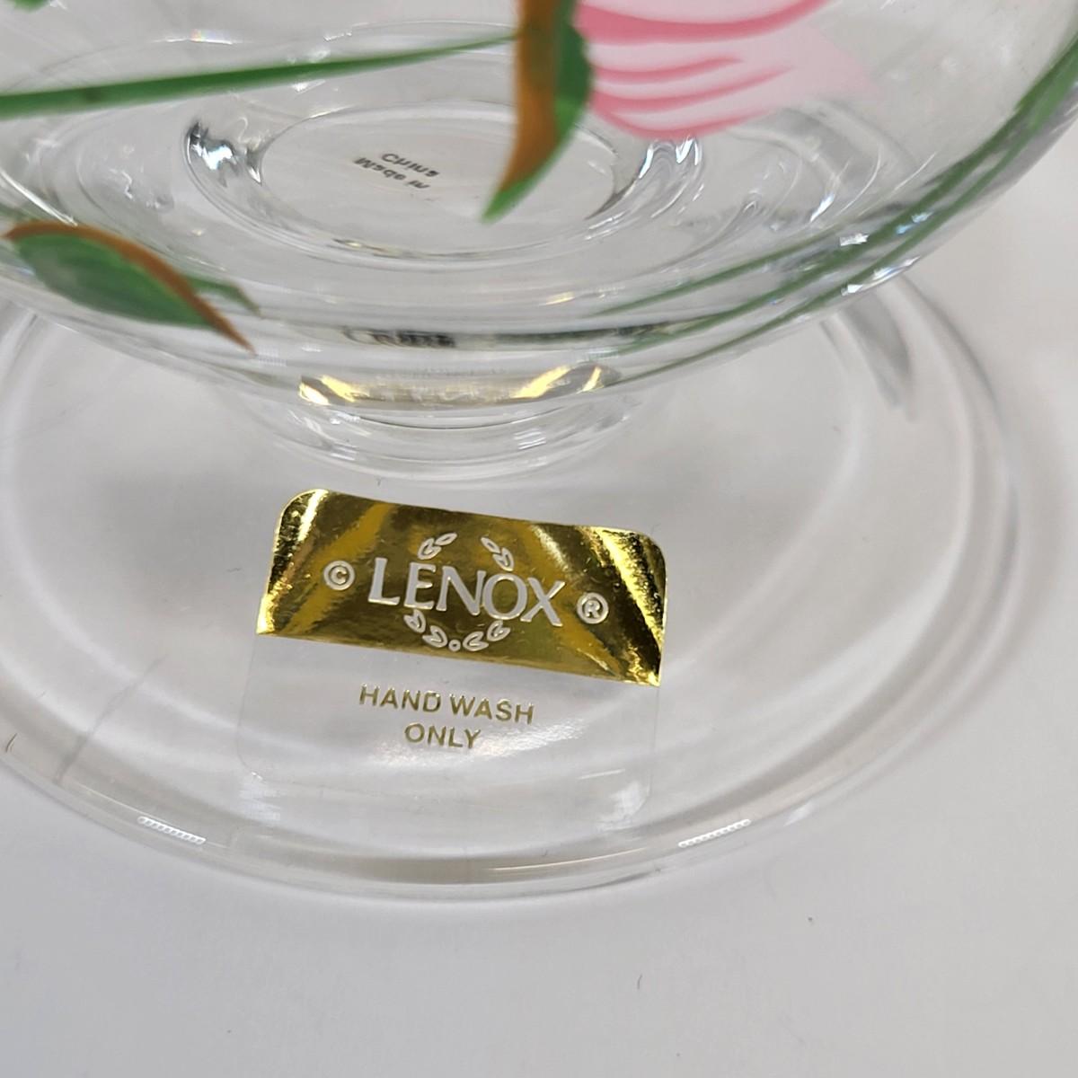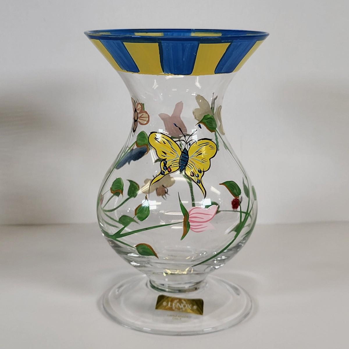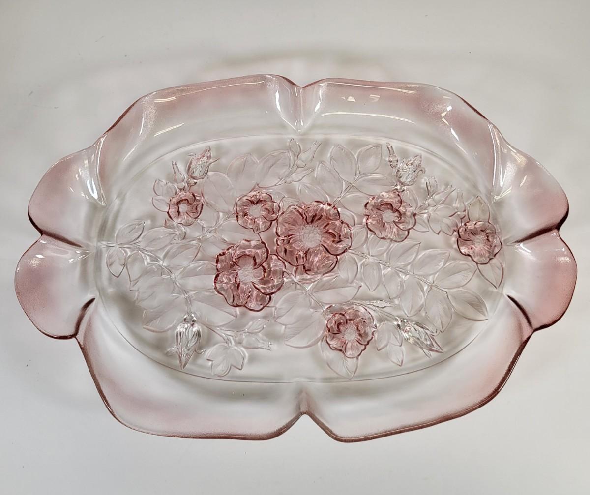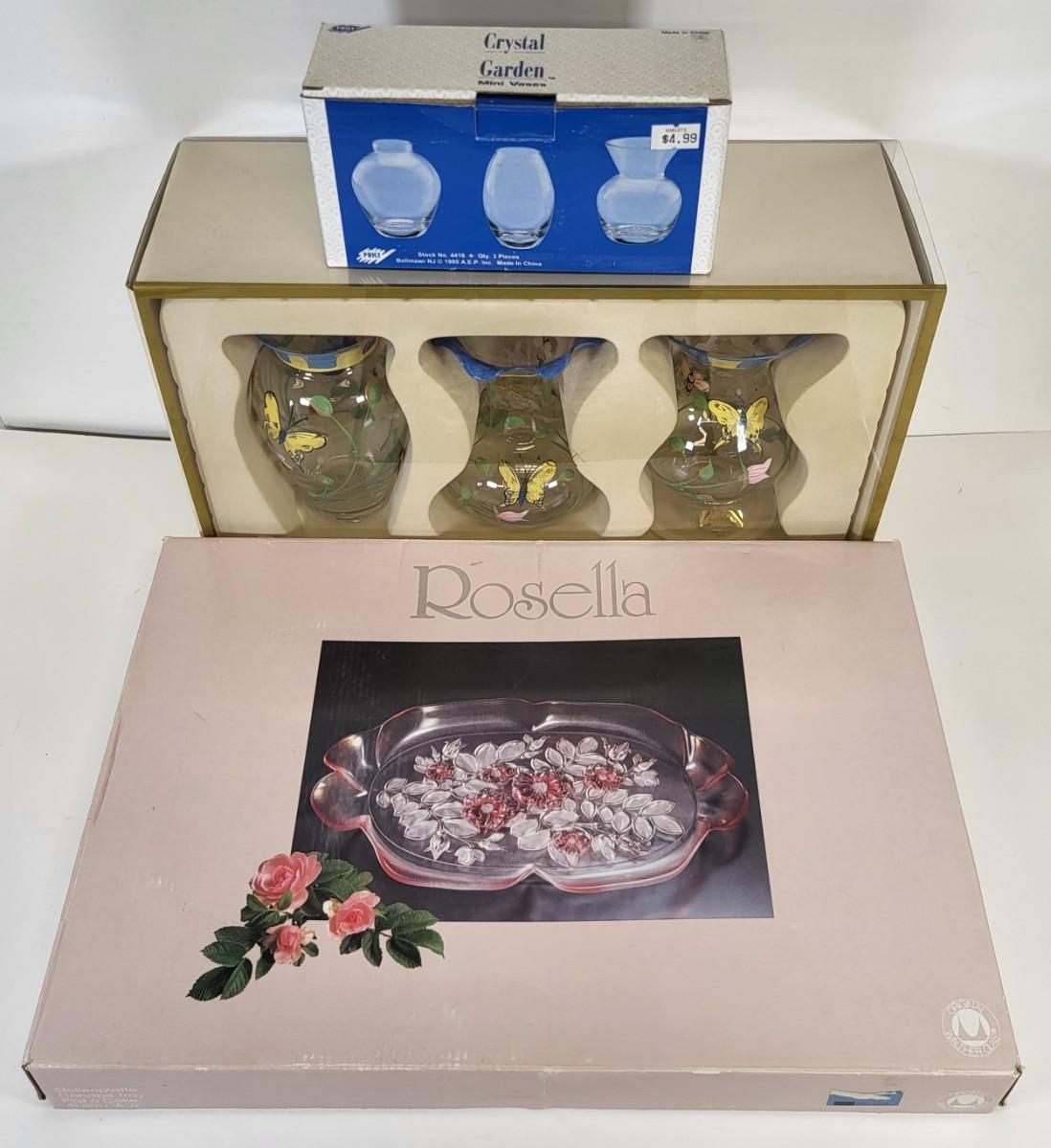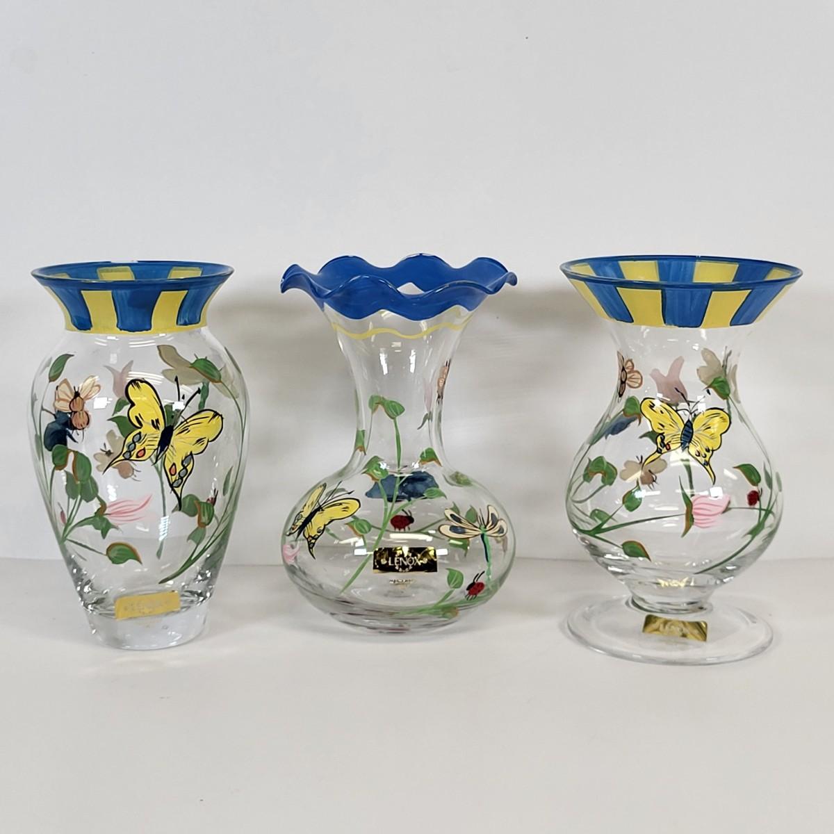 LOT 86: Pink Flowered Cake Tray with Three Lenox Hand Painted Vases and Three Assorted Hand Blown Vases