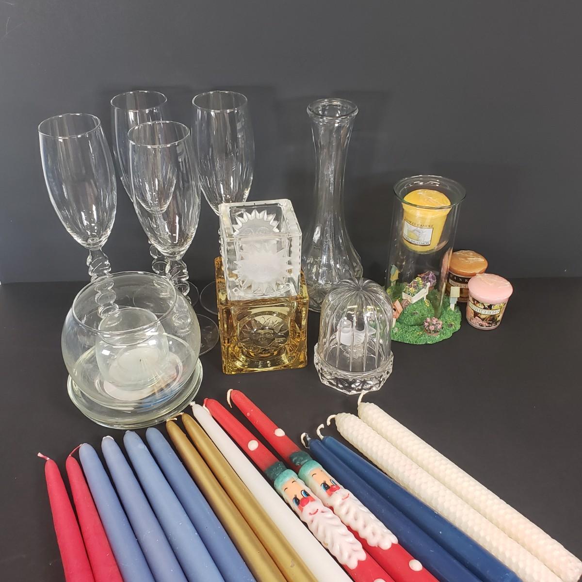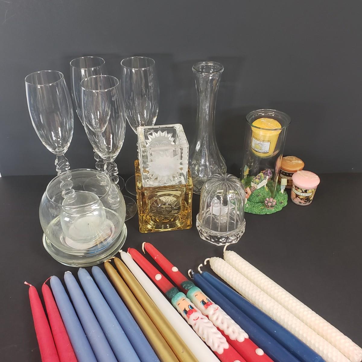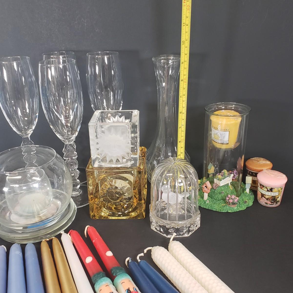 LOT 105: Assorted Decor; Celestial Candle Holders, West German Crystal Bird in Cage, Many Candles & More