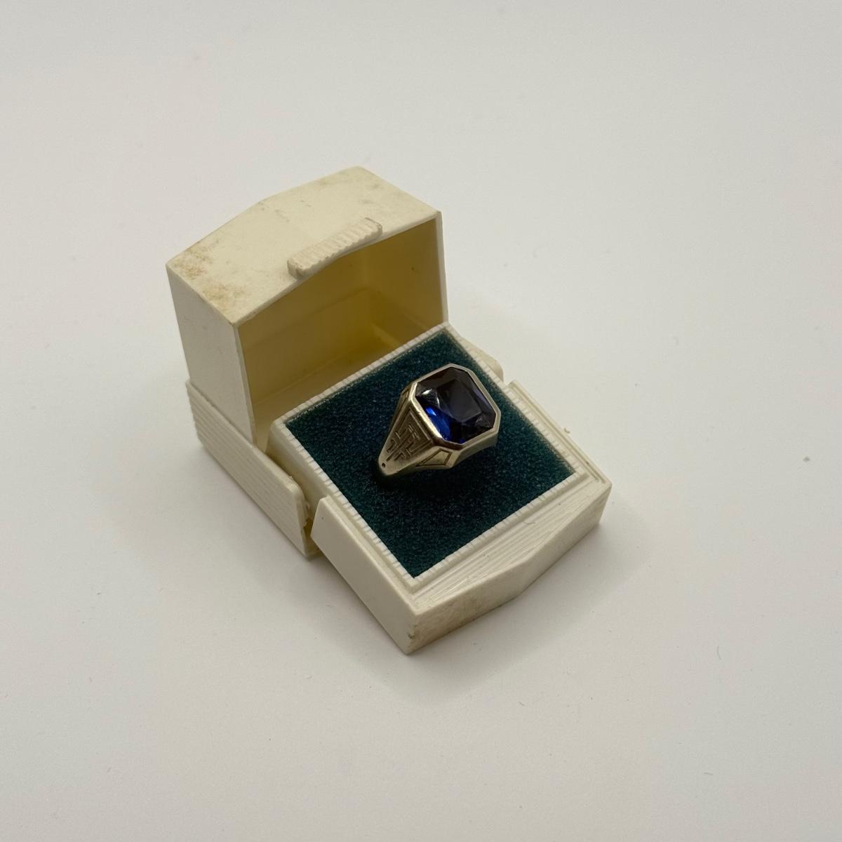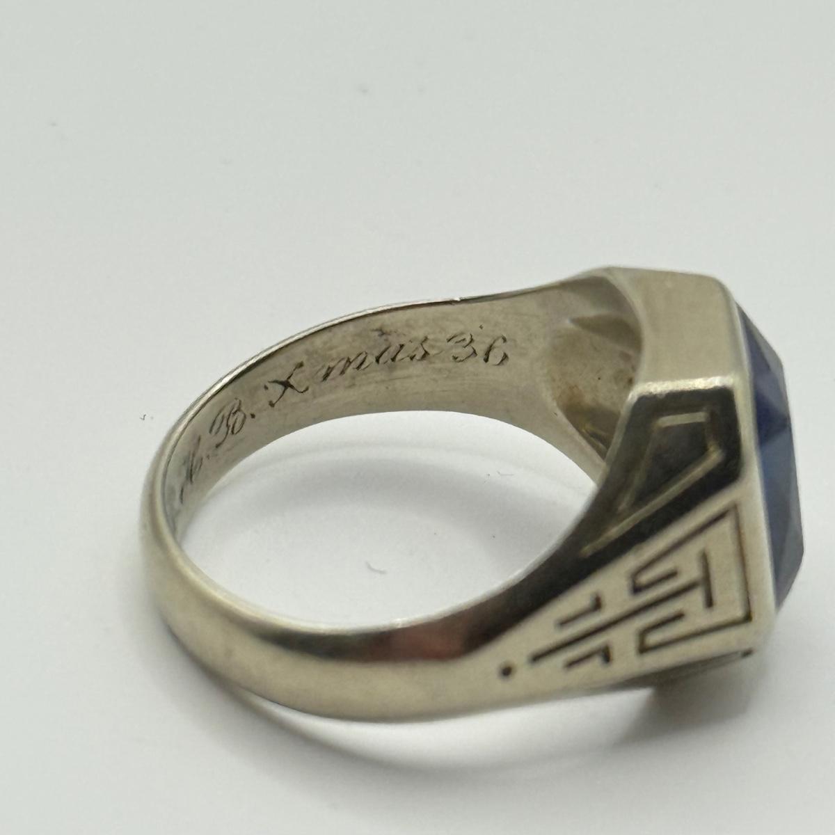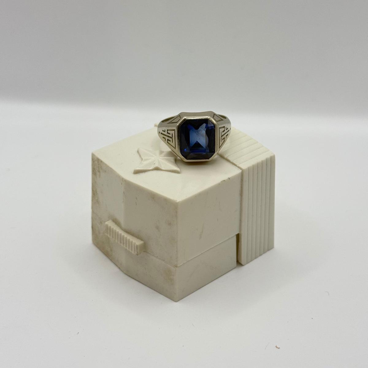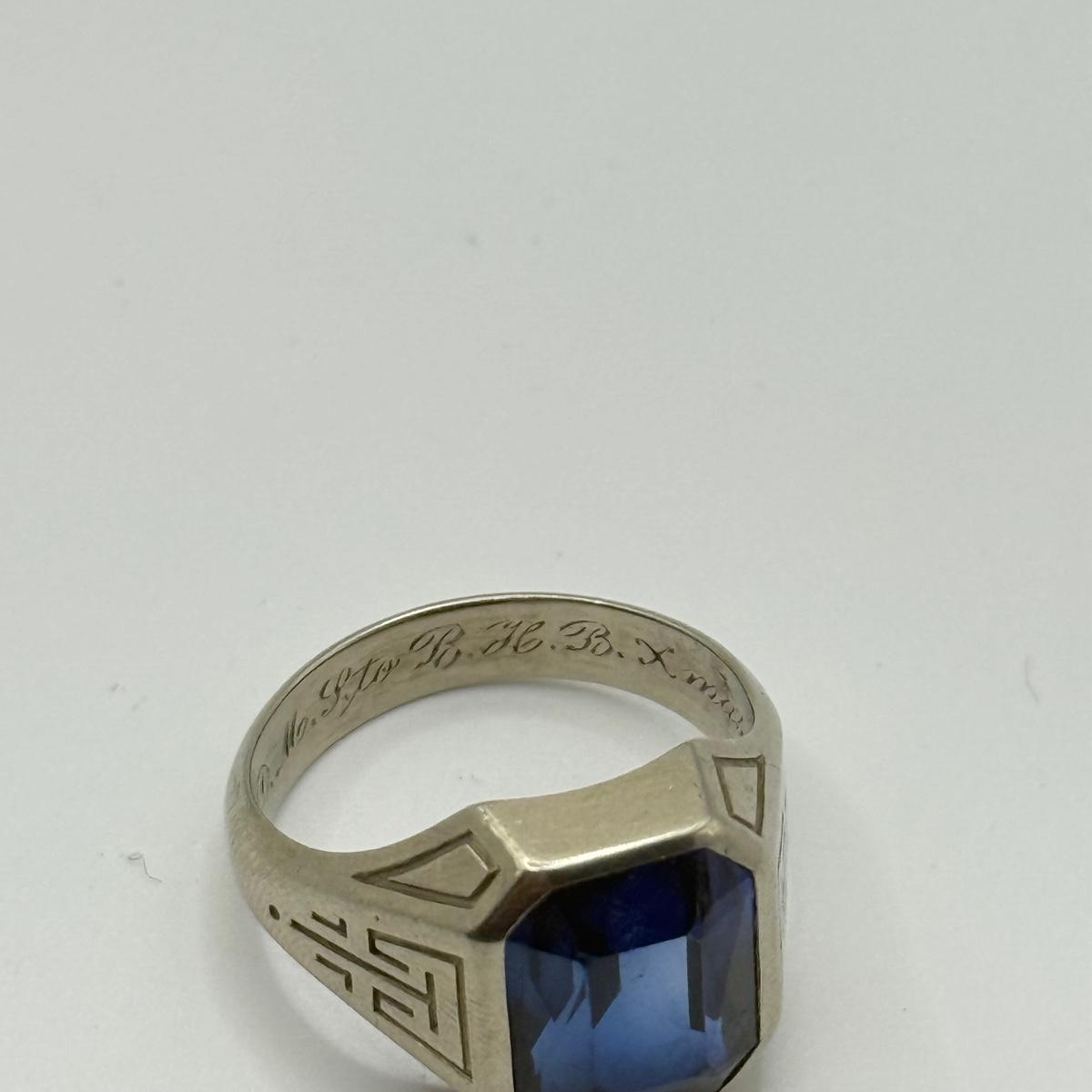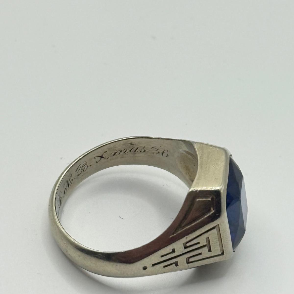 LOT 141: 14k White Gold Vintage Mens Ring w/ Blue Gemstone & Engraved Sides Size 8.5 w/ Vintage Ring Box (9.7gtw)