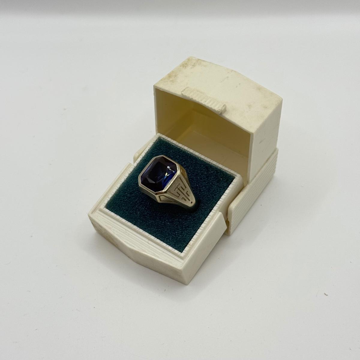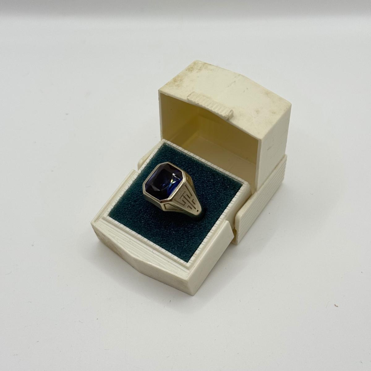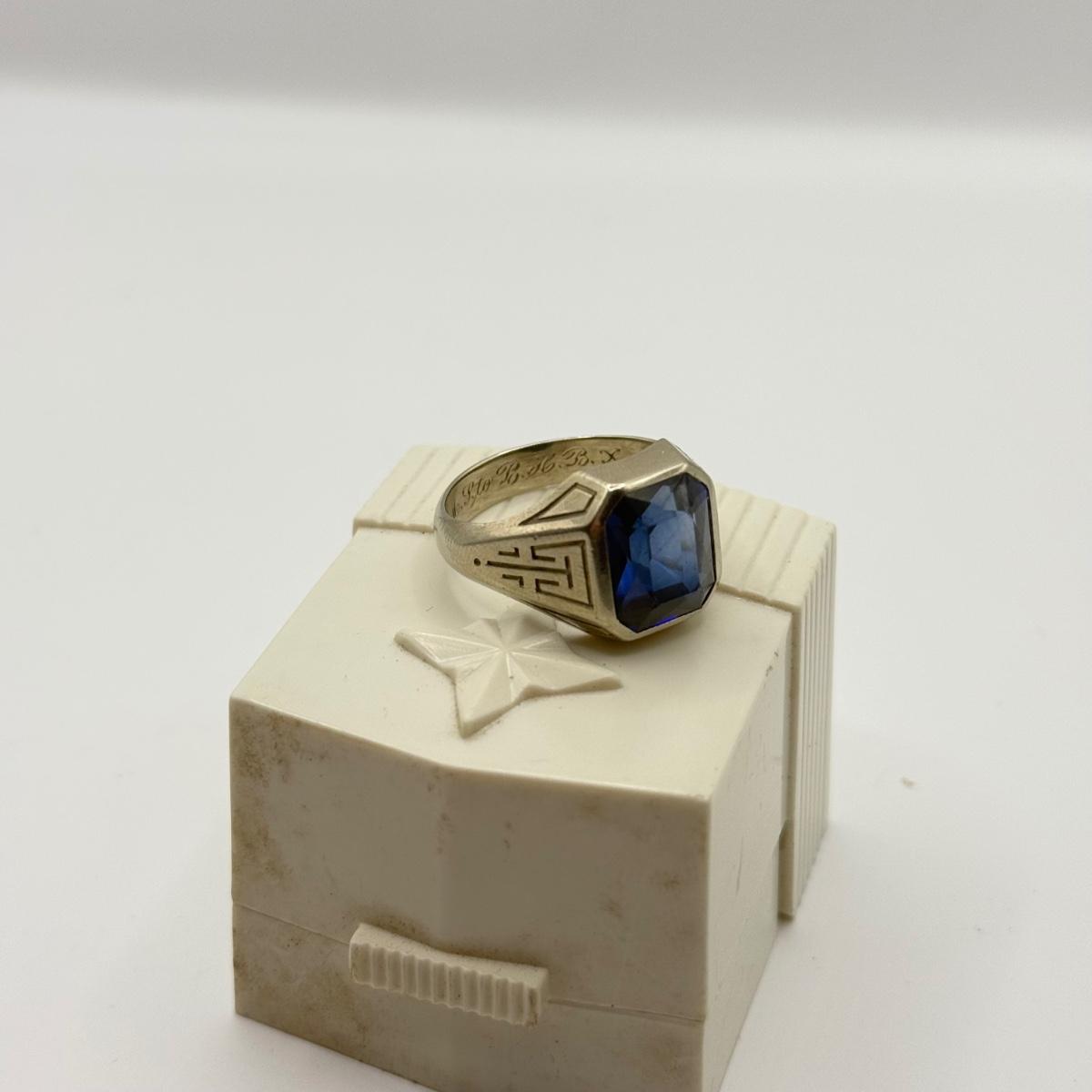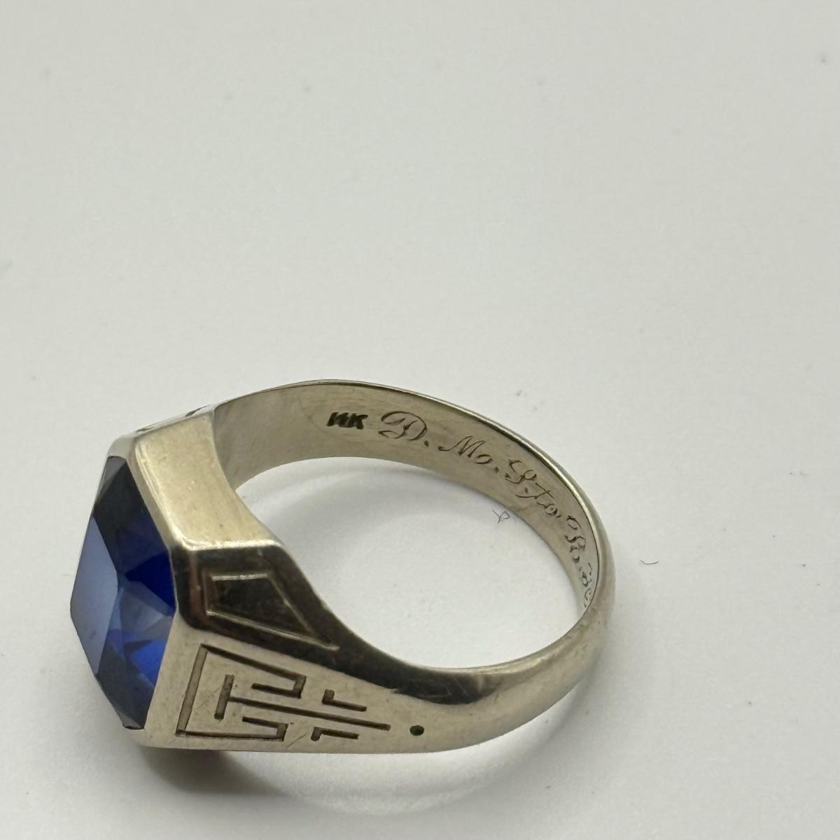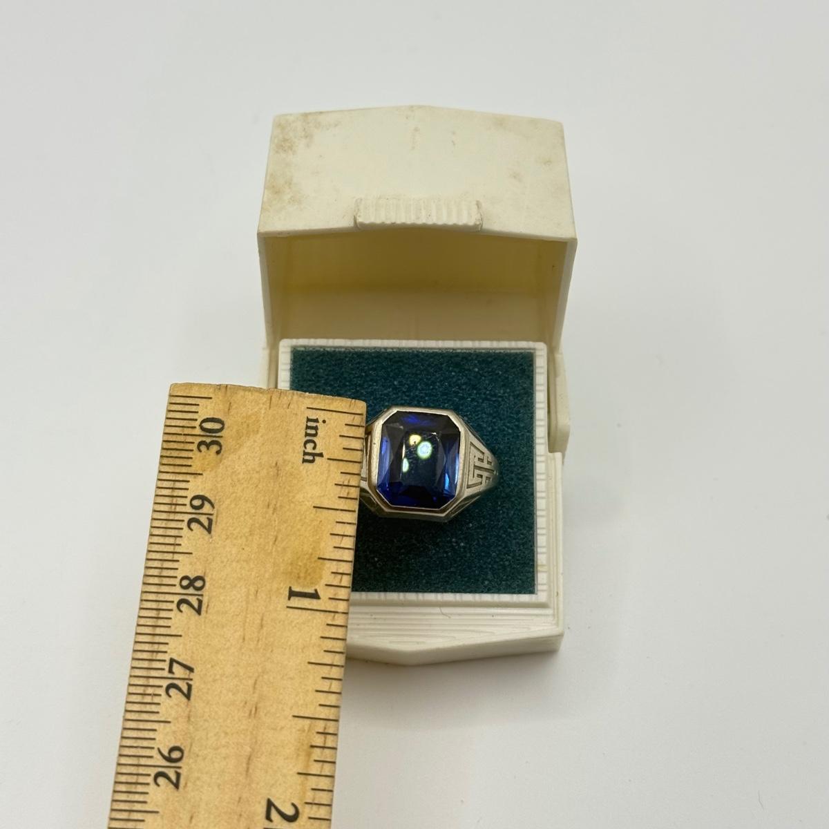 LOT 141: 14k White Gold Vintage Mens Ring w/ Blue Gemstone & Engraved Sides Size 8.5 w/ Vintage Ring Box (9.7gtw)