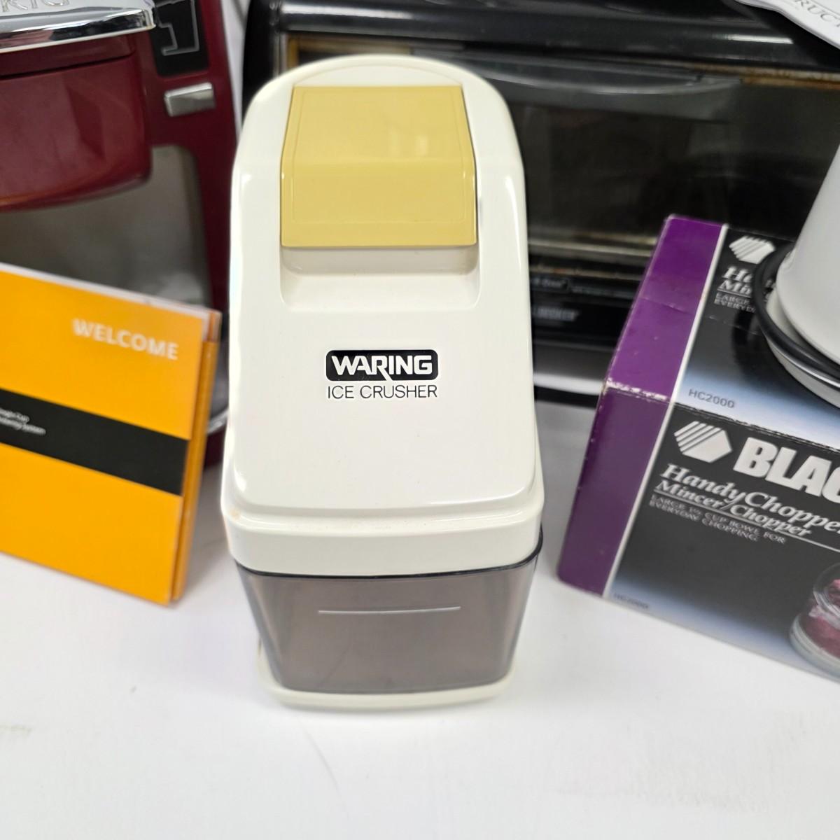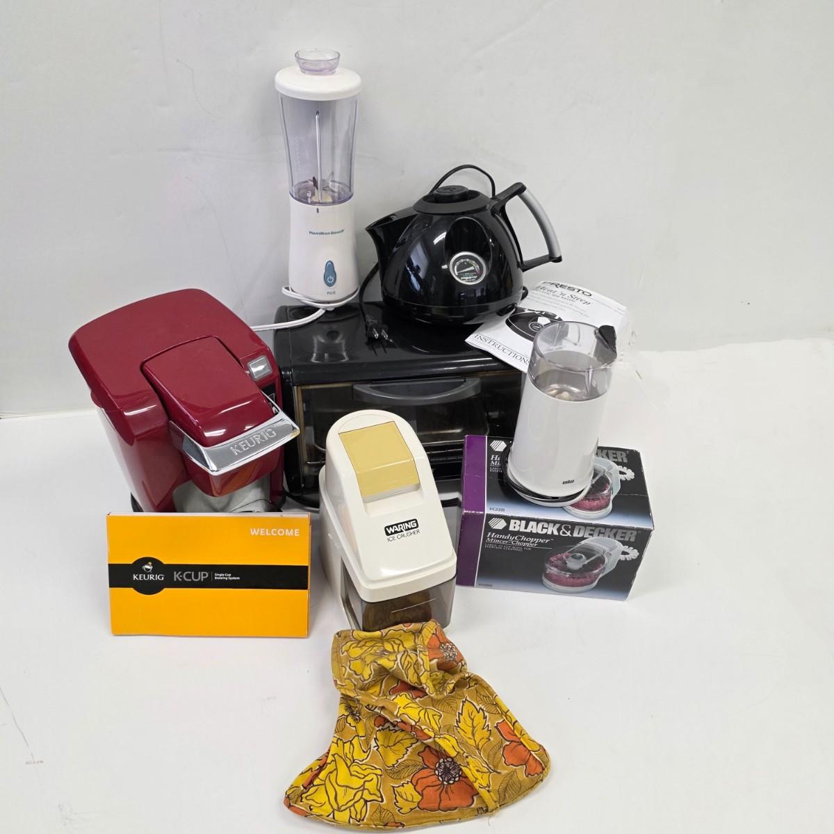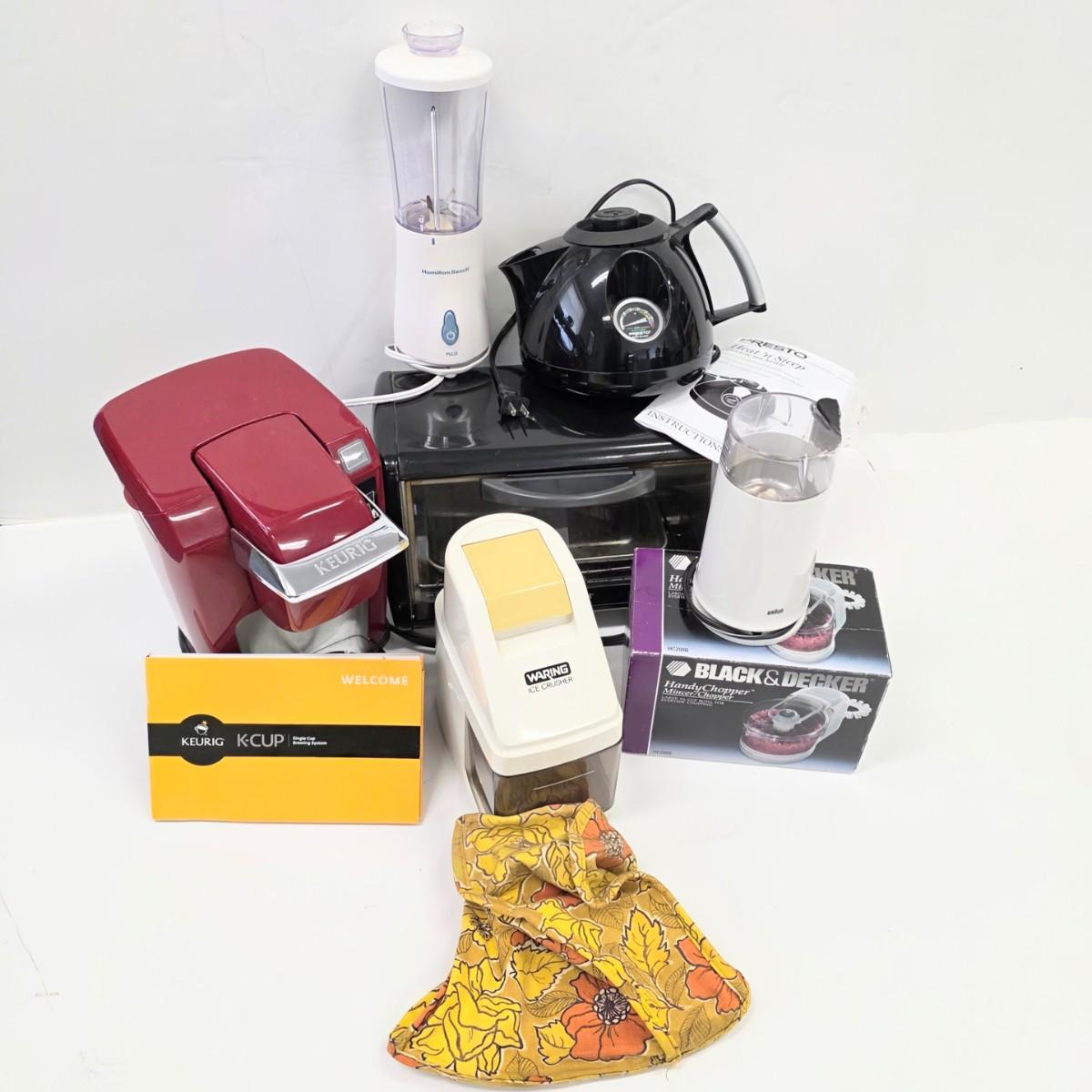 LOT 164: Kitchen Essential Collection, Includes Vintage Electric Waring Pro Ice Crusher W/ Groovy Cozy, Keurig KCup Machine, Electric Teapot, Toaster Oven, Food Choppers & Blenders