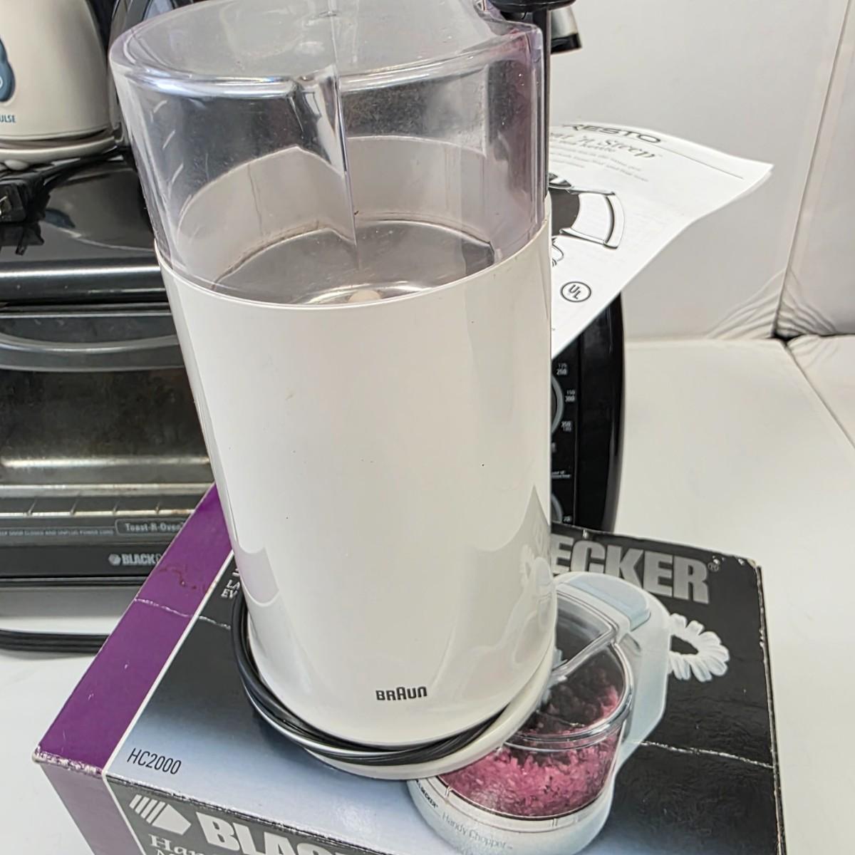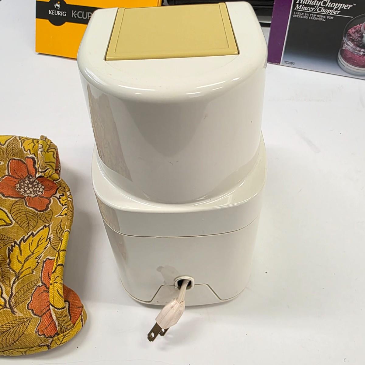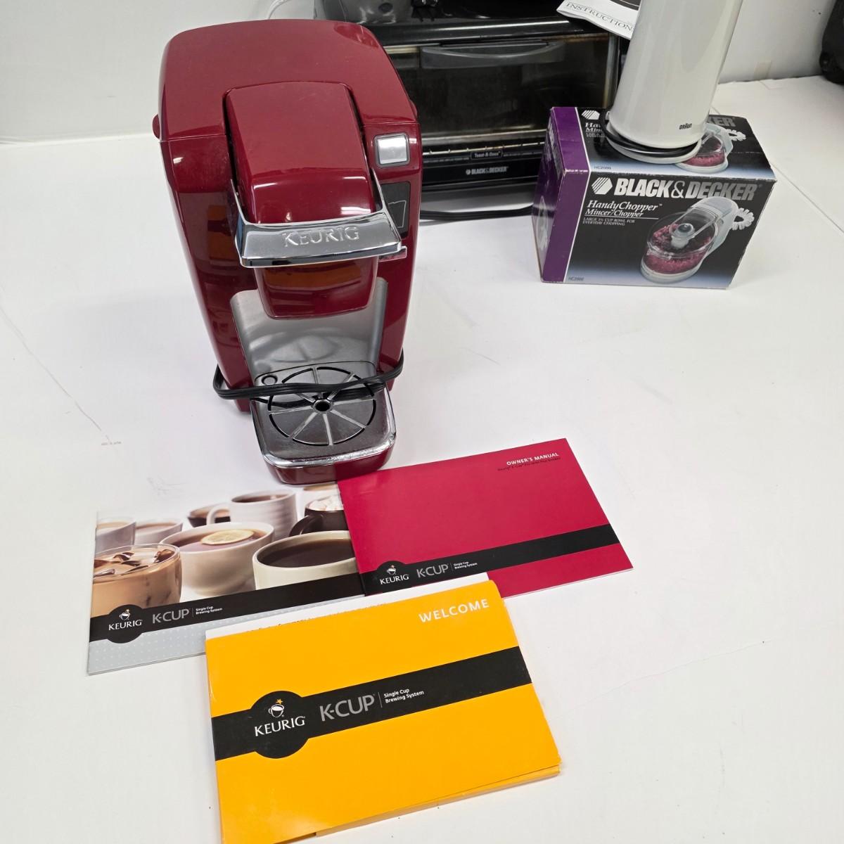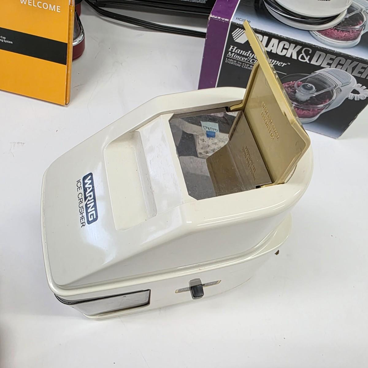 LOT 164: Kitchen Essential Collection, Includes Vintage Electric Waring Pro Ice Crusher W/ Groovy Cozy, Keurig KCup Machine, Electric Teapot, Toaster Oven, Food Choppers & Blenders