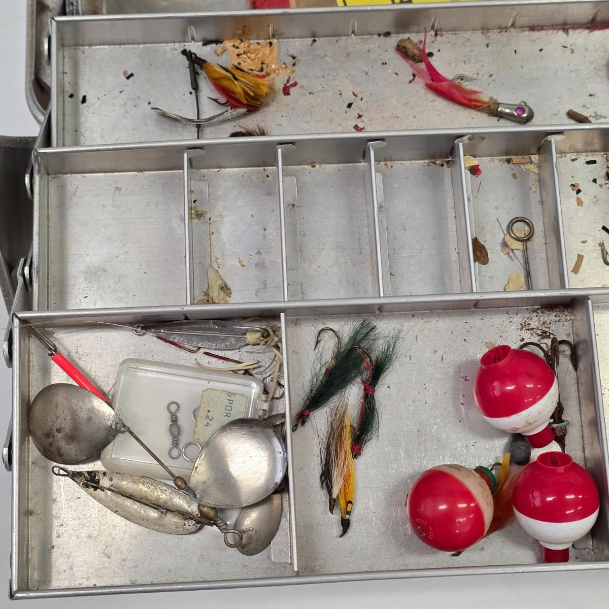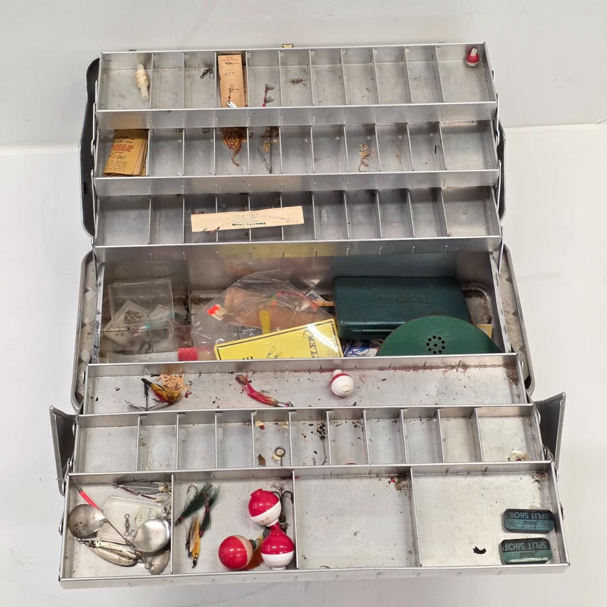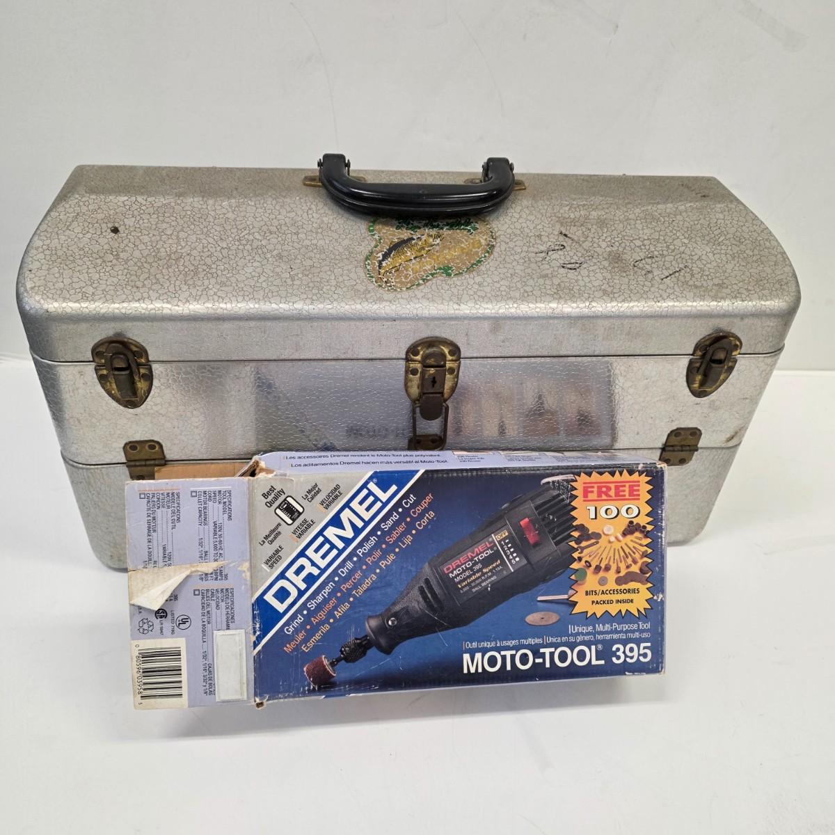 LOT 165: Vintage Dremel Variable Speed Rotary Tool W/Metal Tackle Box Containing Fishing Lures/Accessories