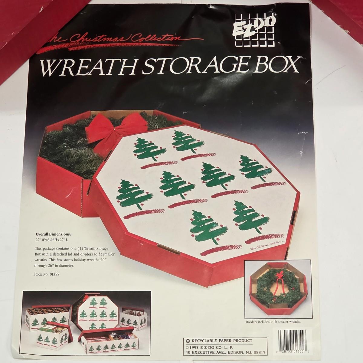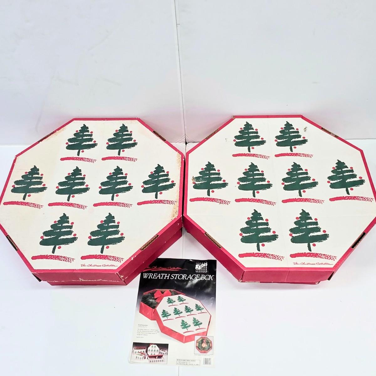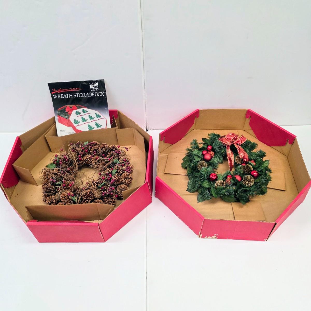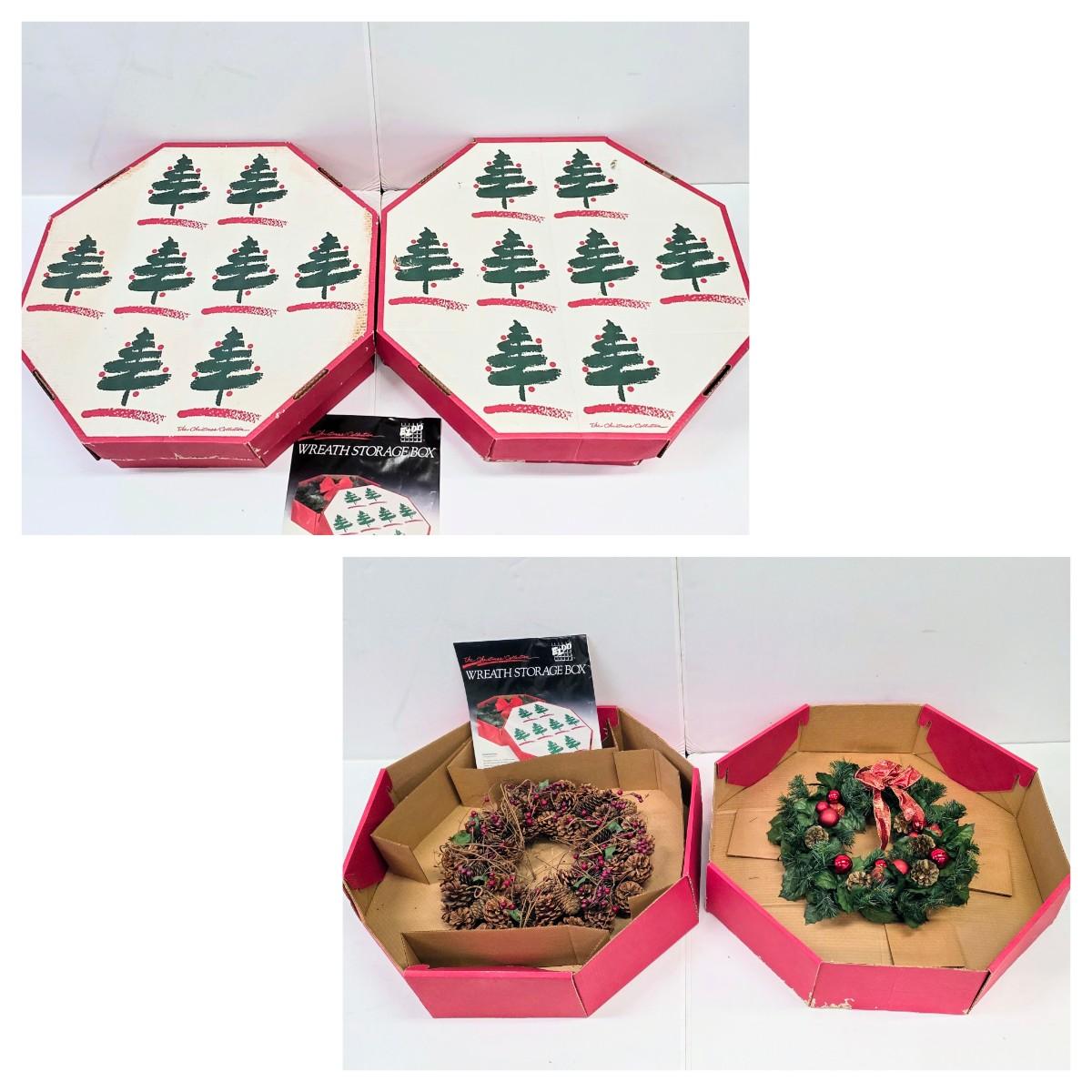 LOT 169: Two Vintage Wreath Storage Boxes, W/Two Artificial Wreaths & One Red Hanger. Boxes Store Up to 27" W x 6 1/2" H x 27"L Wreaths
