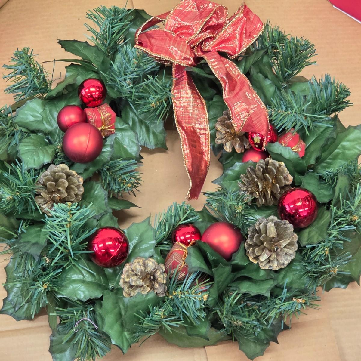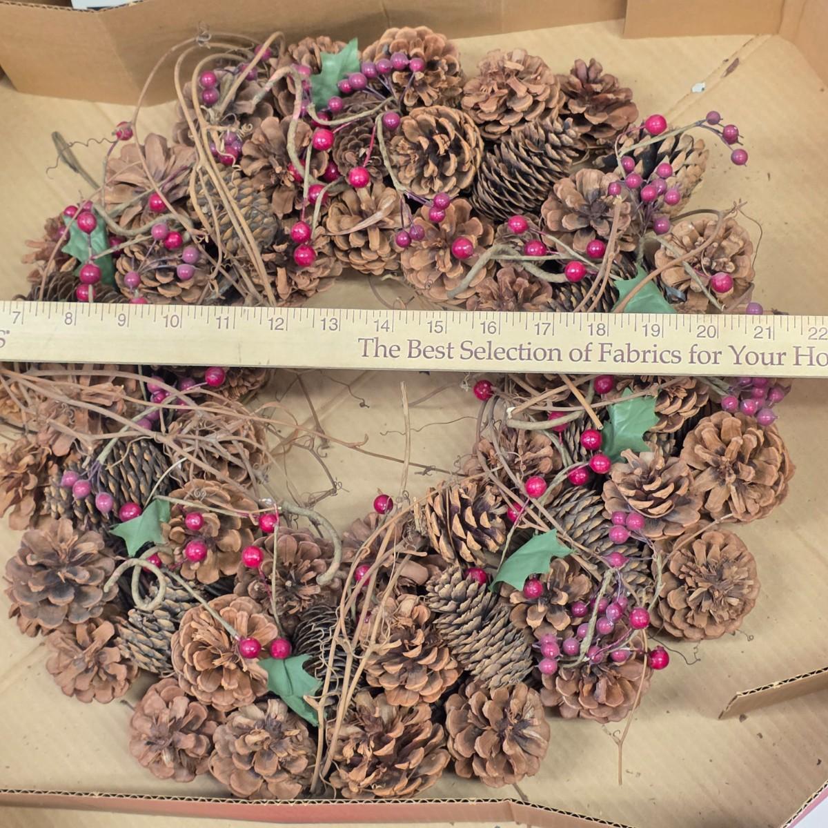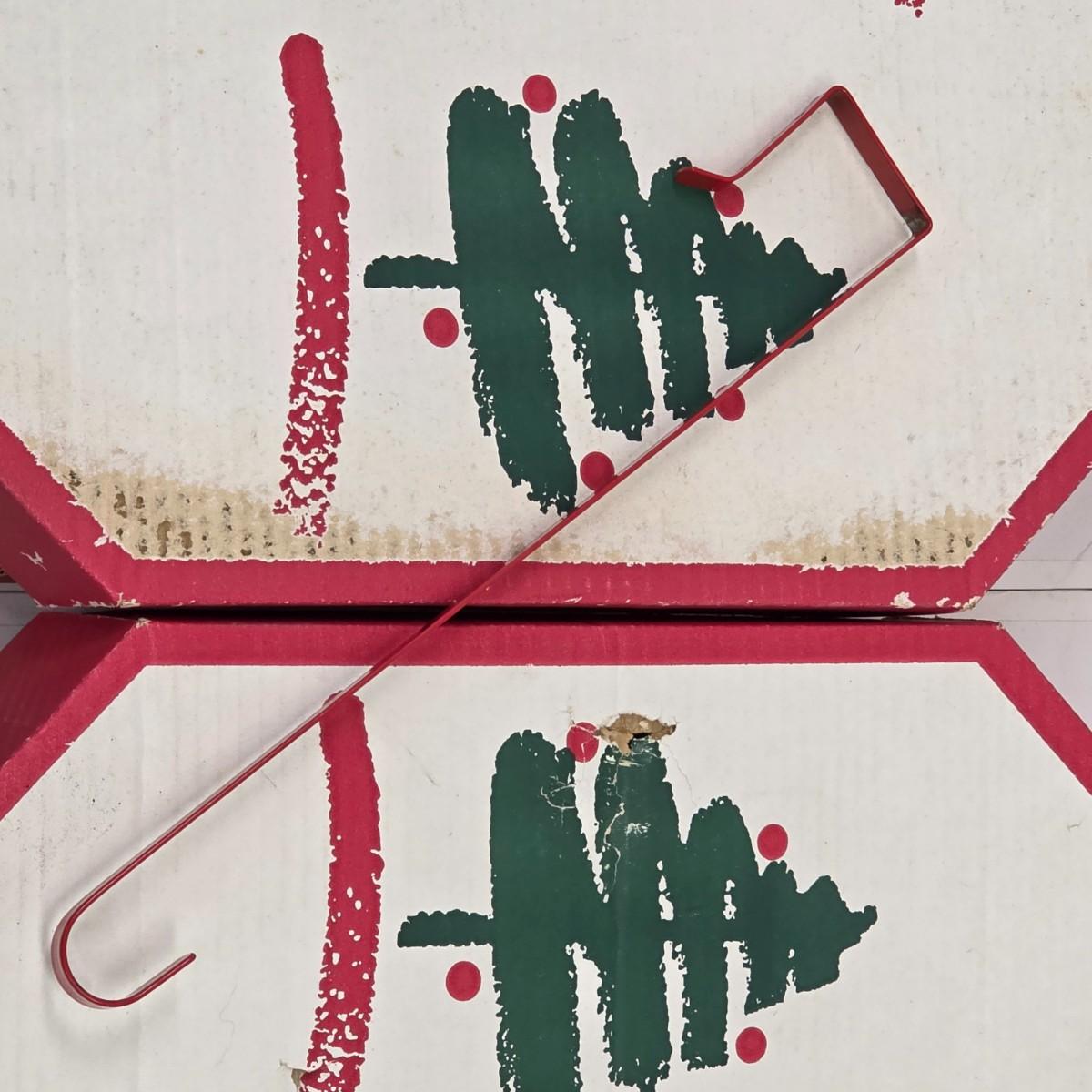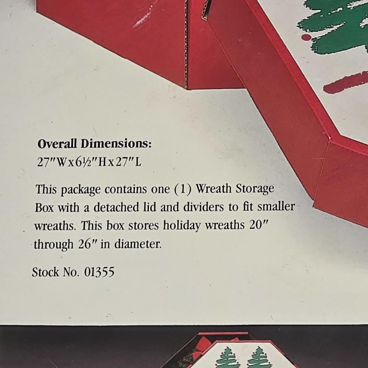 LOT 169: Two Vintage Wreath Storage Boxes, W/Two Artificial Wreaths & One Red Hanger. Boxes Store Up to 27" W x 6 1/2" H x 27"L Wreaths