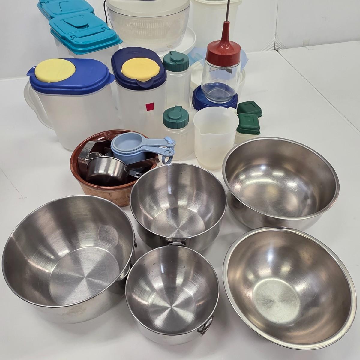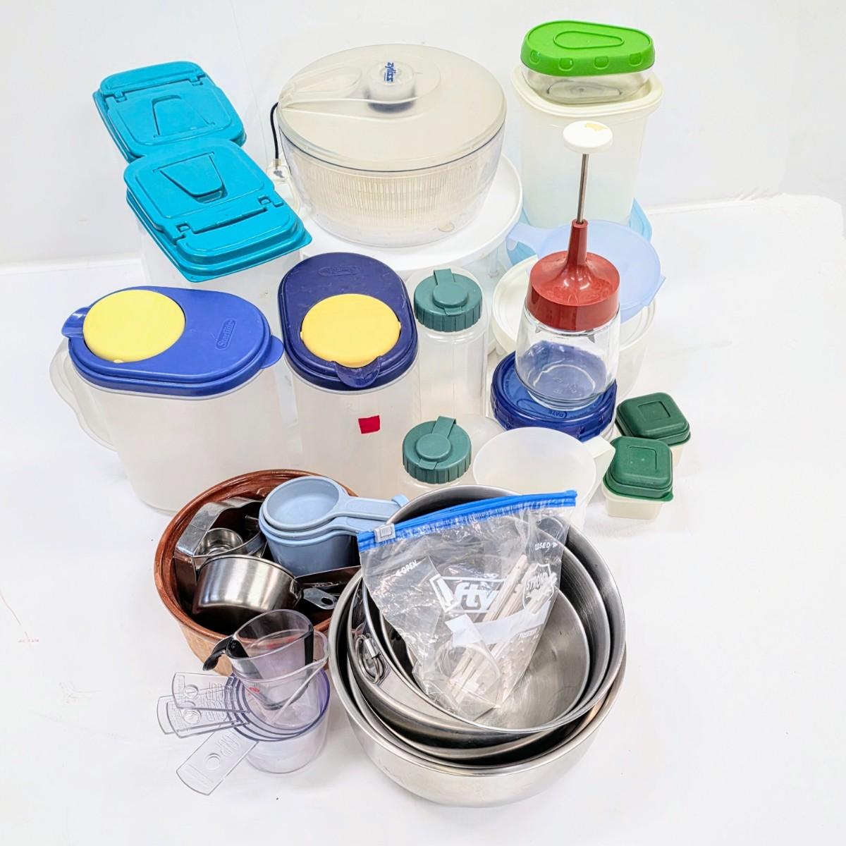 LOT 170: Large Lot of Kitchen Storage Containers, Includes Sterilite & Zip Lock, Pottery Bowl Made in France, Gemco Glass Apple Masher Jar, Salad Spinner & Much More.