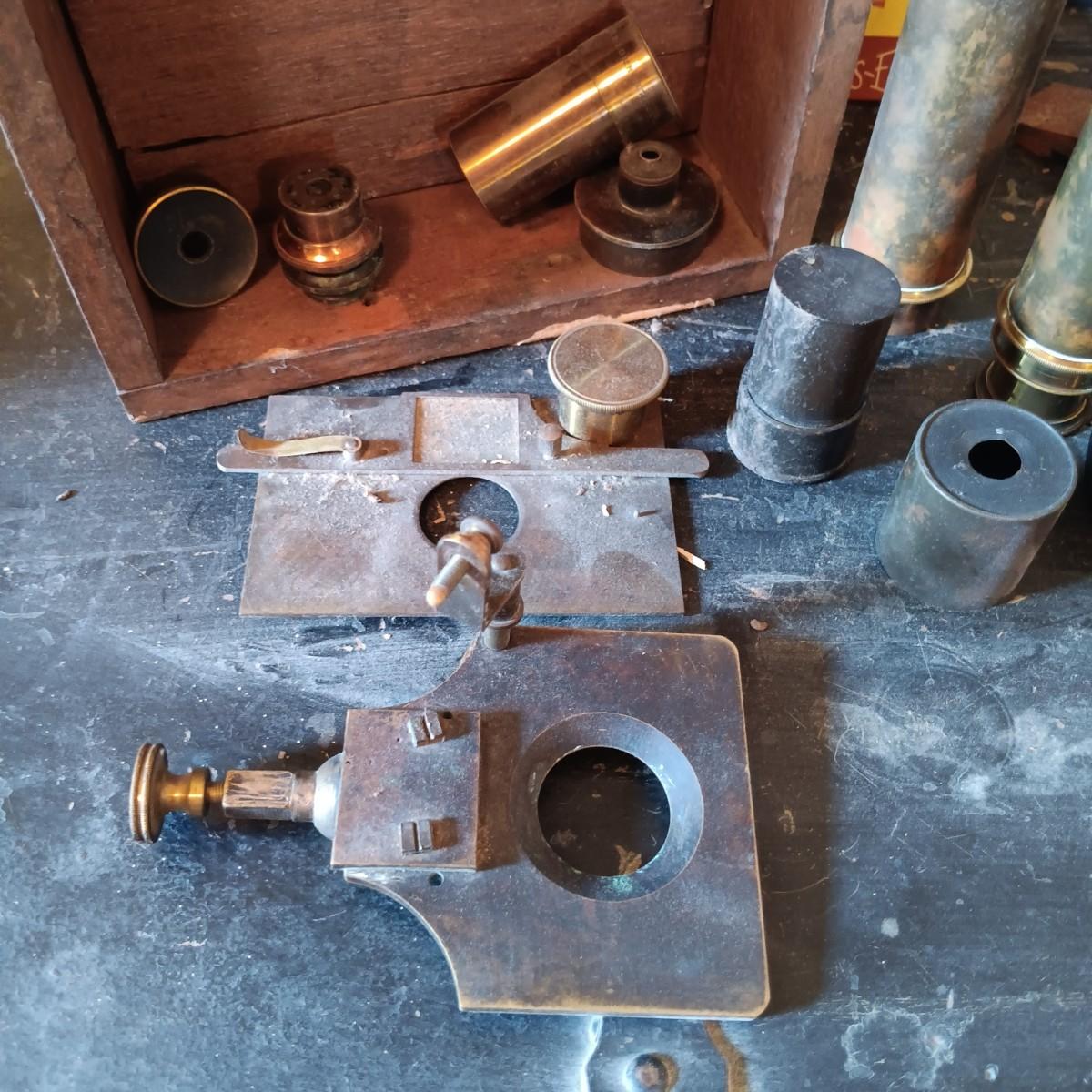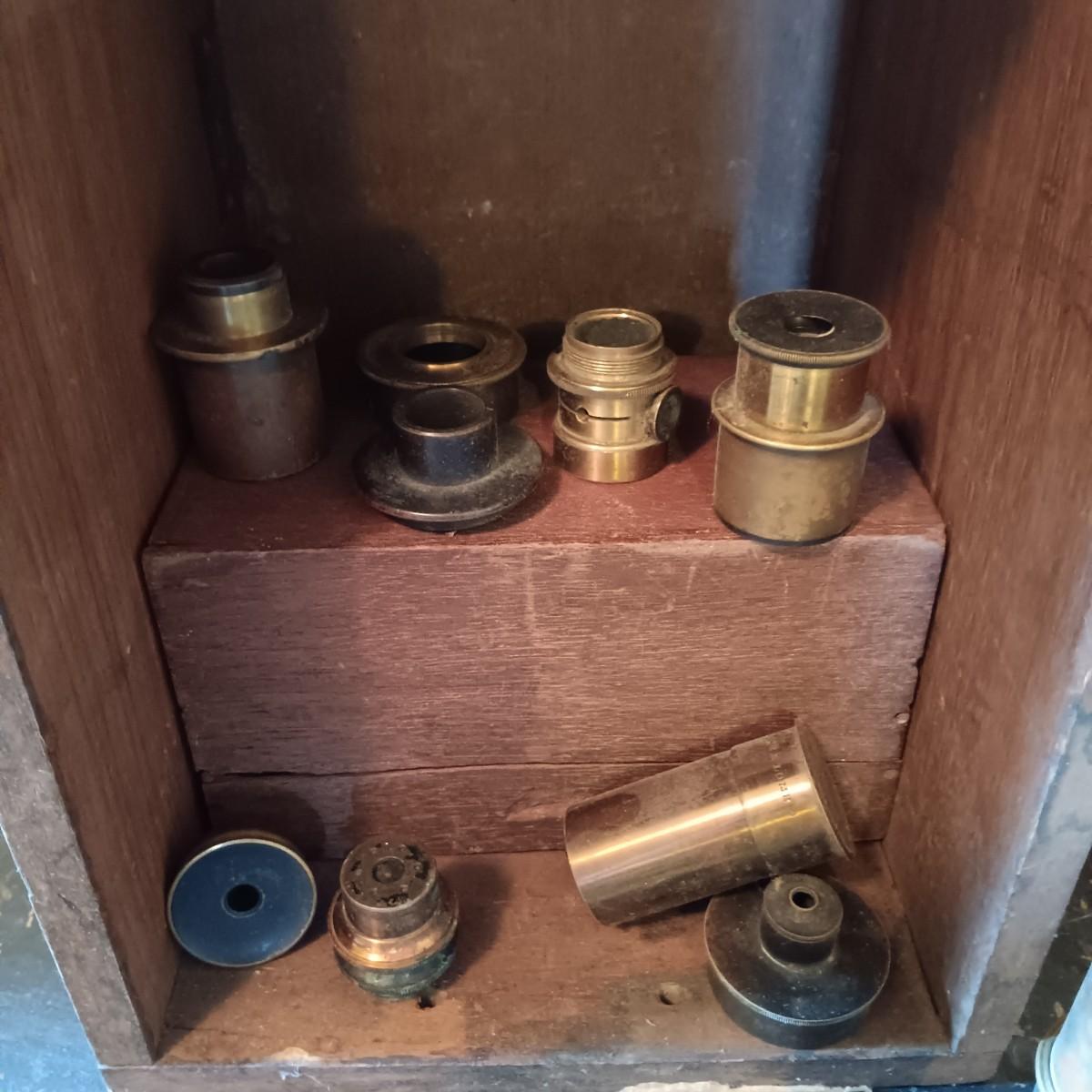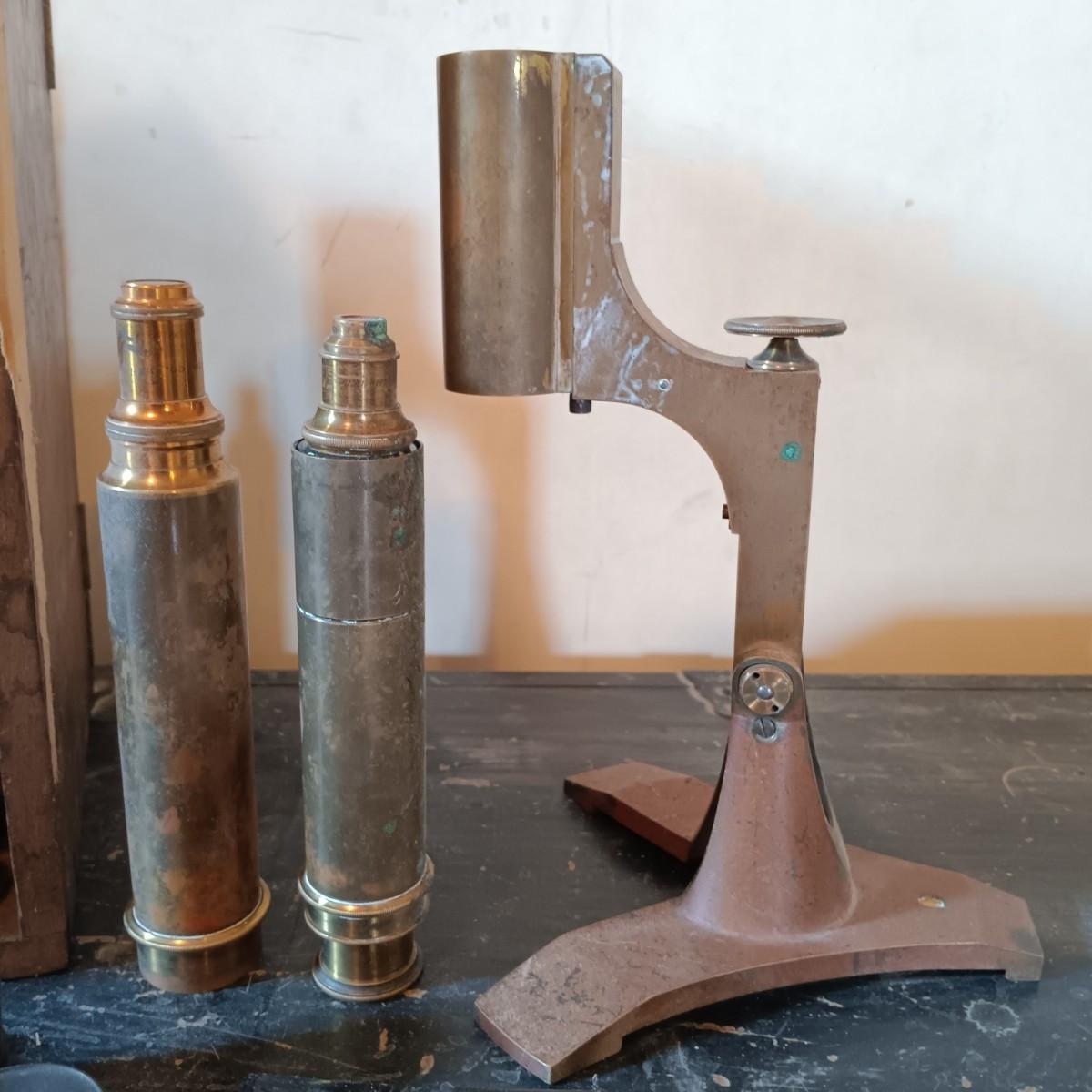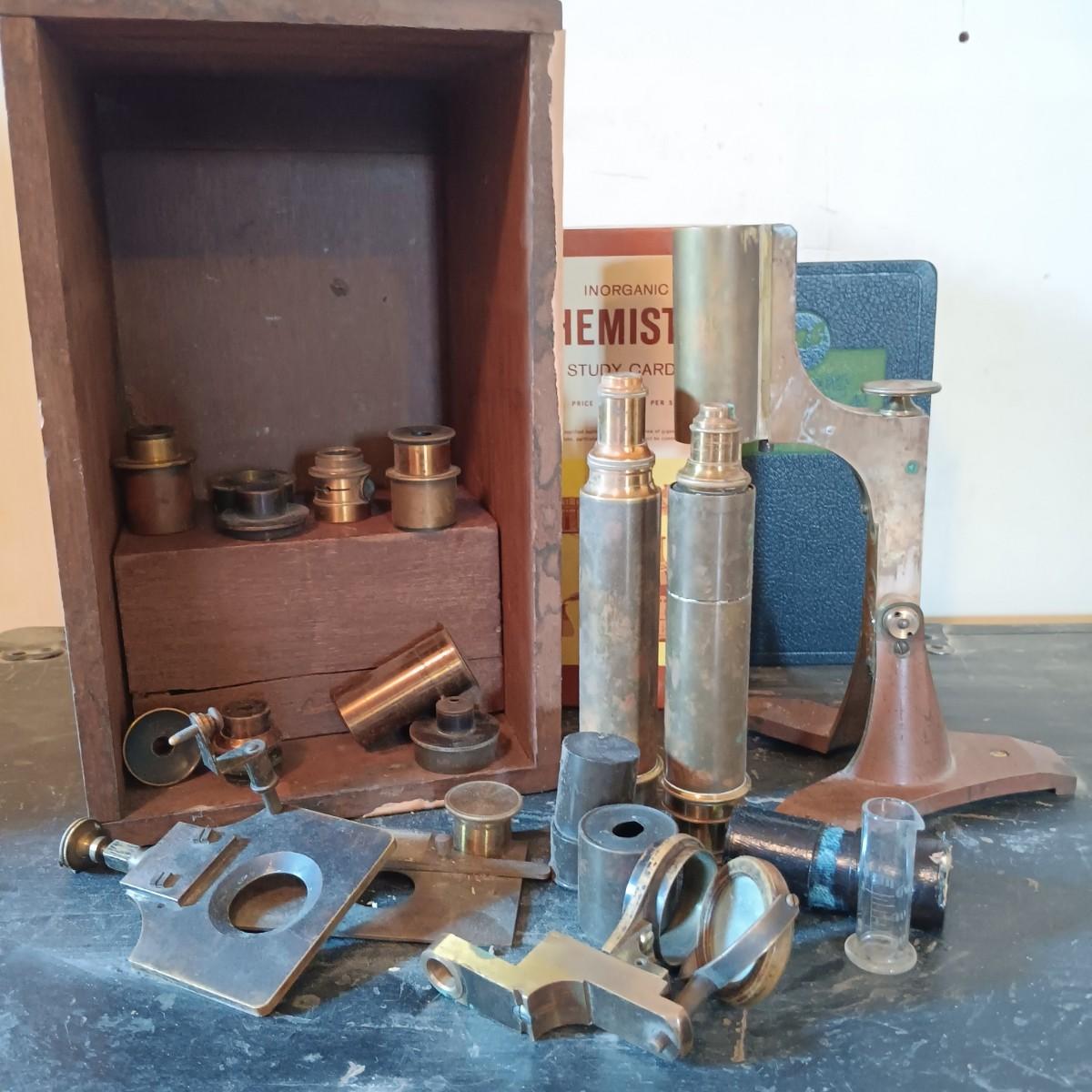 LOT 17: Antique Microscope Set with Miniature Apothecary Cylinder, Chemistry Study Cards & CRC Standard Math Tables