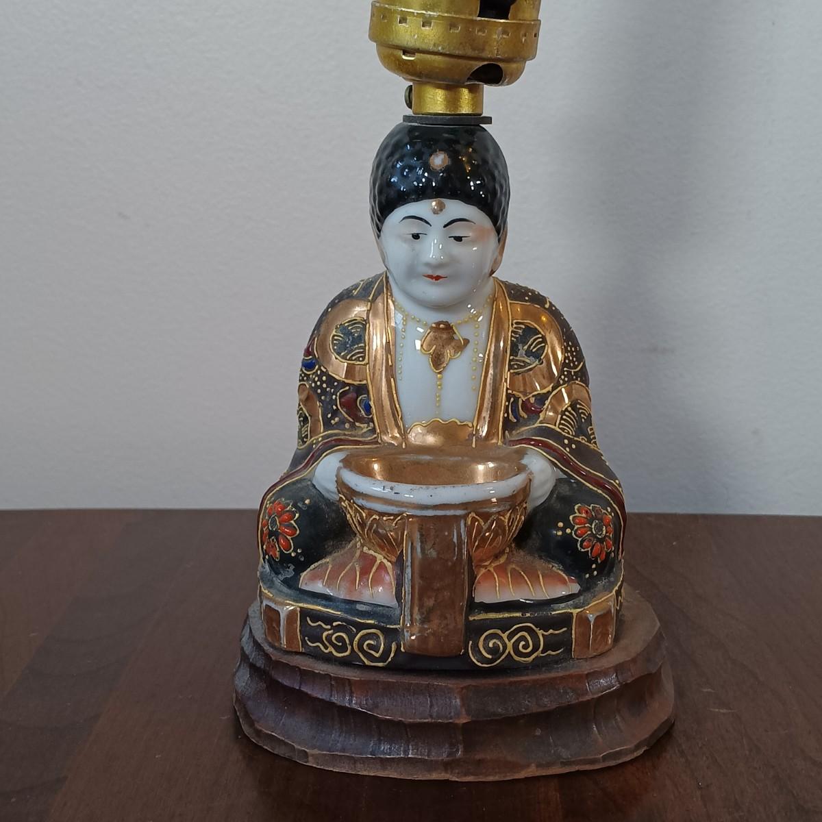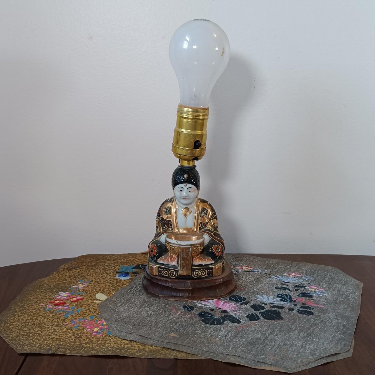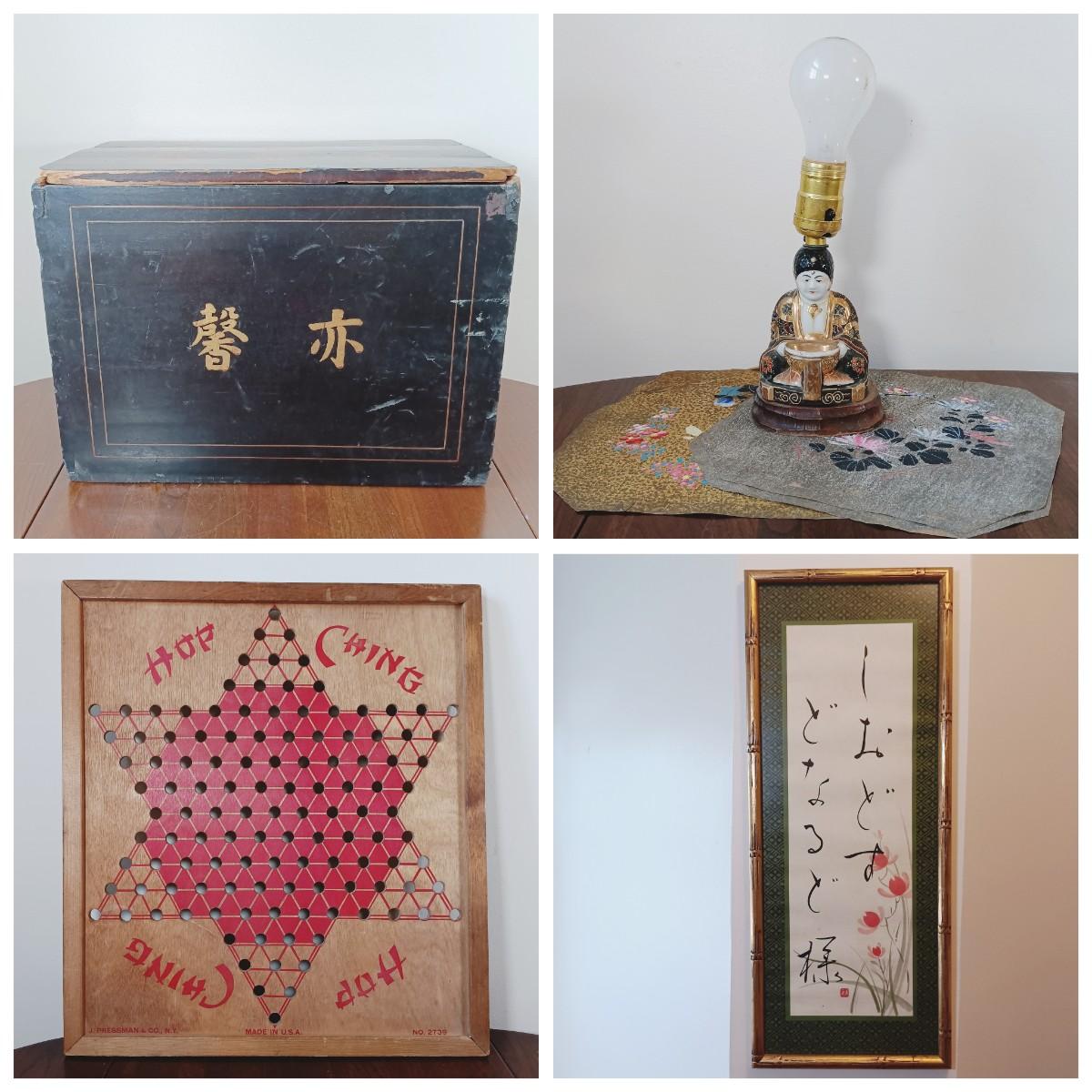 LOT 23: Vintage Lacquered Box, Satsuma-Style Buddha Lamp, Chinese Checkers Board & Framed Art