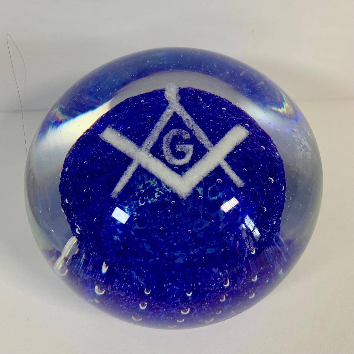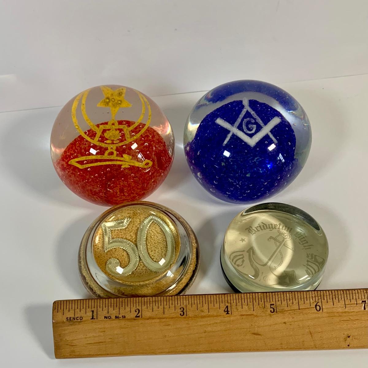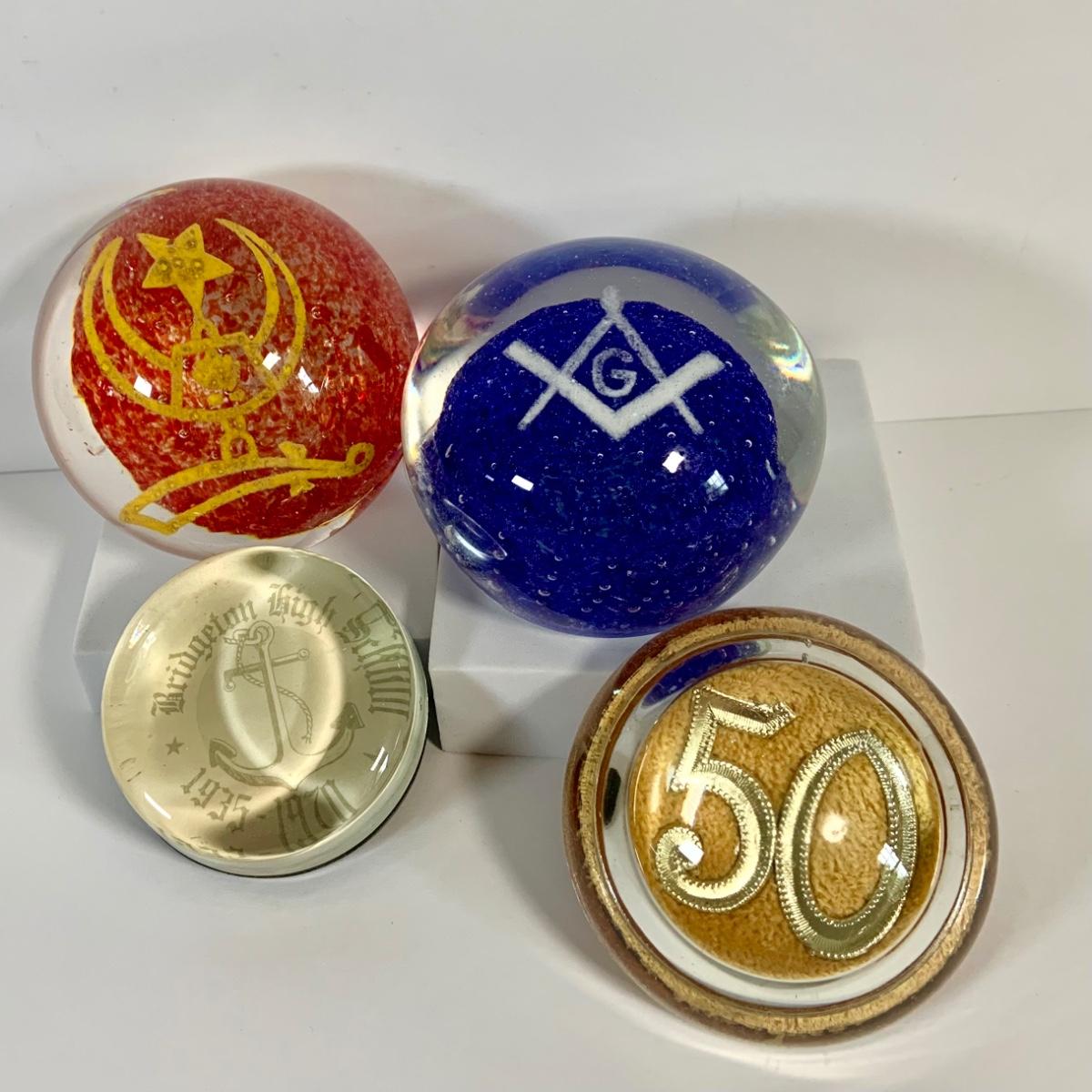 LOT 32: Collection of Vintage Glass Paperweights Featuring Masonic Cobalt Blue and Orange. Bridgetown High School an More
