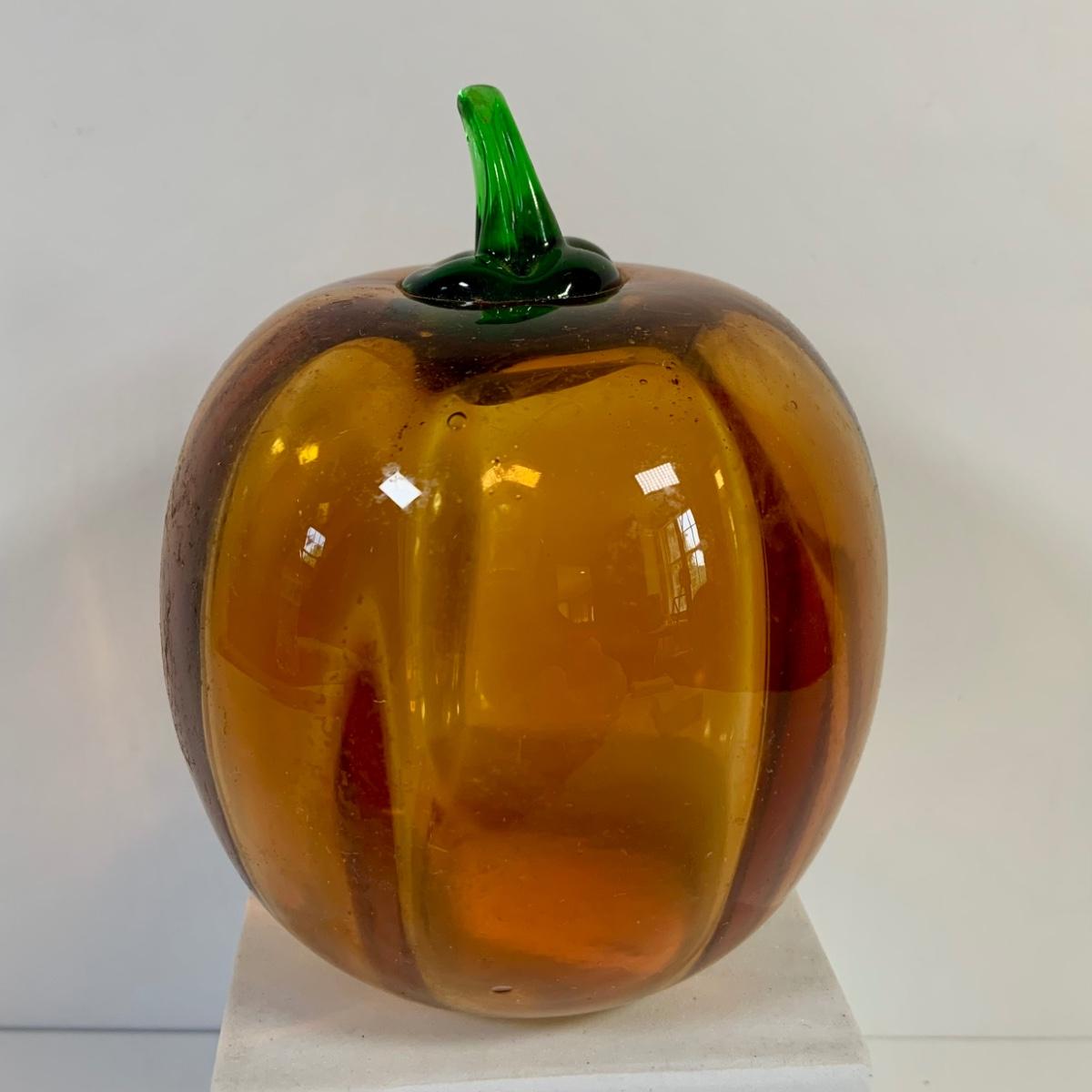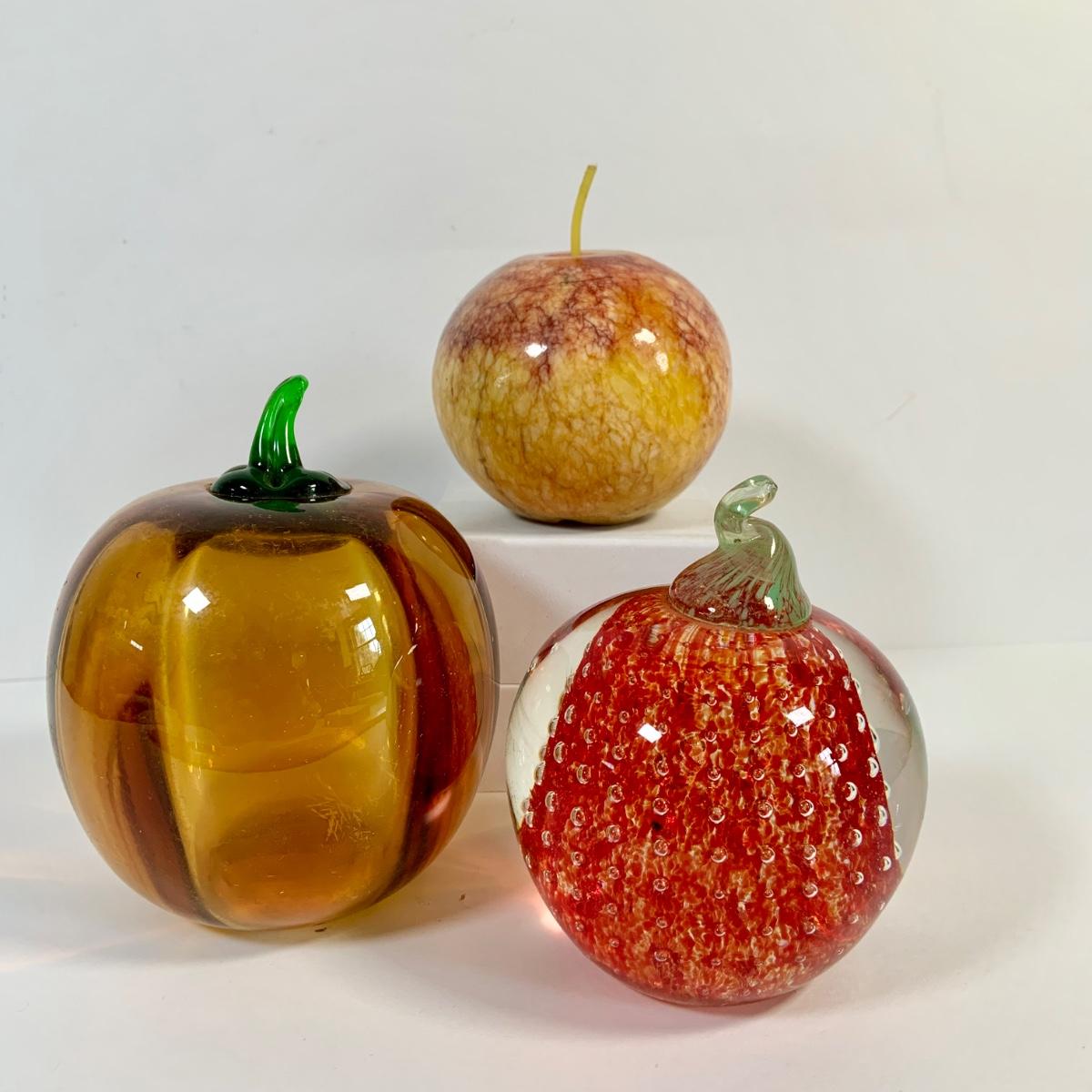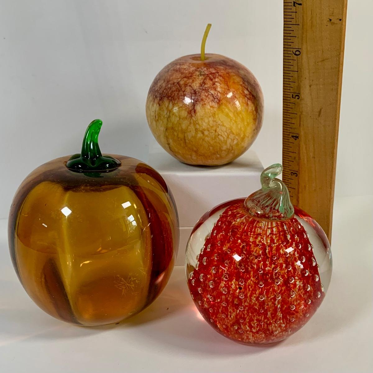 LOT 33: Alabaster Apple, Glass Pumpkin Paper Weight and Art Glass Pumpkin