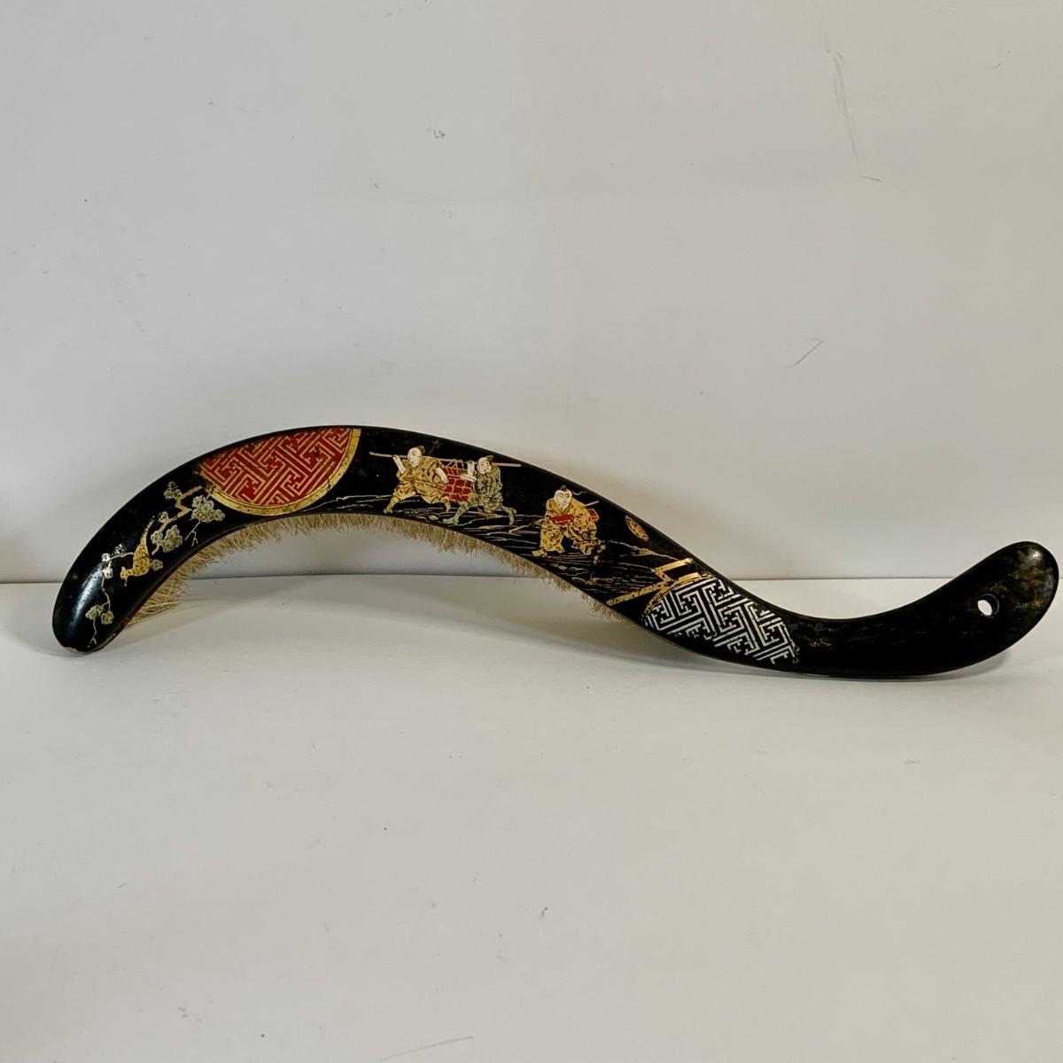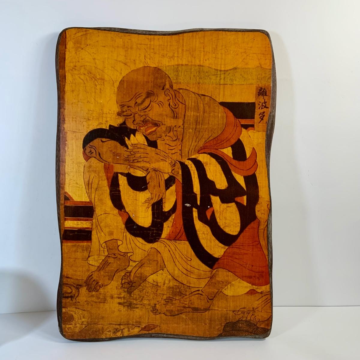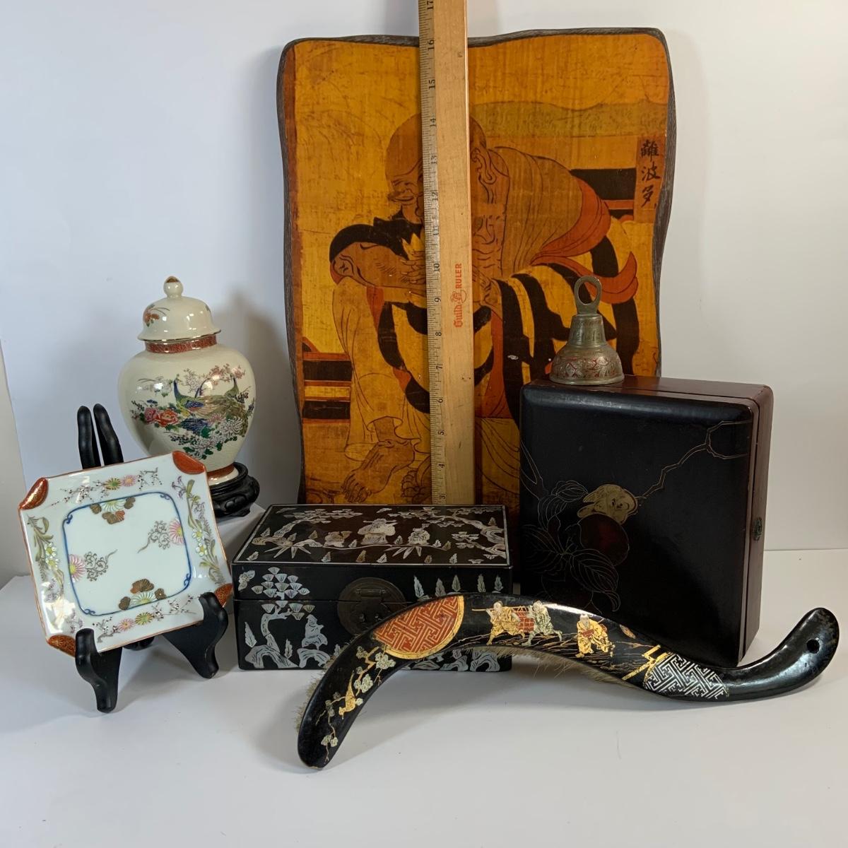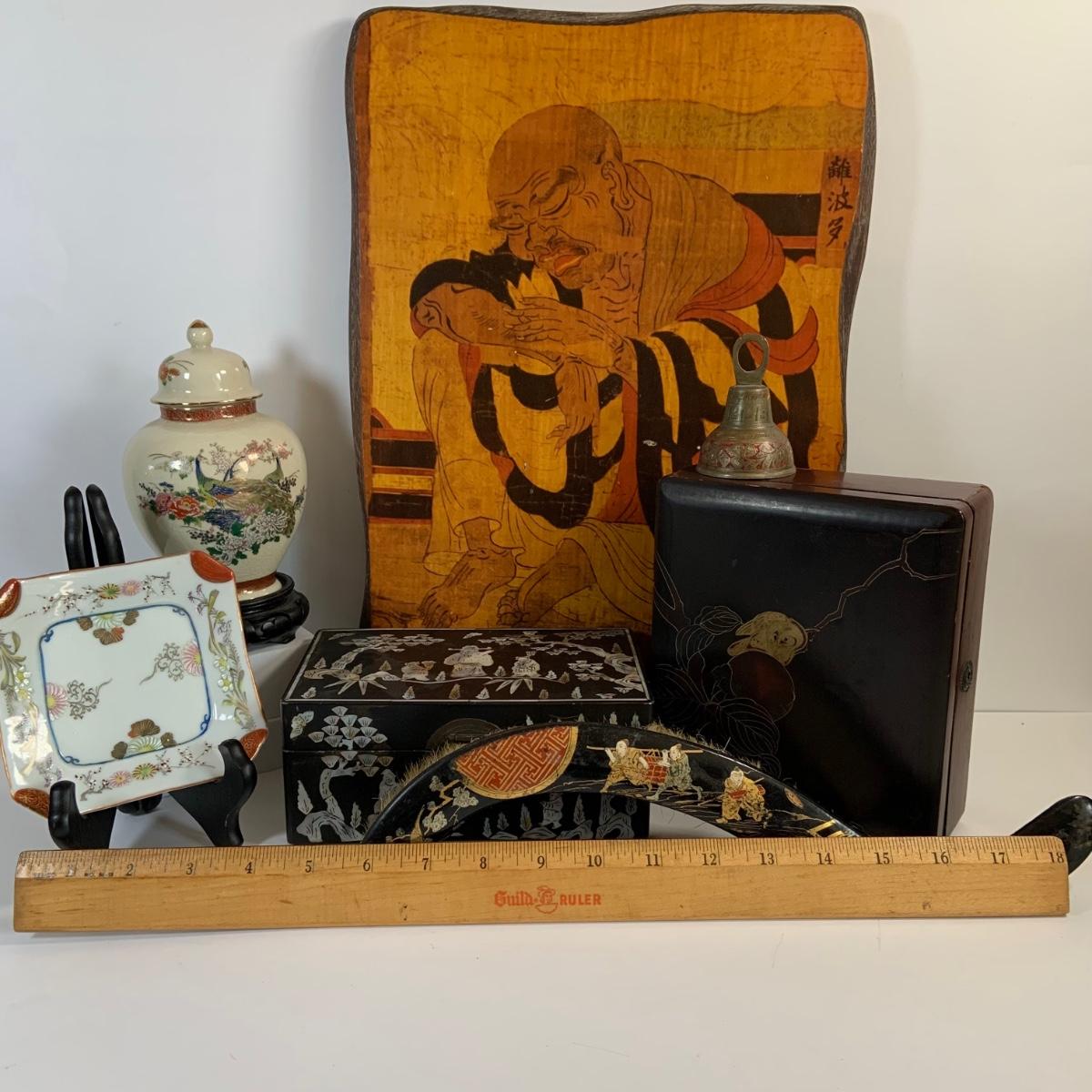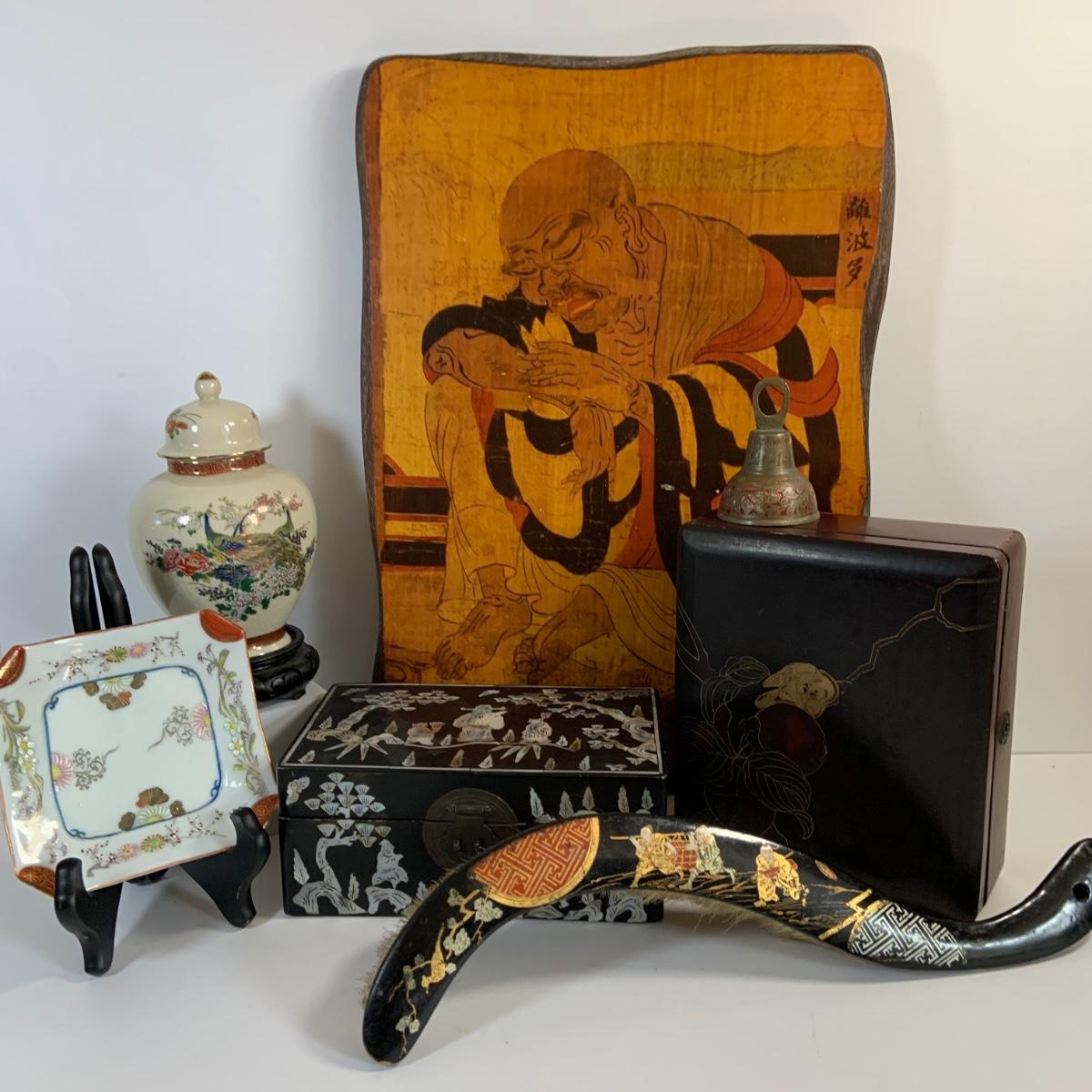 LOT 39: Japanese Inspired Decor Including Ancient Buddhist Style Painting on Wood “Nirvana,Death of Buddha”, Asian Brass Bell, Lacquered Sweeper Brush, Boxes Ginger Jar and More