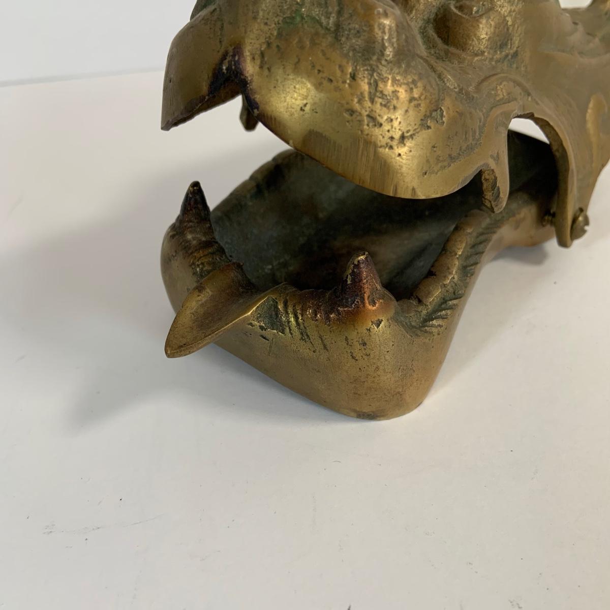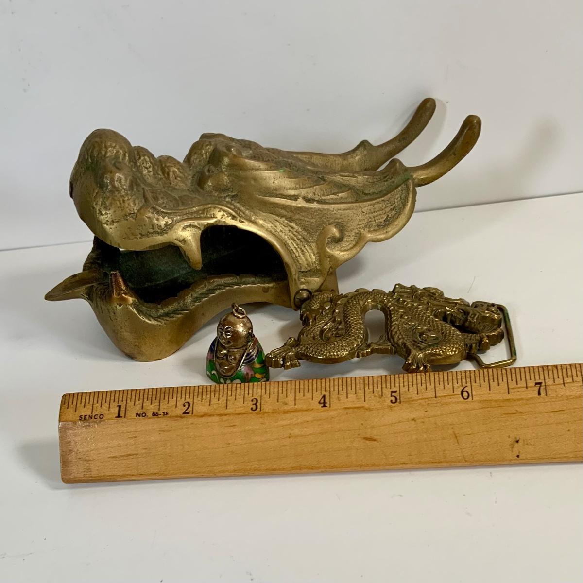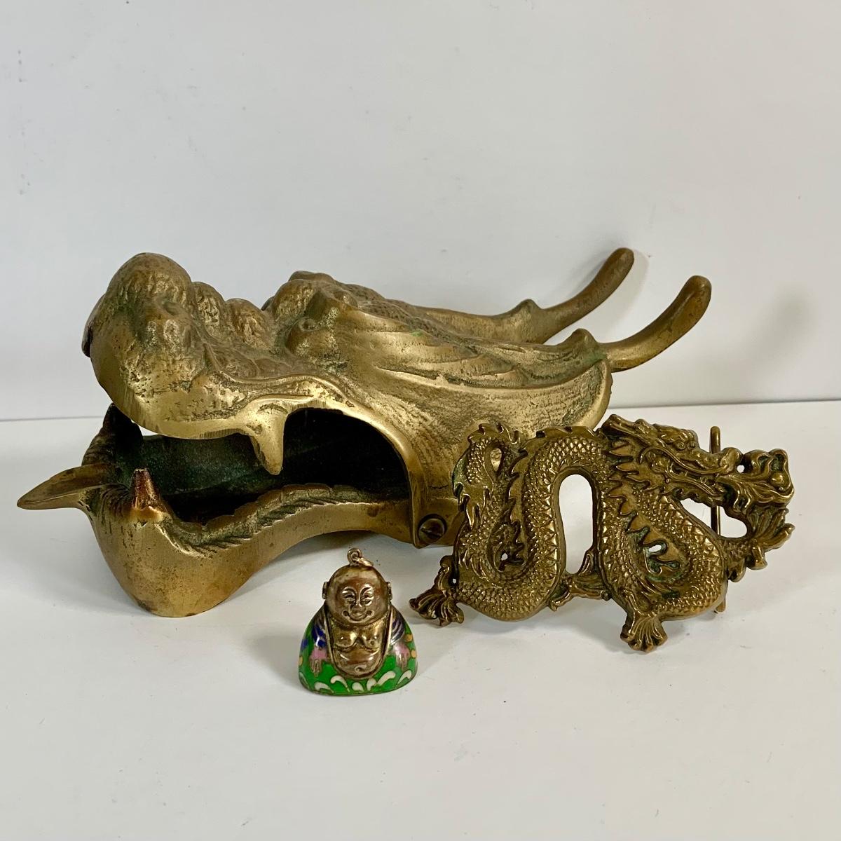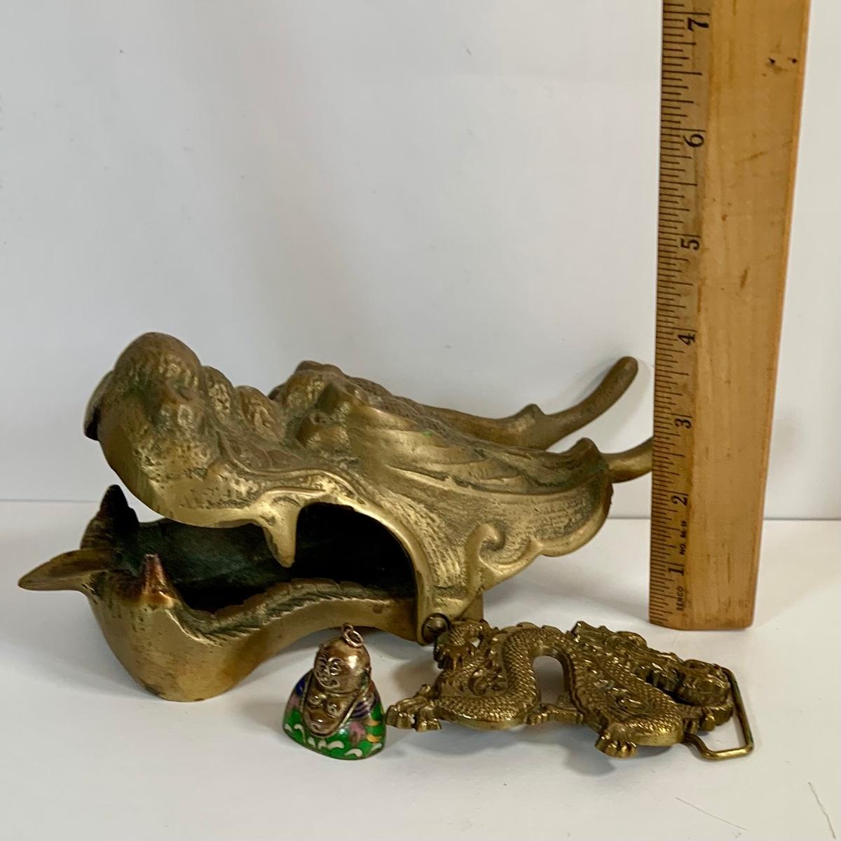LOT 40: Vintage Metal Dragon Head Ash Tray Incense Burner. Brass Dragon Belt Buckle and Brass Buddha