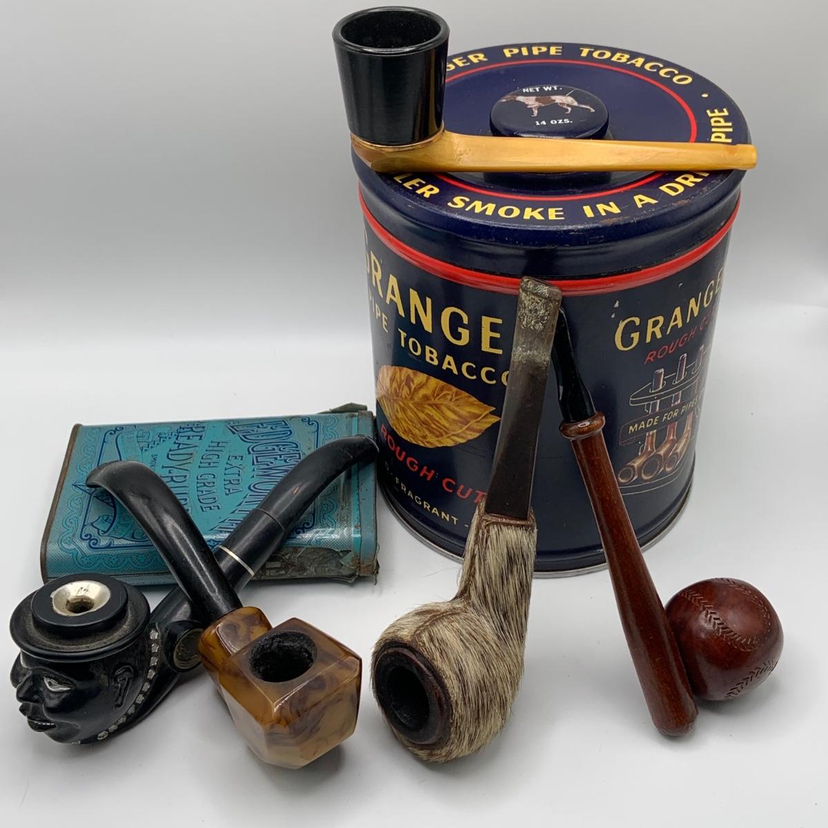 LOT 49: Collection of Vintage Pipes Including Amber, Black American Pipe, Fur Pipe, Bakelite Pipe and Tobacco Tins