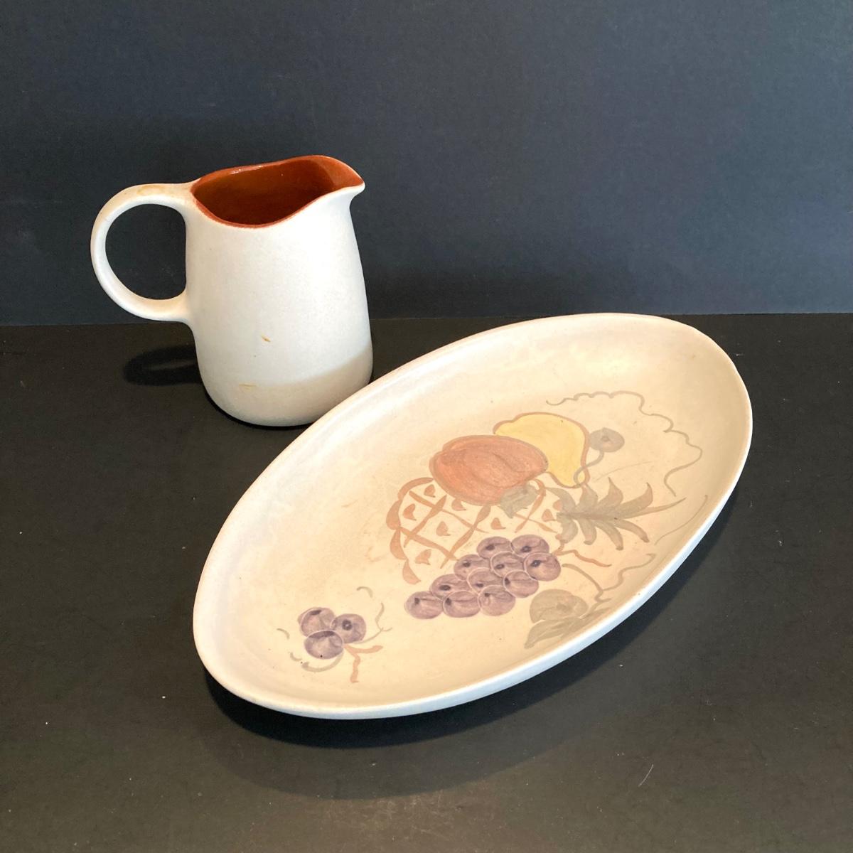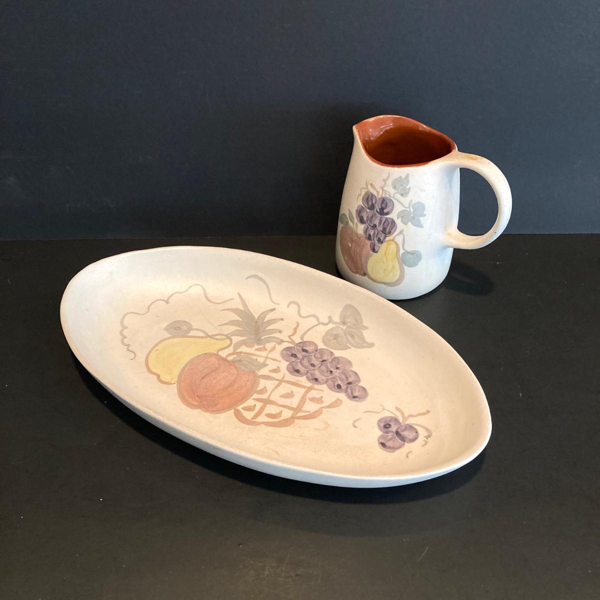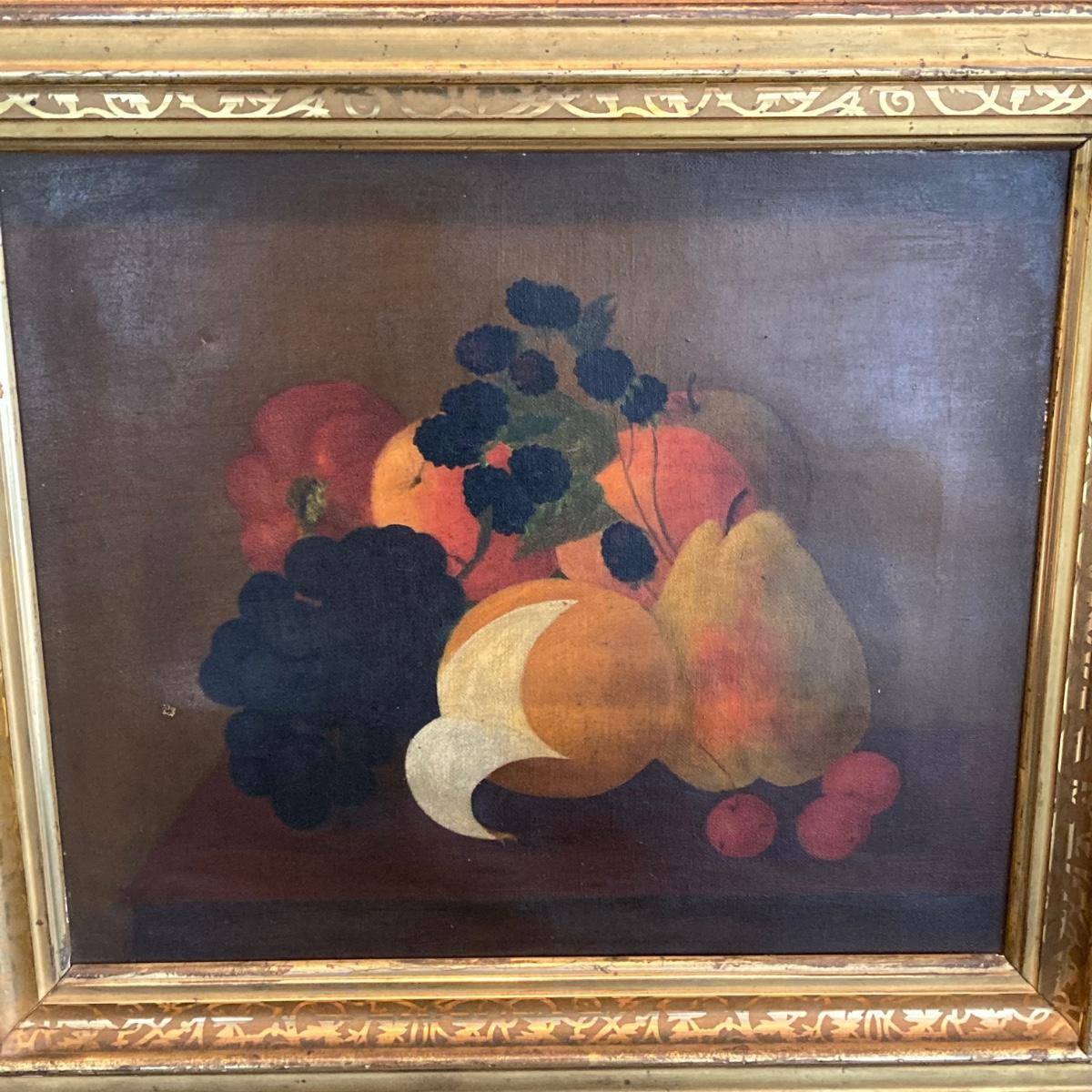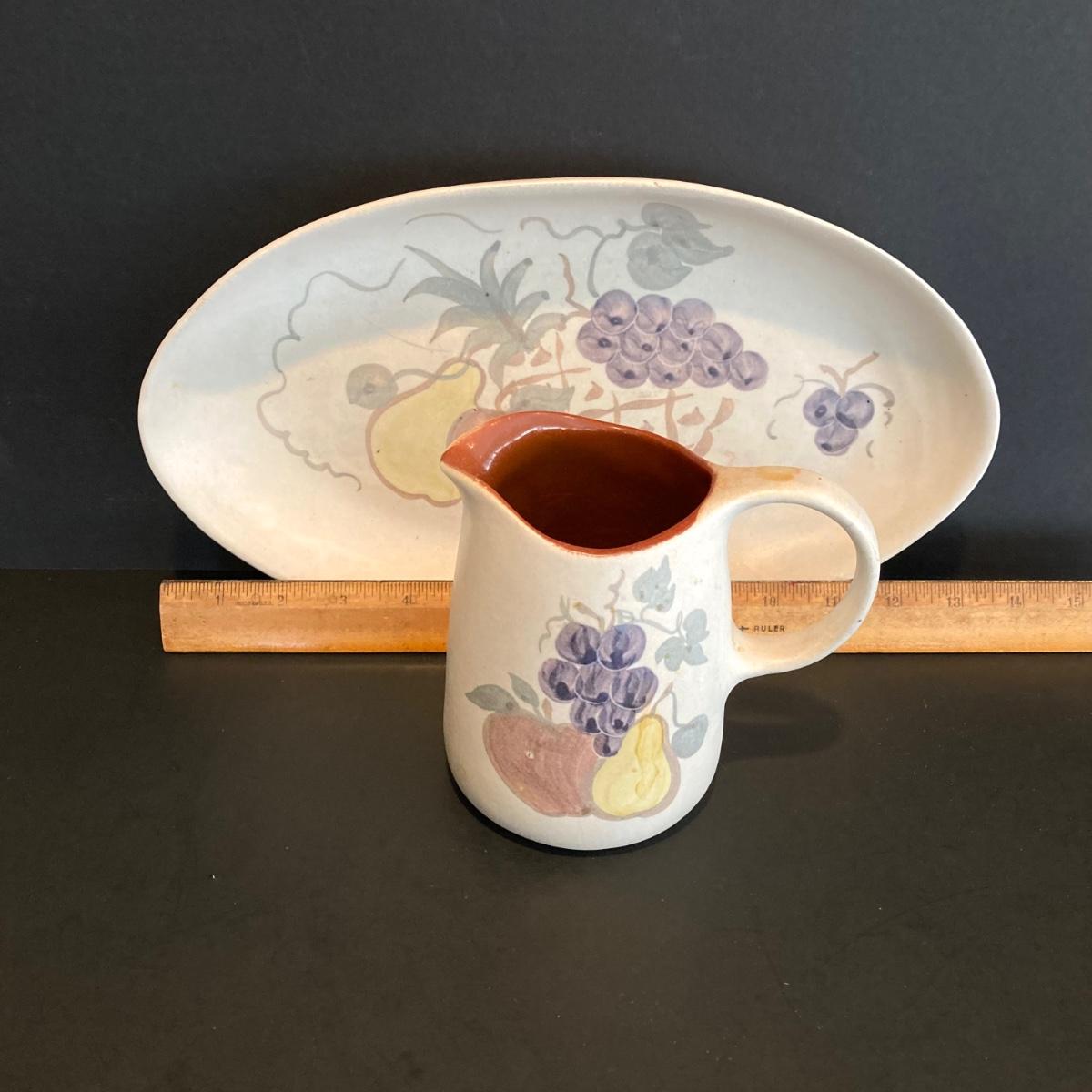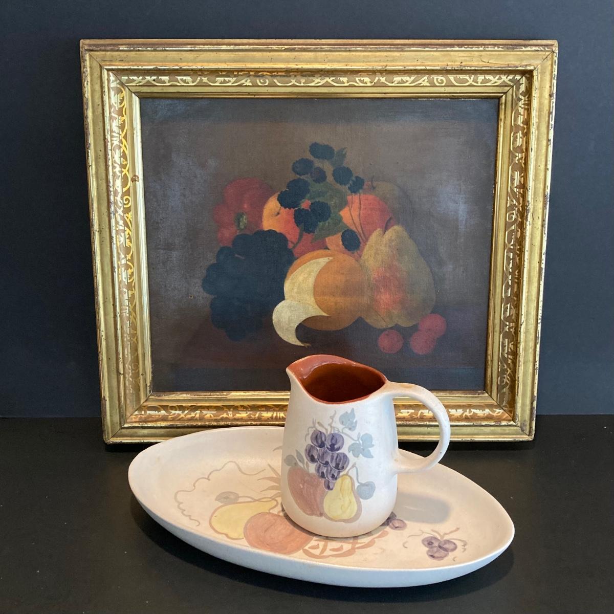 LOT 64: Vintage / Antique Framed Assorted Fruit Oil Painting with Country Harvest Chatham Pottery Pitcher and Oval Dish
