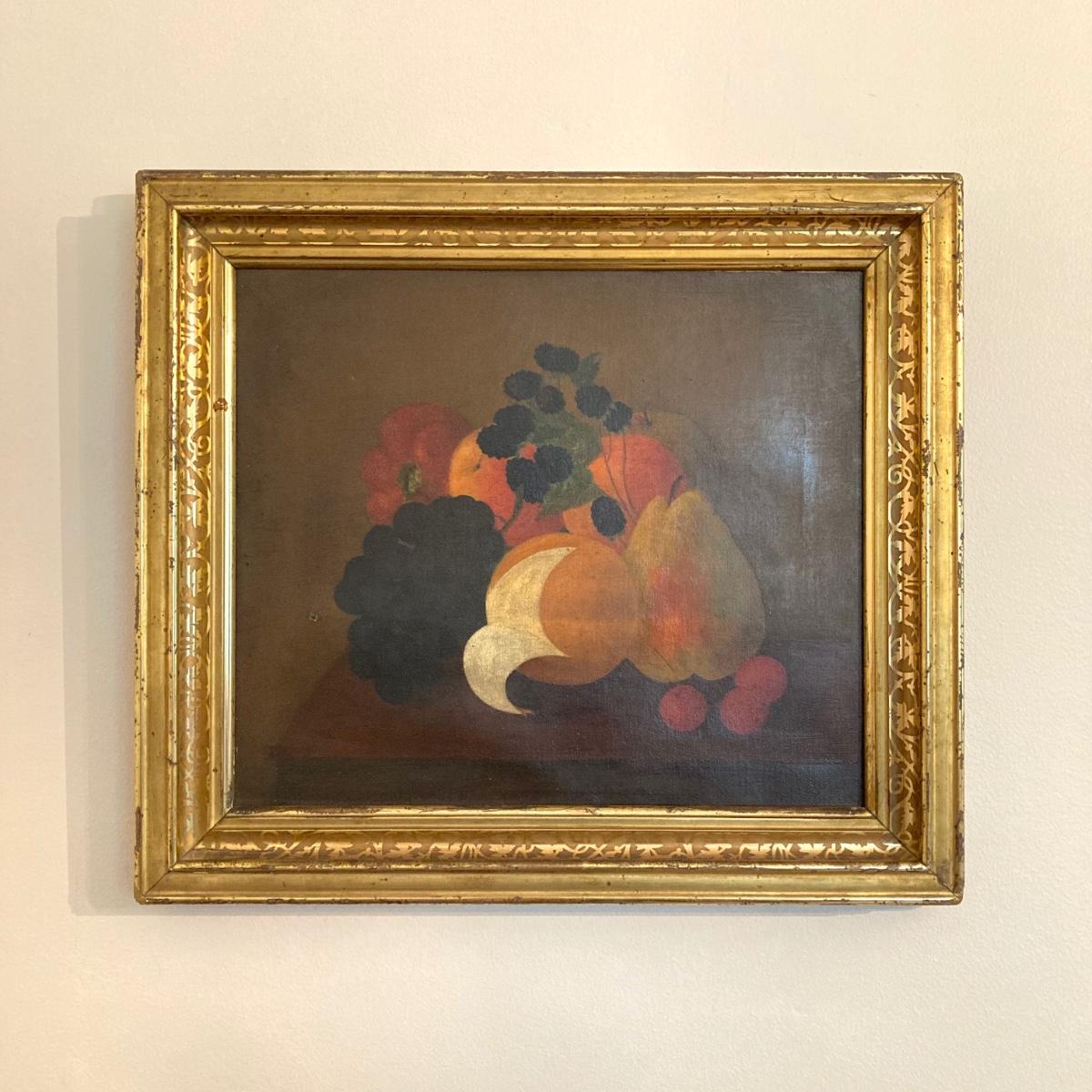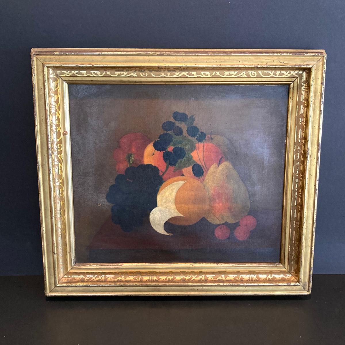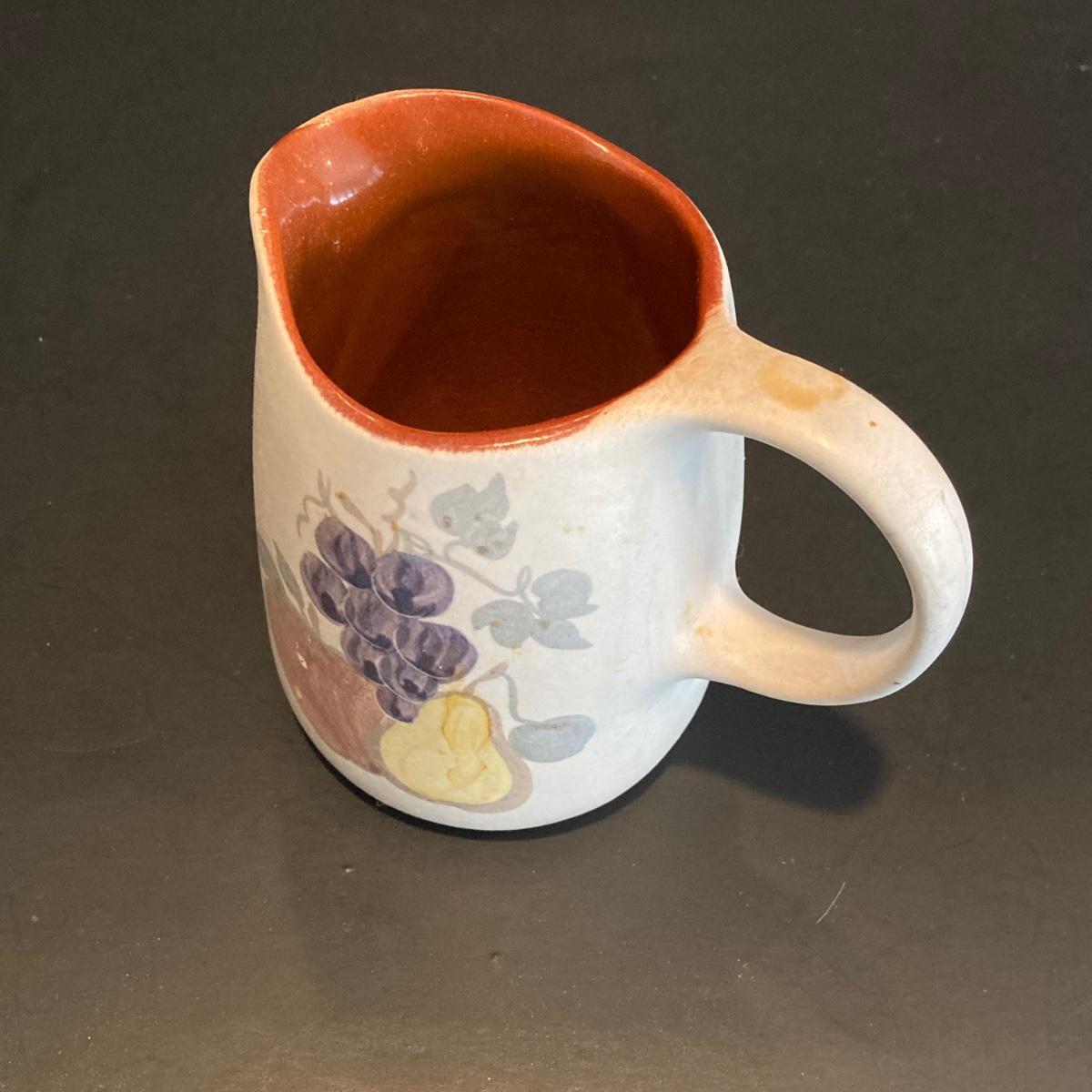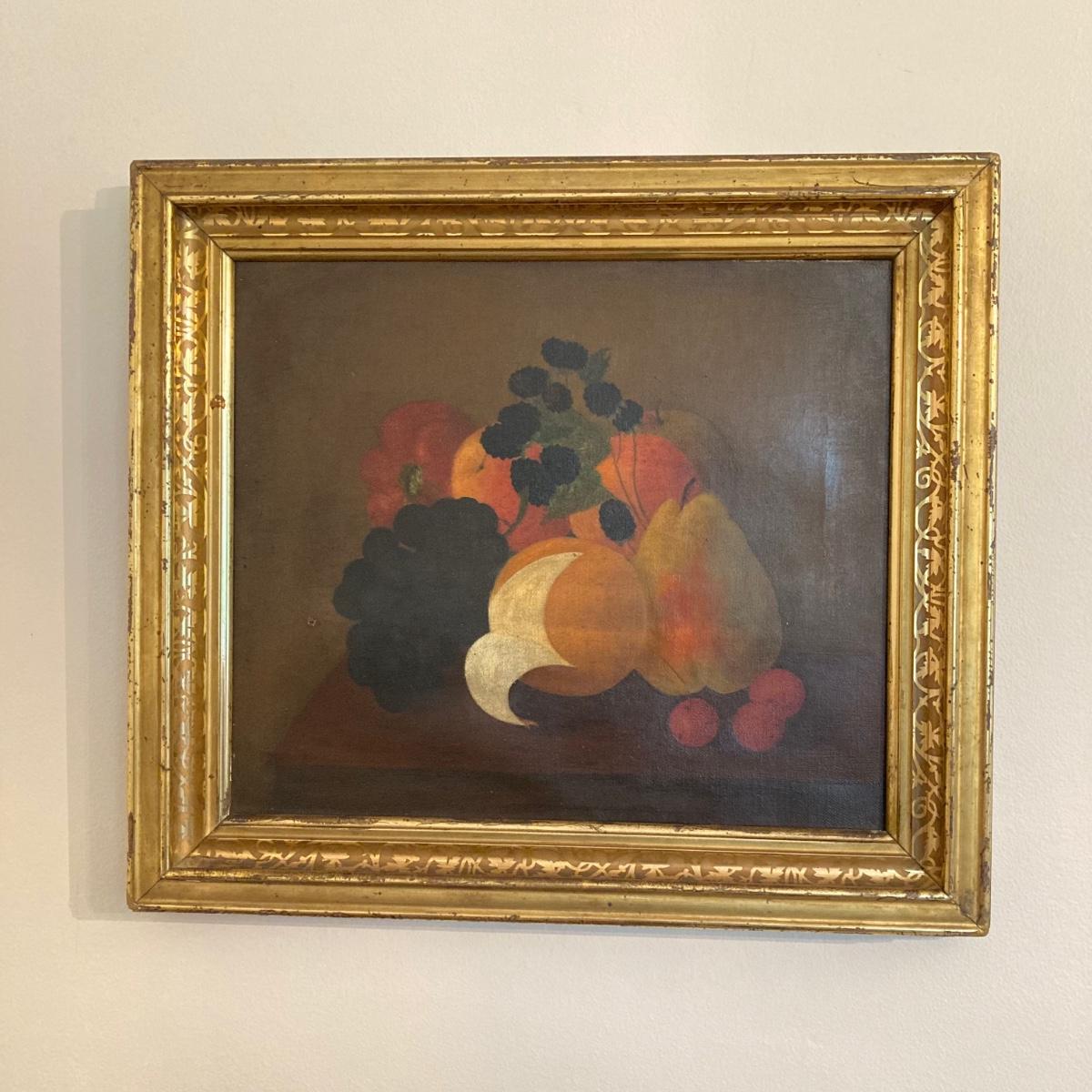 LOT 64: Vintage / Antique Framed Assorted Fruit Oil Painting with Country Harvest Chatham Pottery Pitcher and Oval Dish