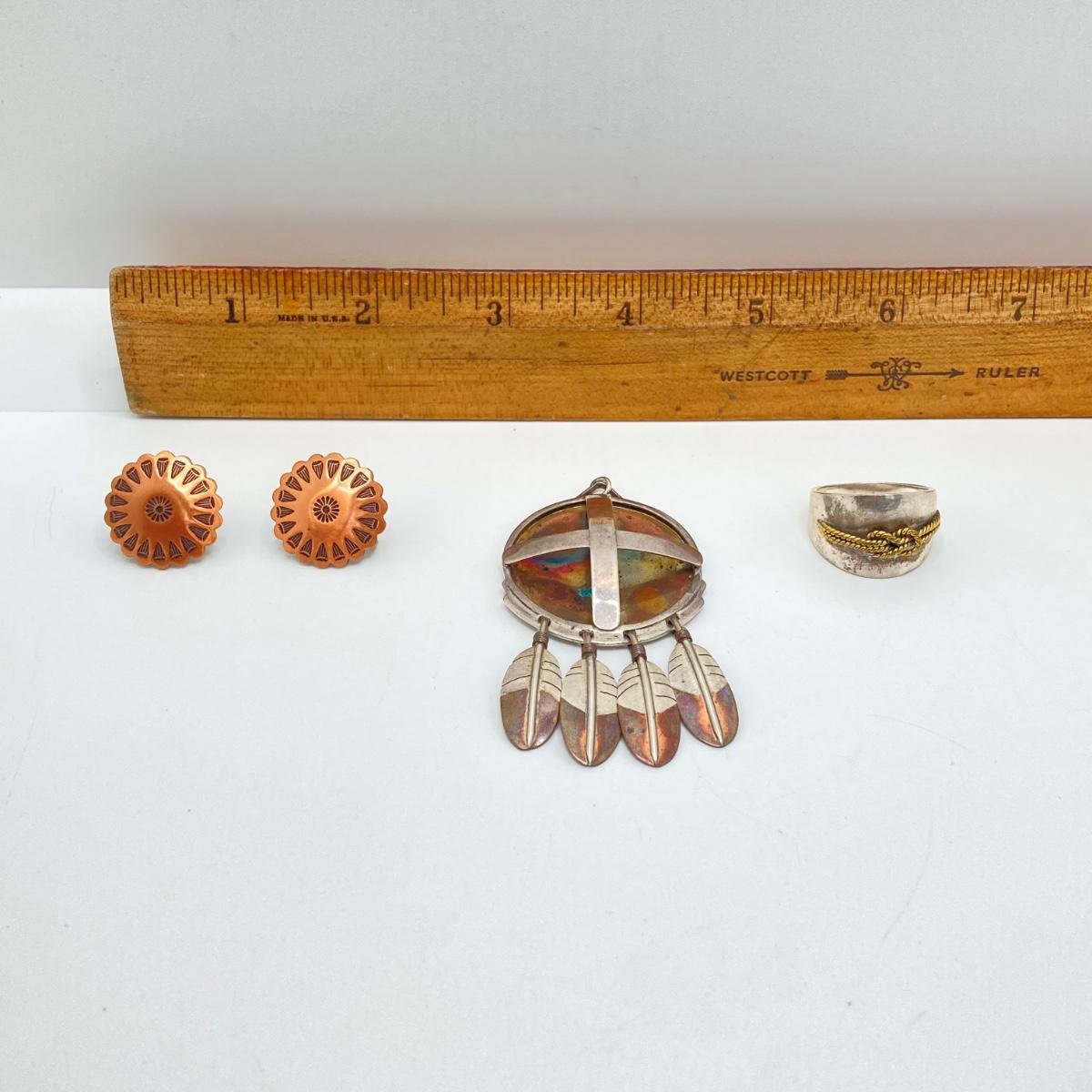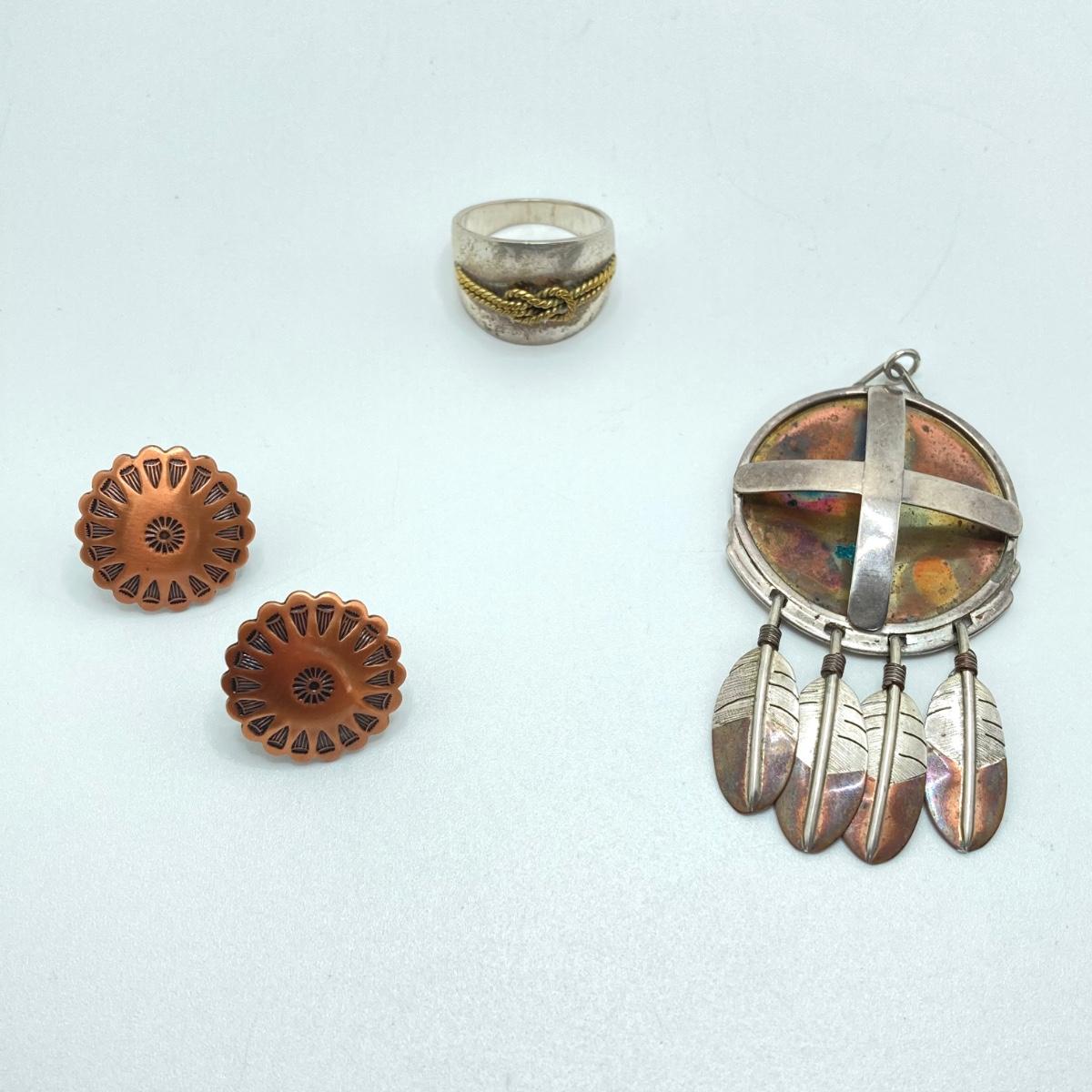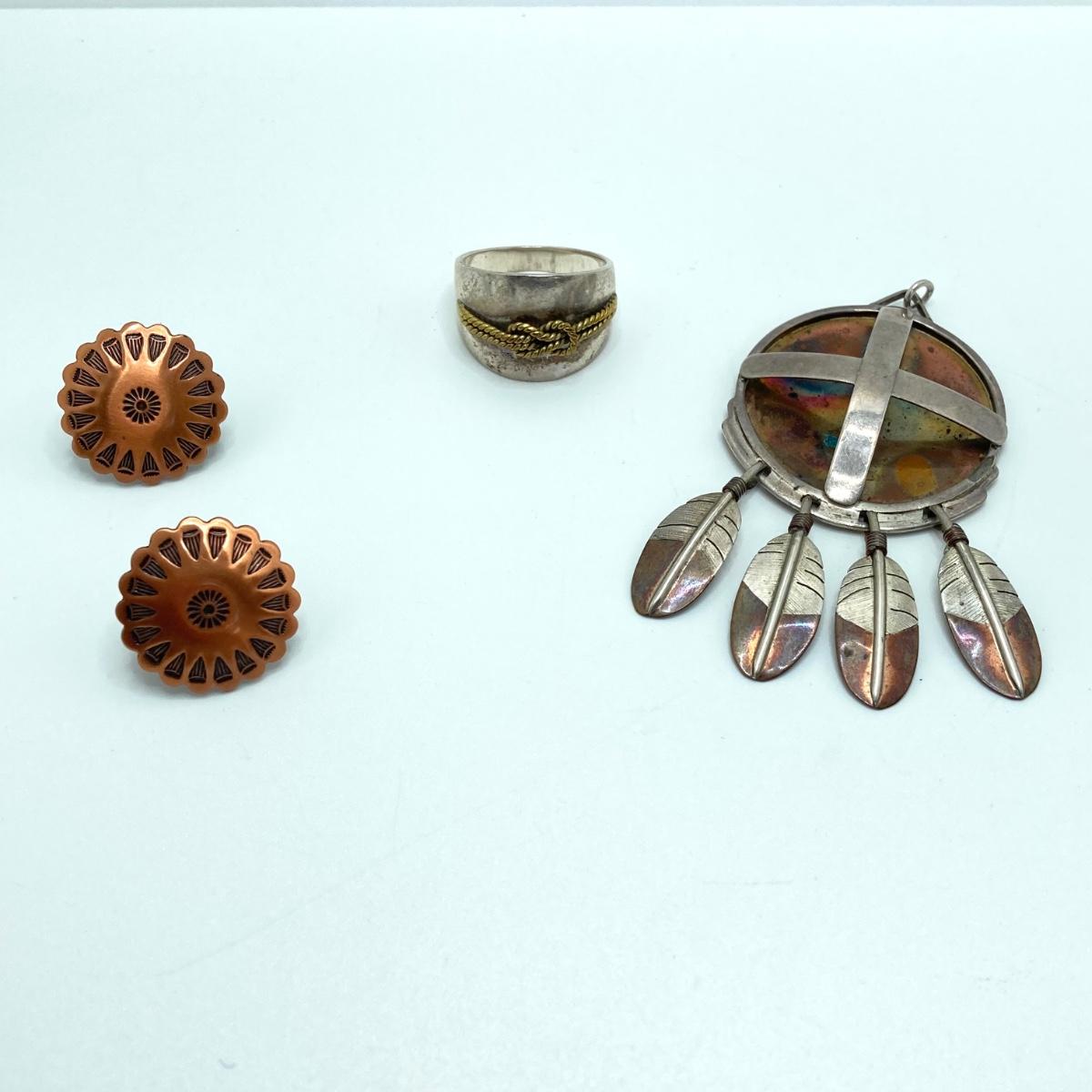 LOT 80: Clemens Handmade Pendant, Tied Knot Mexico Ring Size 9.5 with Screw Back Copper Earrings