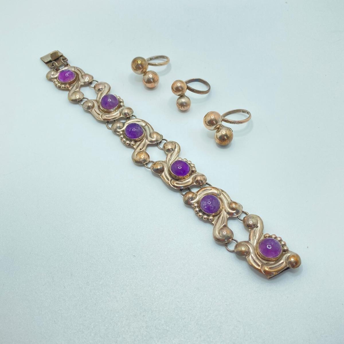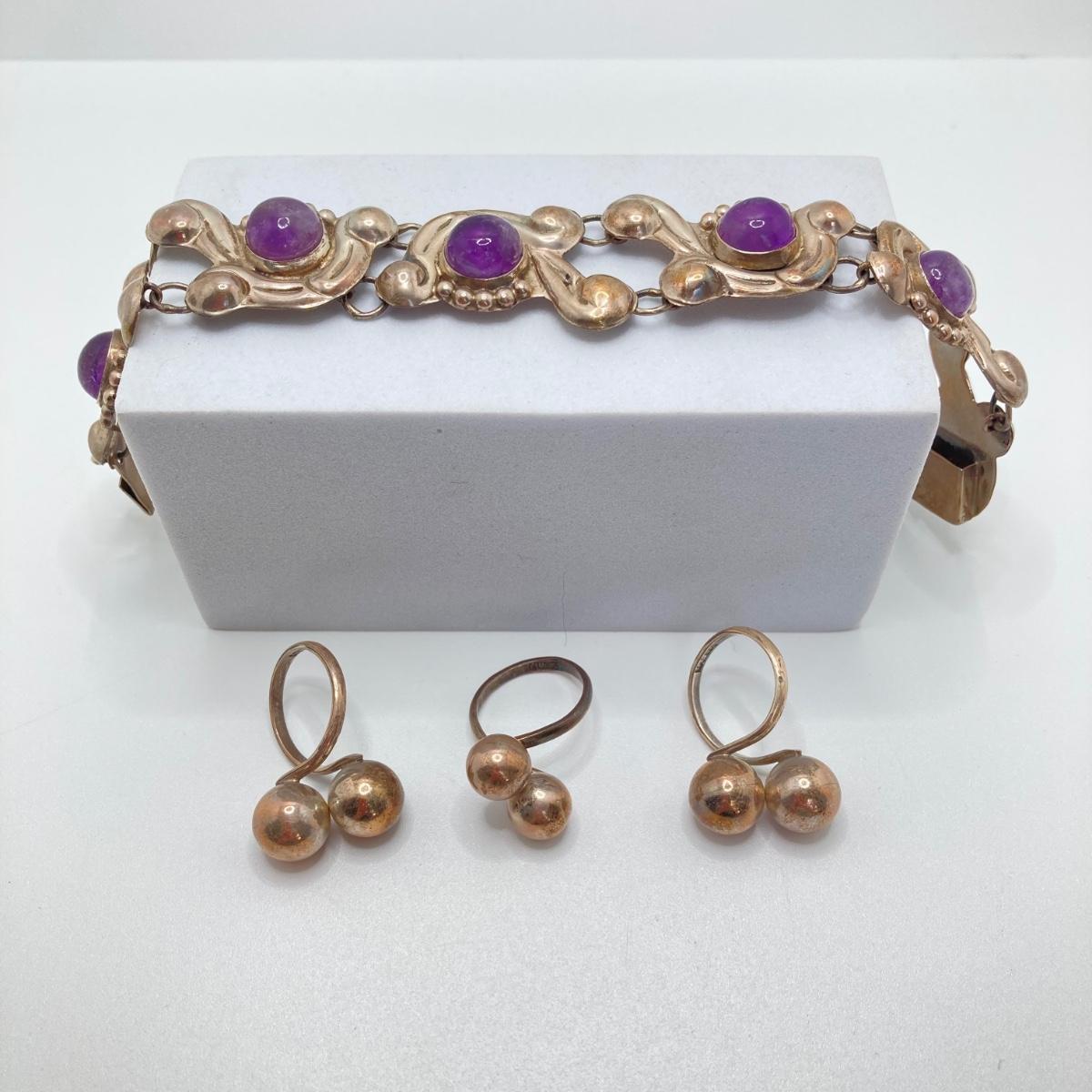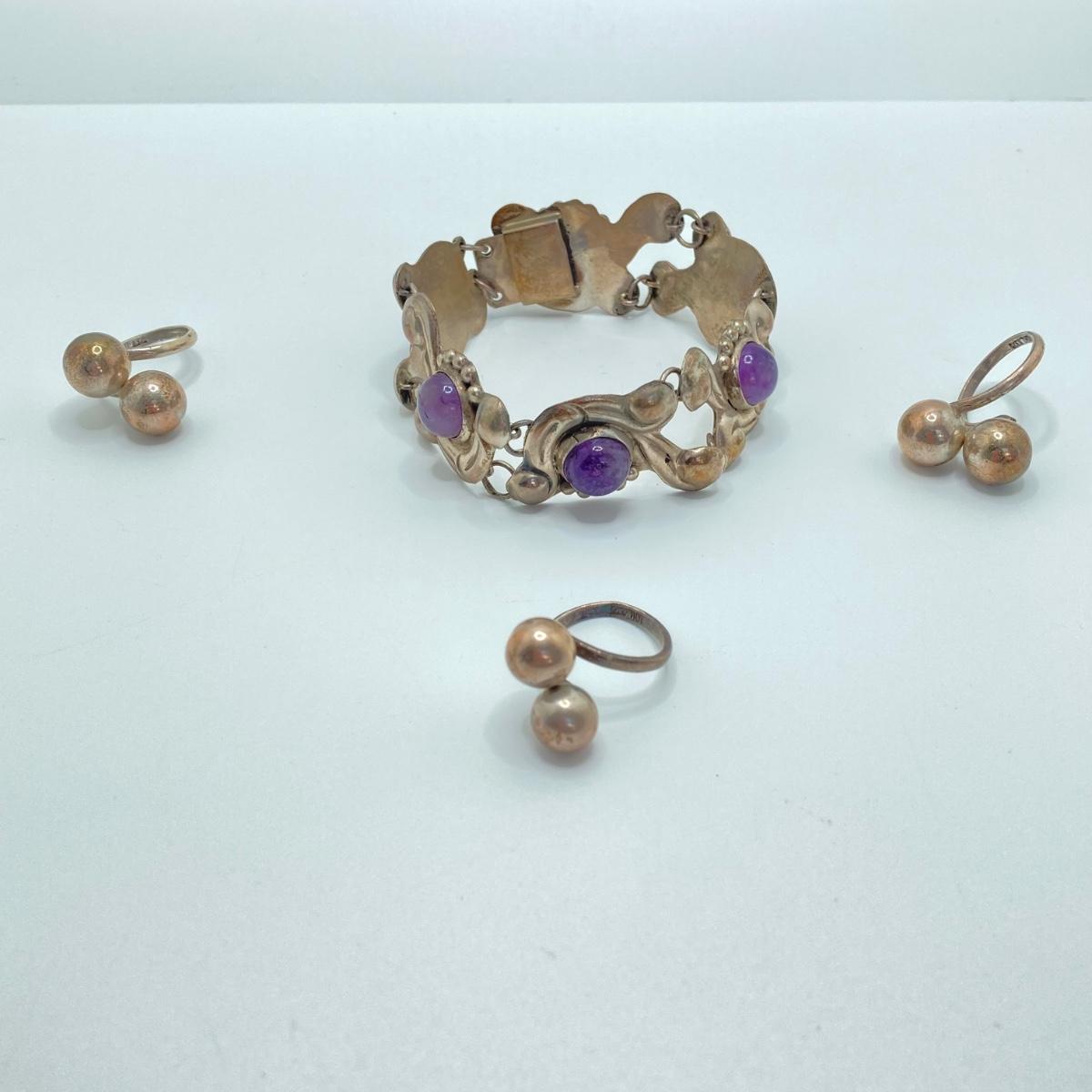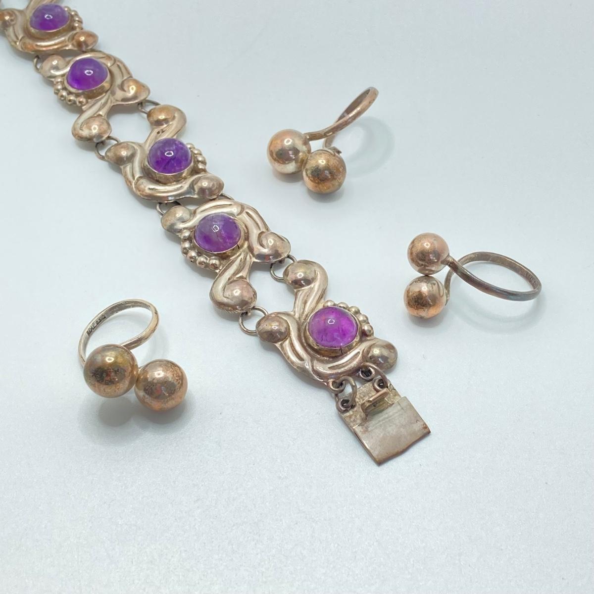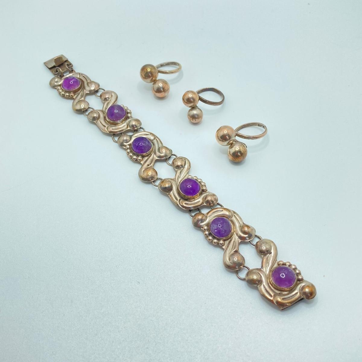 LOT 81: Beautiful Mexican Sterling Amethyst Bracelet with Three Adjustable Sterling Rings