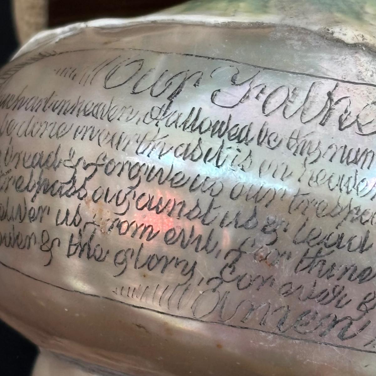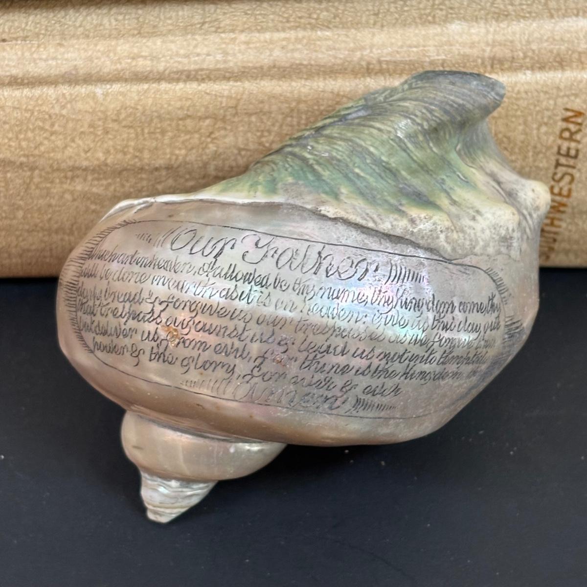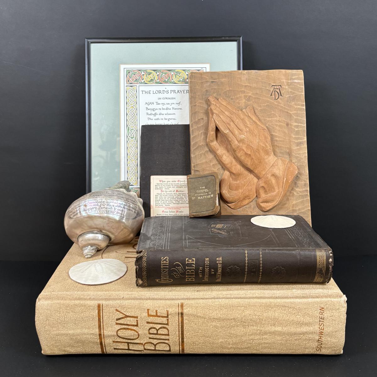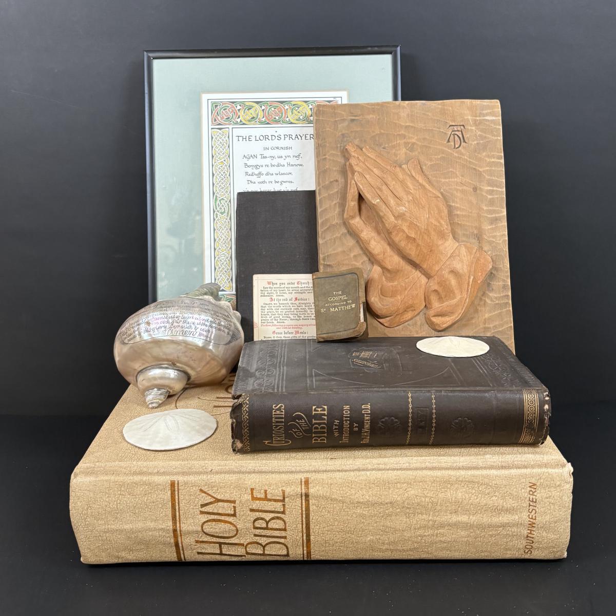 LOT 94: Turbo Marmoratus Shell Carved with The Lord's Prayer, Vintage Curiosities of the Bible Book, Carved Praying Hands Plaque, Framed, The Lord's Prayer in Cornish, Holy Bible & More
