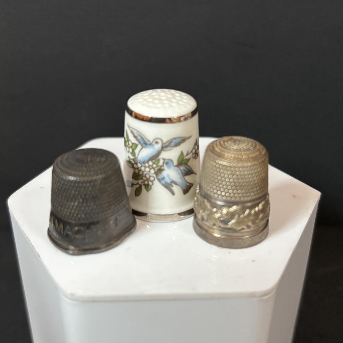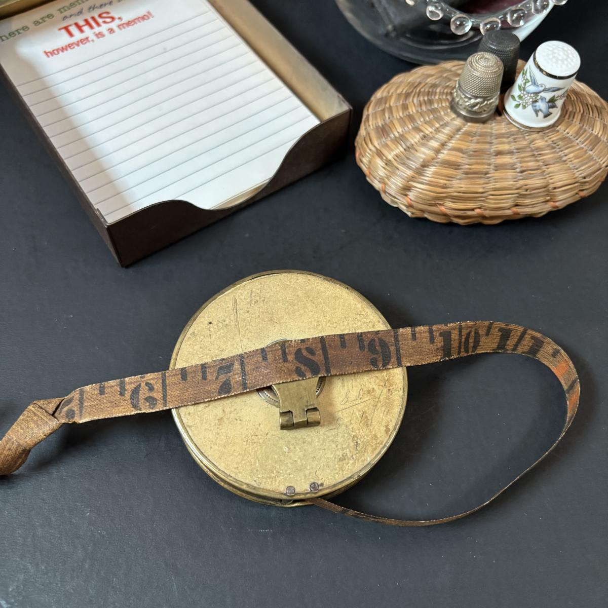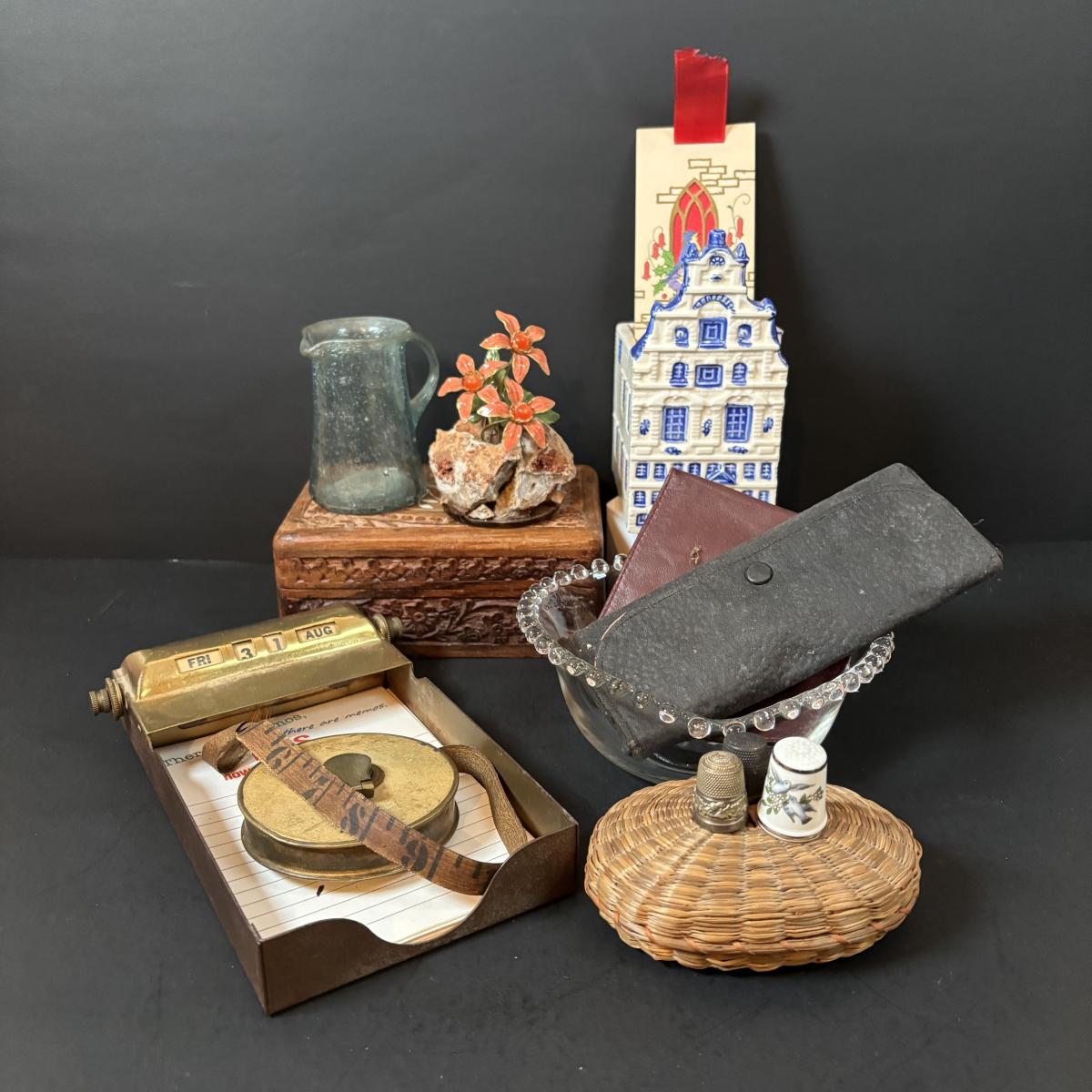 LOT 108: Vintage Collectible Finds: Tape Measure, Perpetual Calendar, Sterling Silver Thimble, Royal Worchester Thimble, Hand Crafted Enamel/Coral Floral Arrangement, Delft Blue Canal House & More