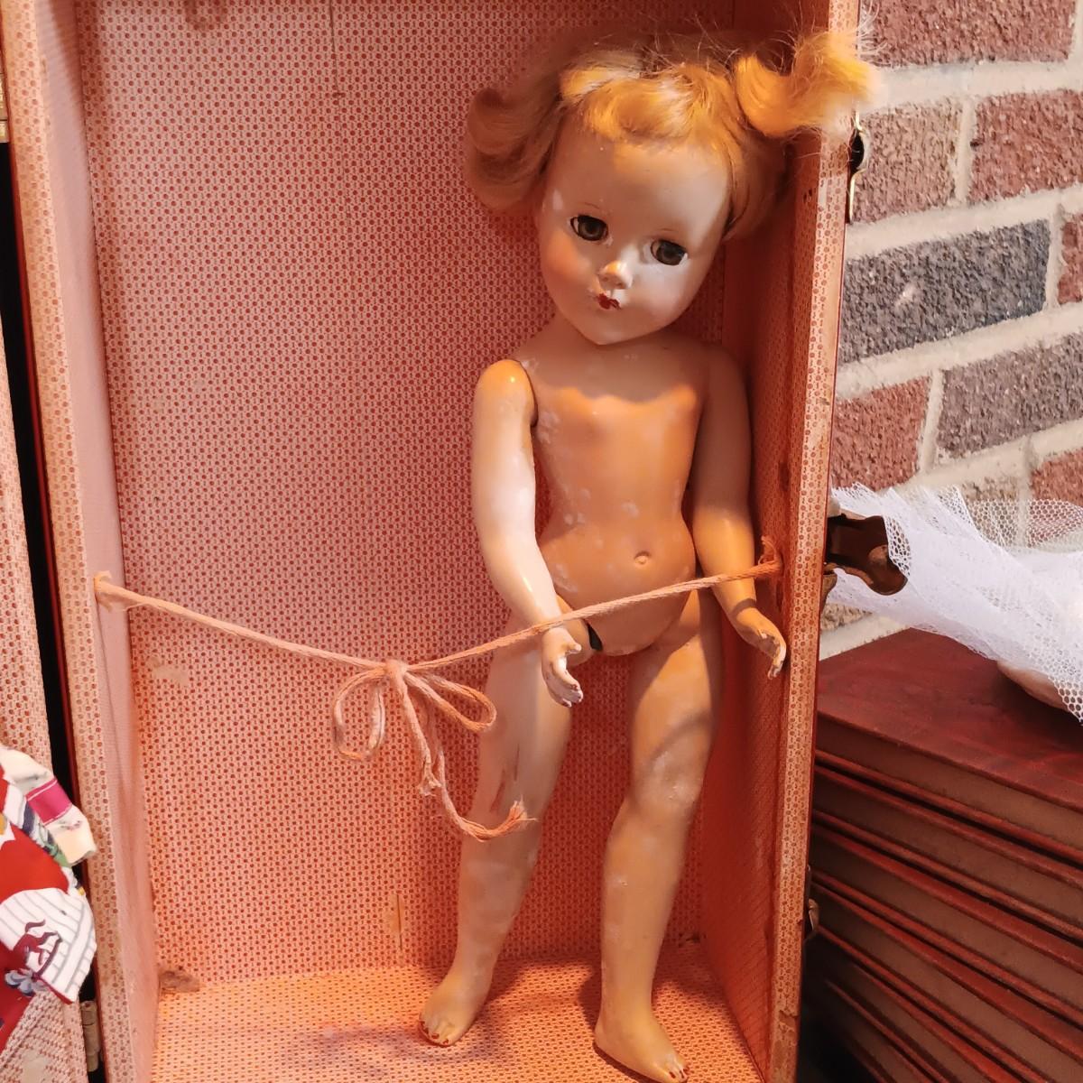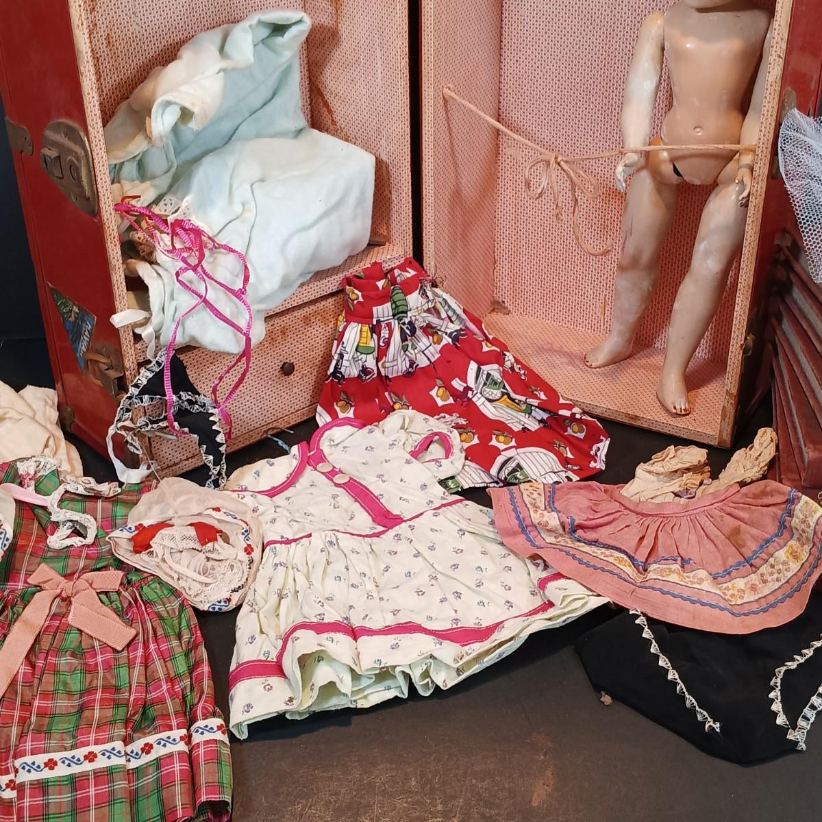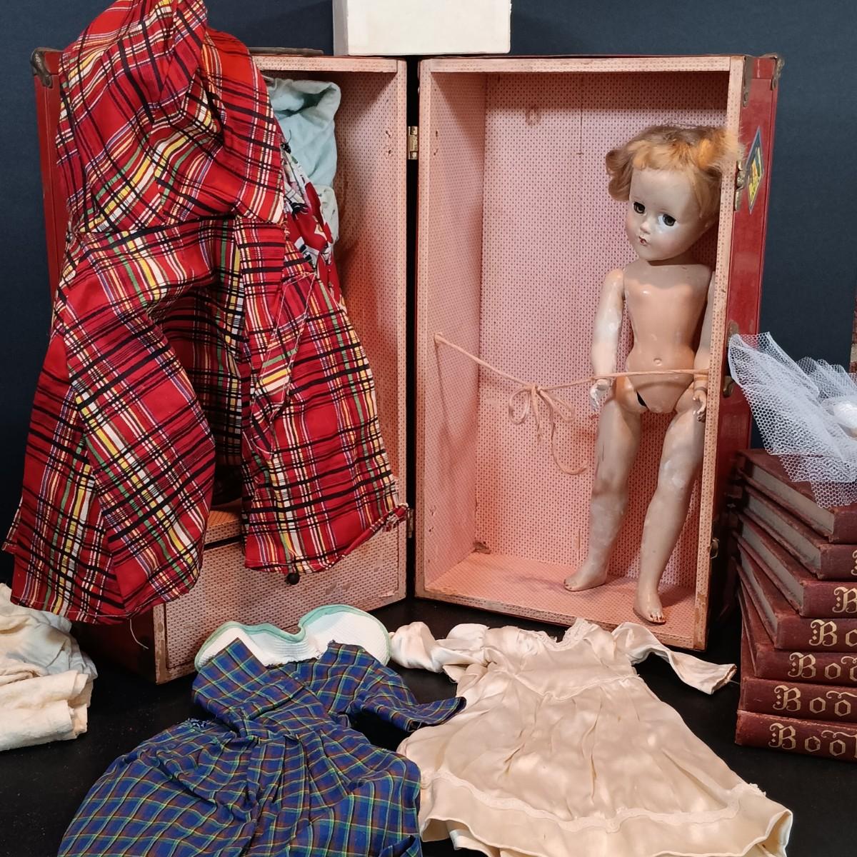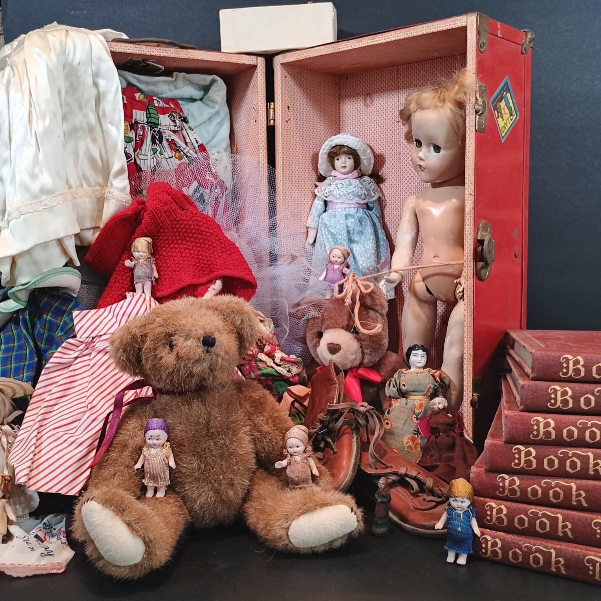 LOT 116: Large Collection of Vintage Dolls, Clothes and Metal Trunk with Book Trails 1940s Volumes 1-8