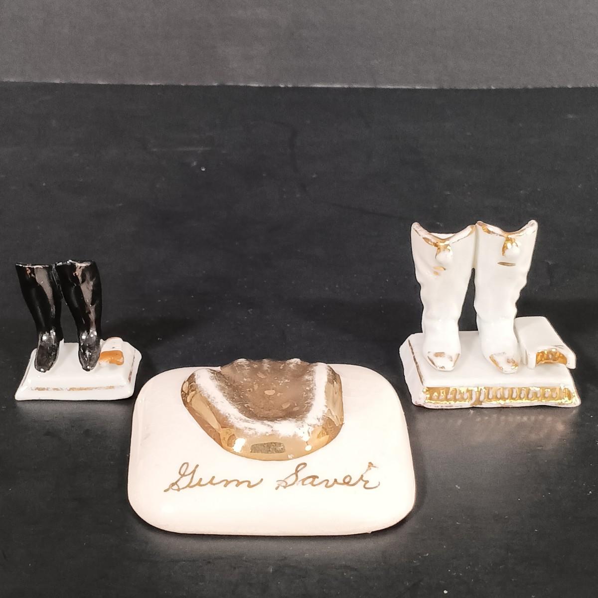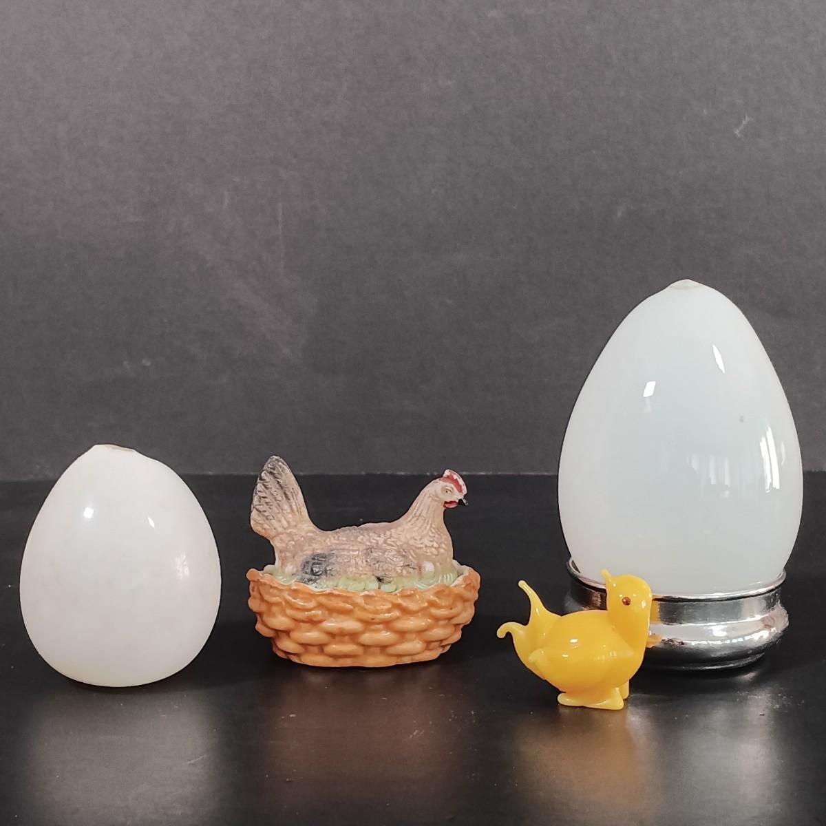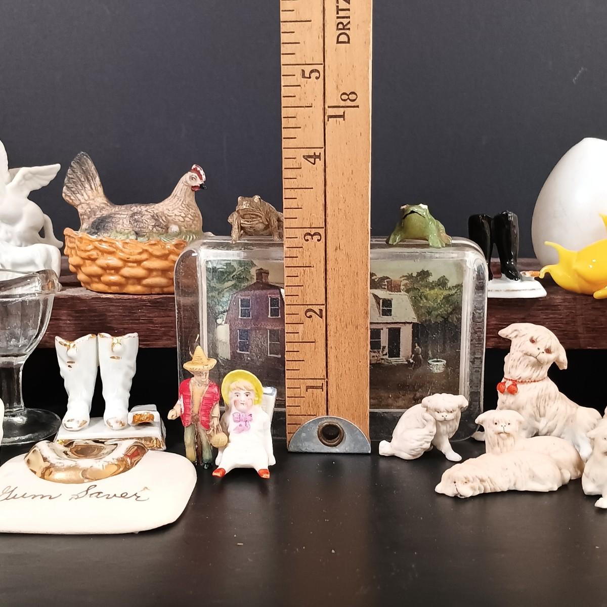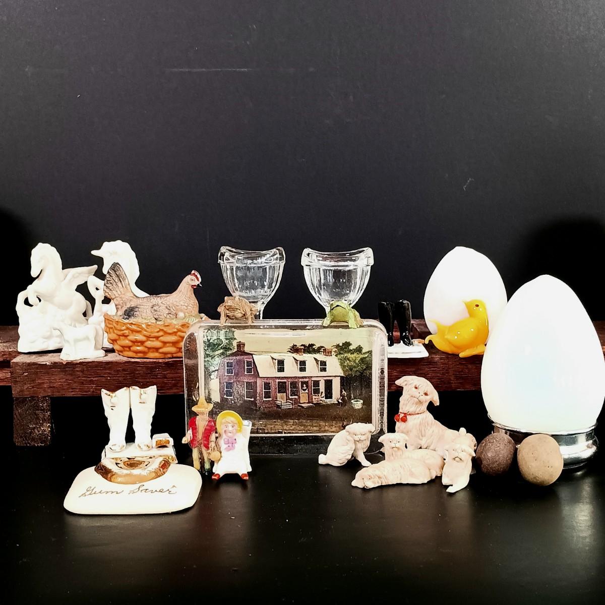 LOT 120: Milk Glass Eggs, Eye Wash Cups, Miniature Bisque Dogs, Porcelain Cigarette Holder Boots & More