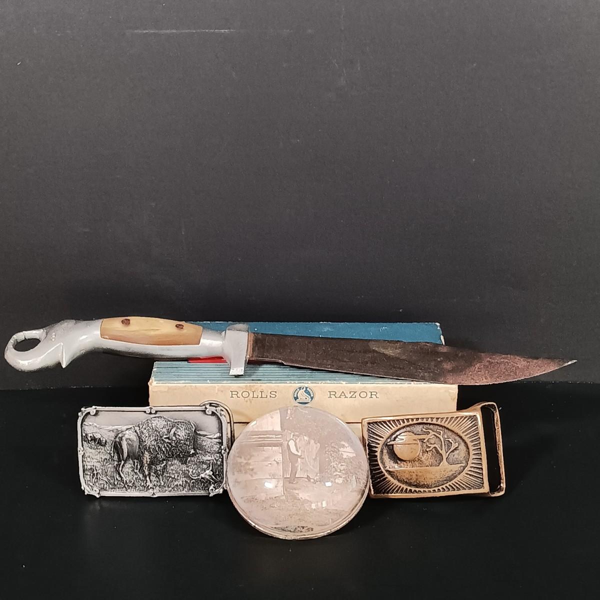 LOT 123: Rolls Razor Viscount Model, Tech Ether Guild 'la Luna' Brass Buckle, Hunting Knife Made in Mexico & More