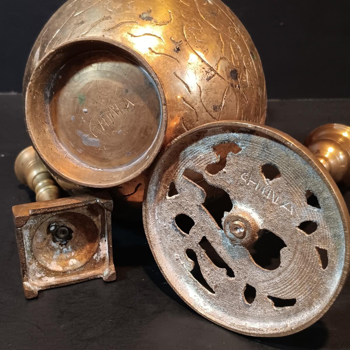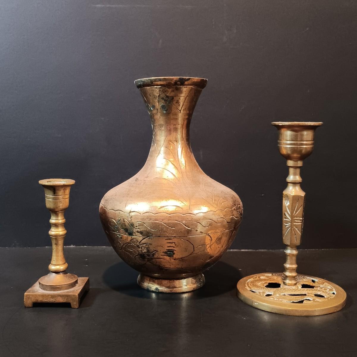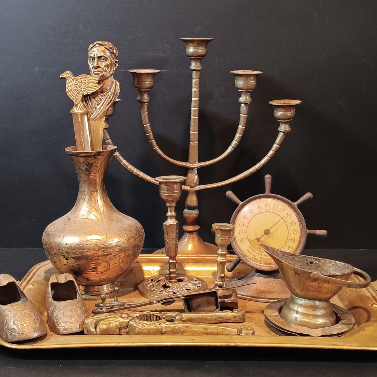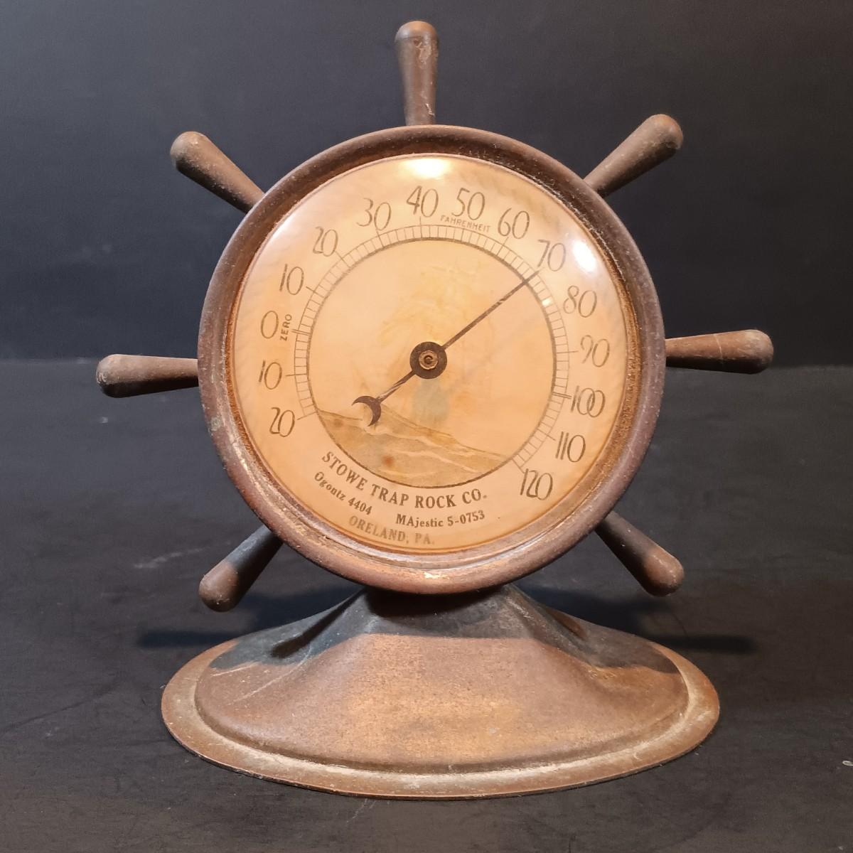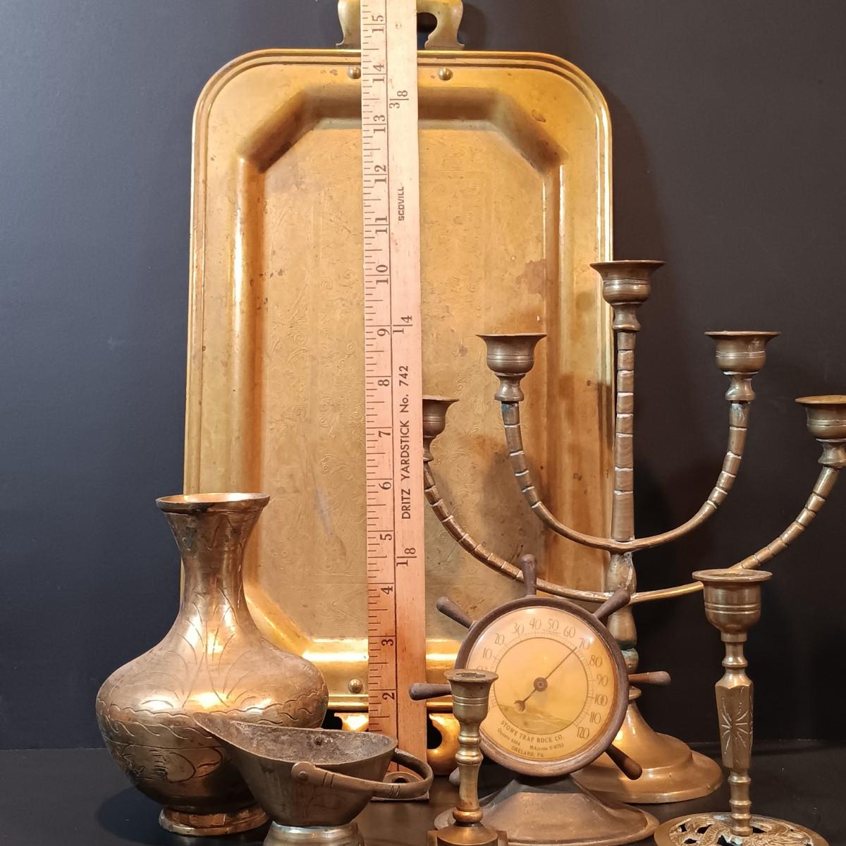 LOT 134: Brass Collection- Stowe Trap Rock Co. Nautical Thermometer, Vase, Candlestick Holders & More