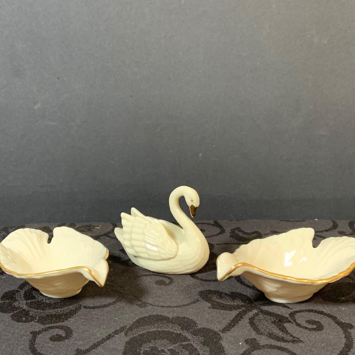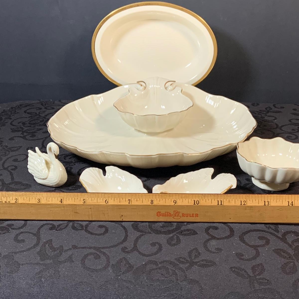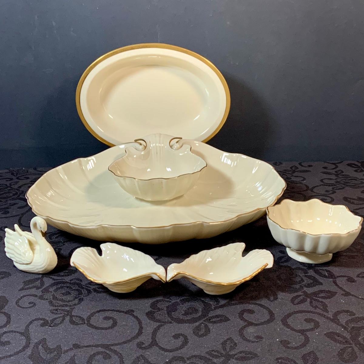 LOT 155: Collection of Lenox China Featuring Aegean Gold Trim Clam Shell Chip and Dip Bowl, Swan, Bird and Other Bowls