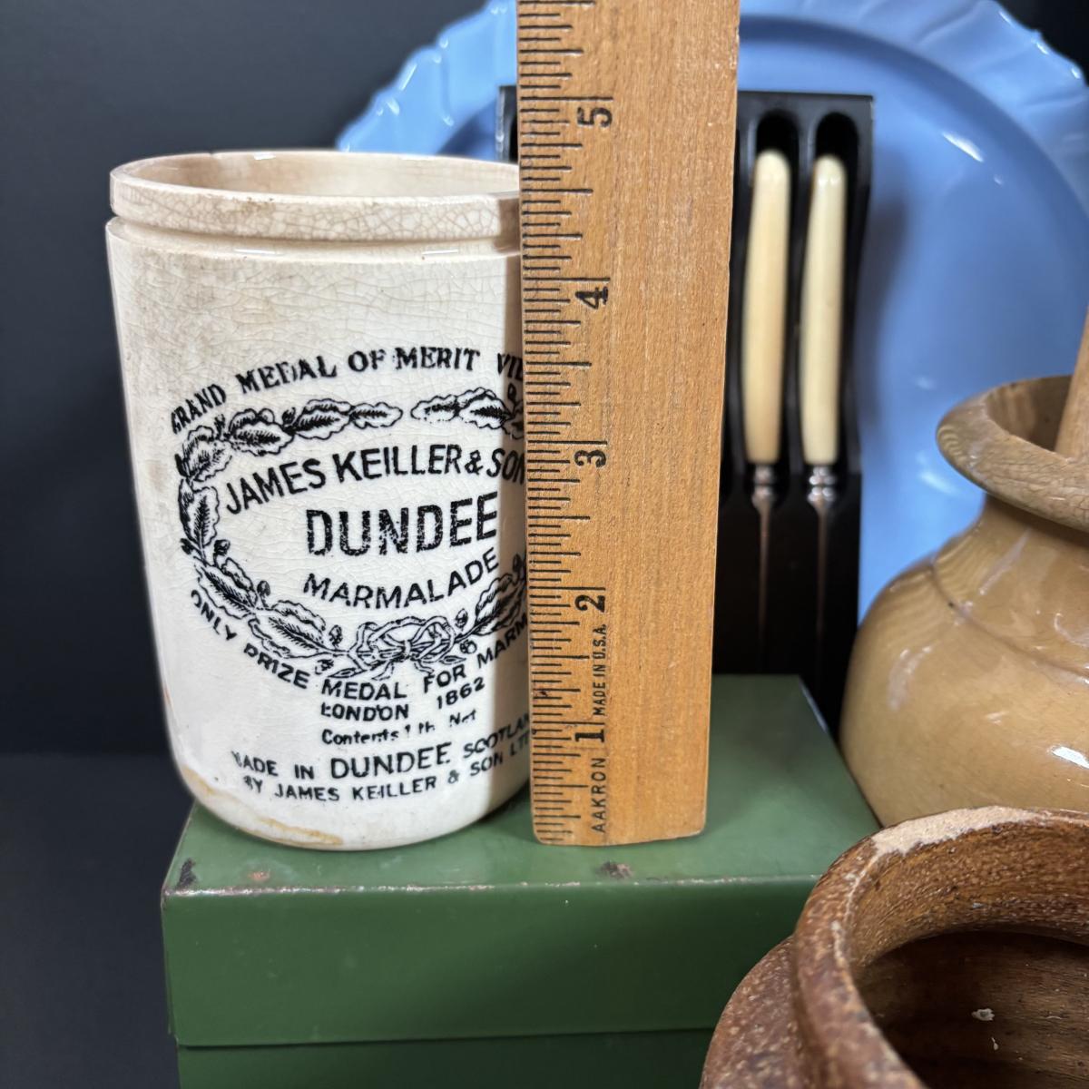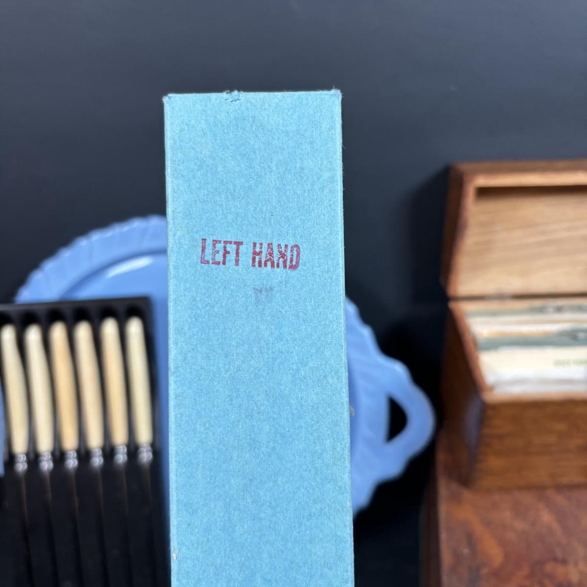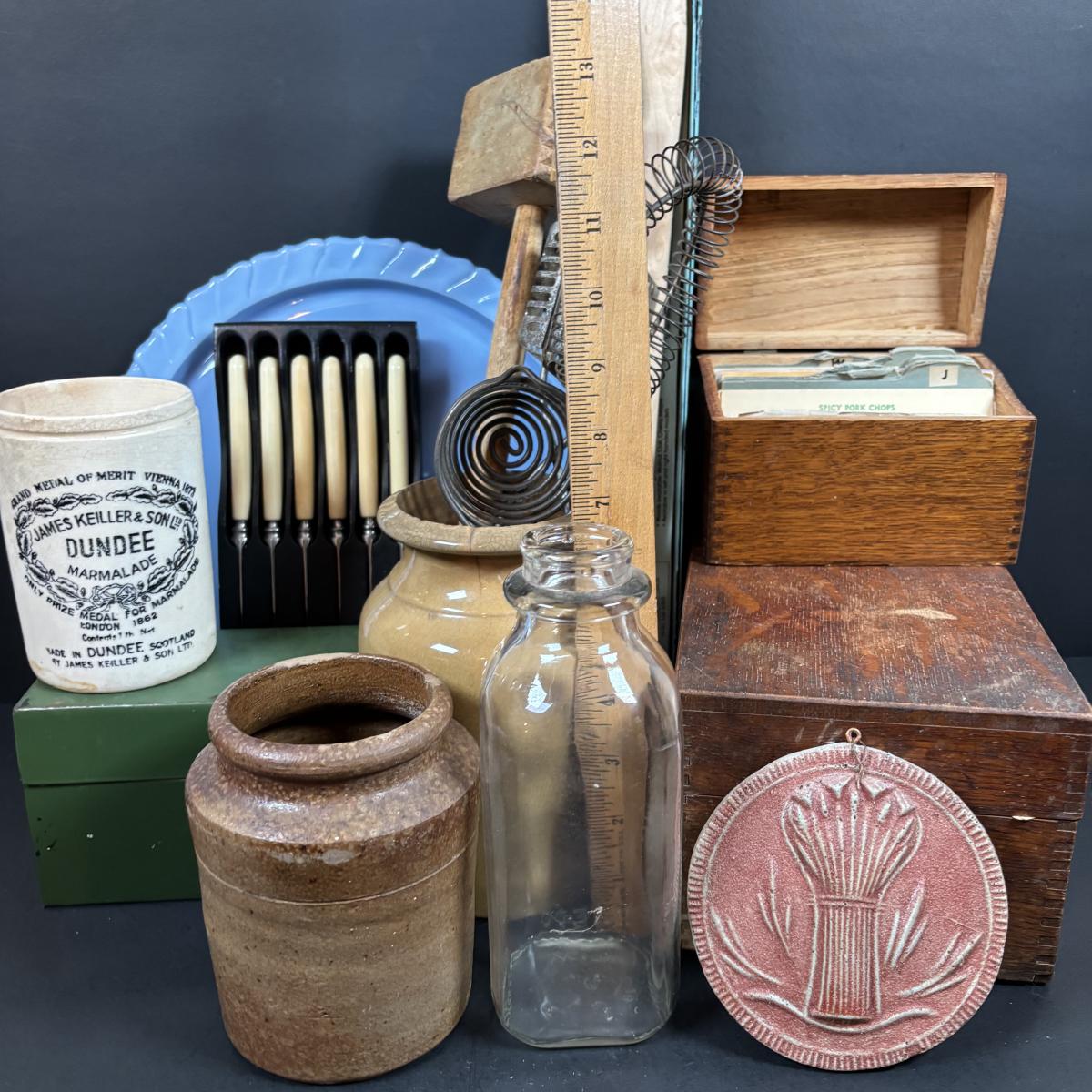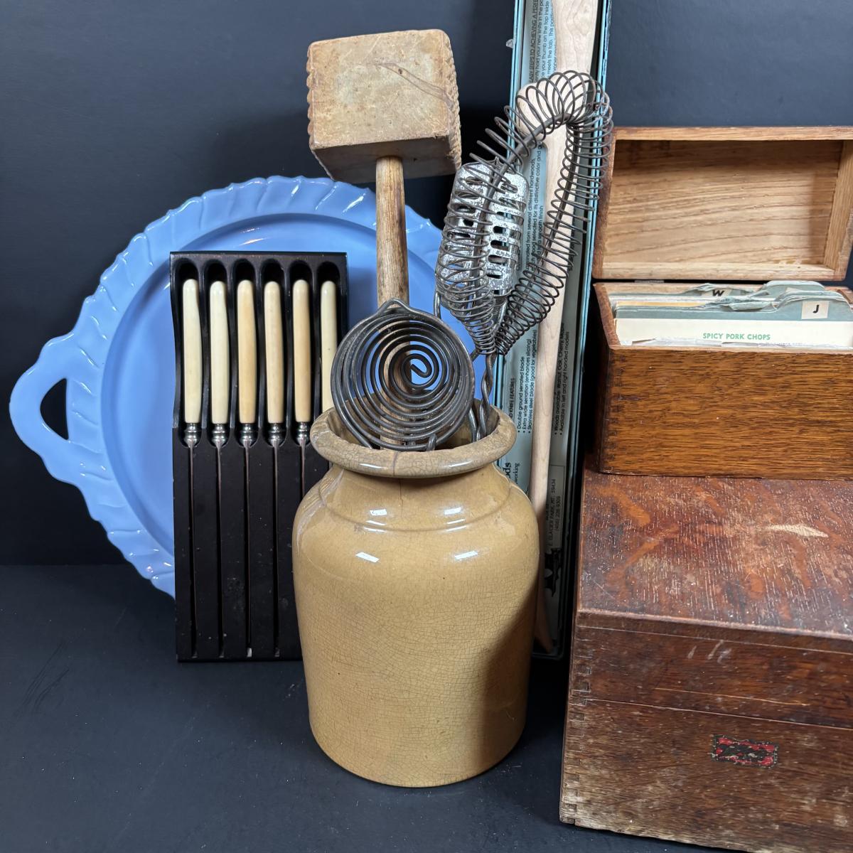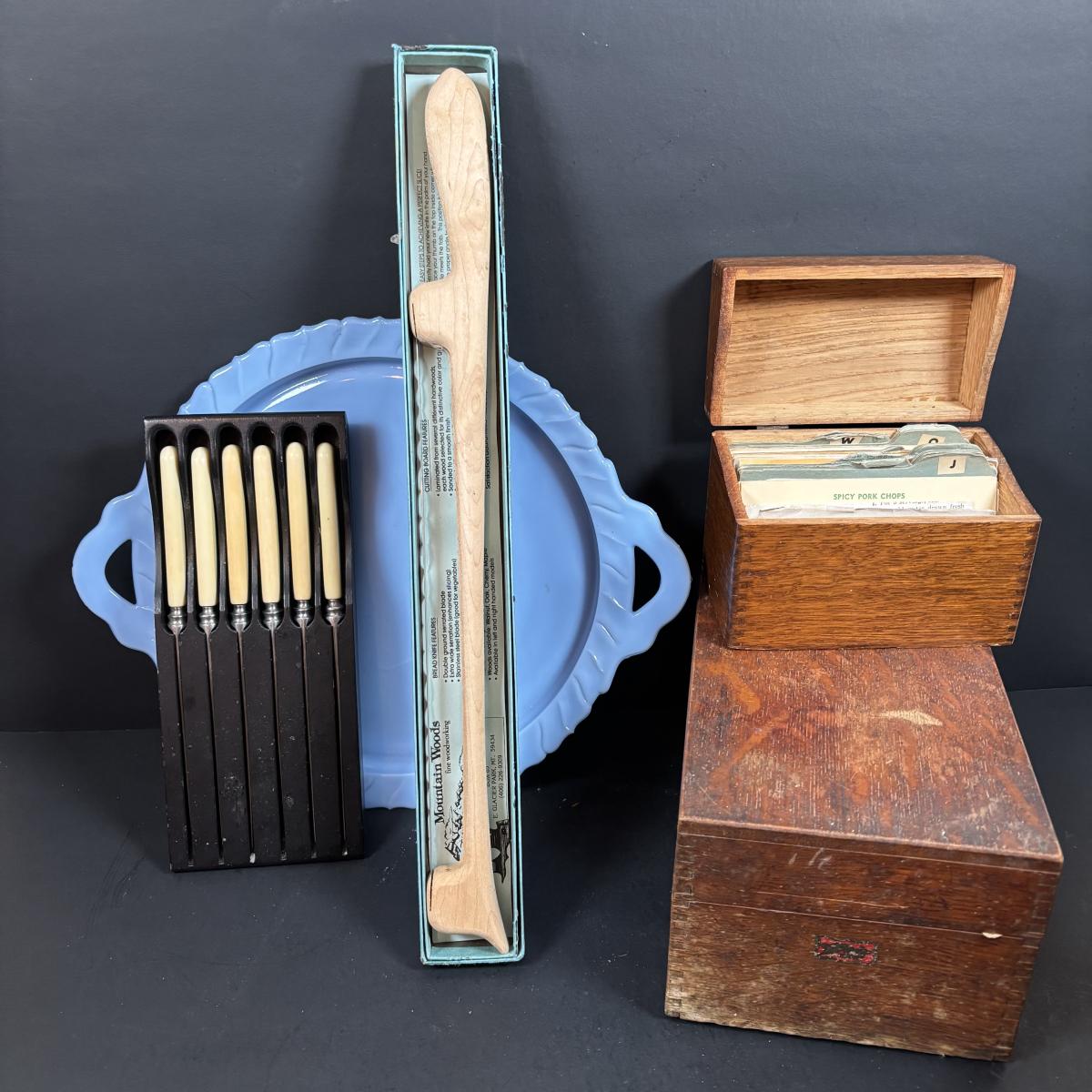 LOT 200: Wooden Recipe Holders, Dundee Marmalade Crock & Others, Strawbridge & Clothier Knife Set made by Sheffield England, Hand-Crafted Left-Hand Bread Knife
