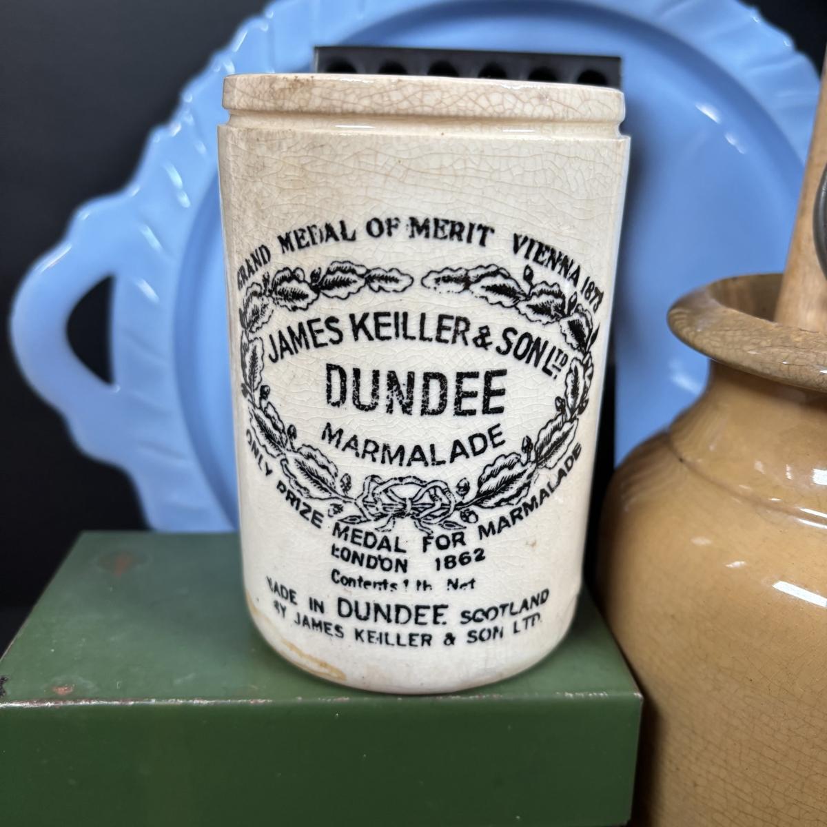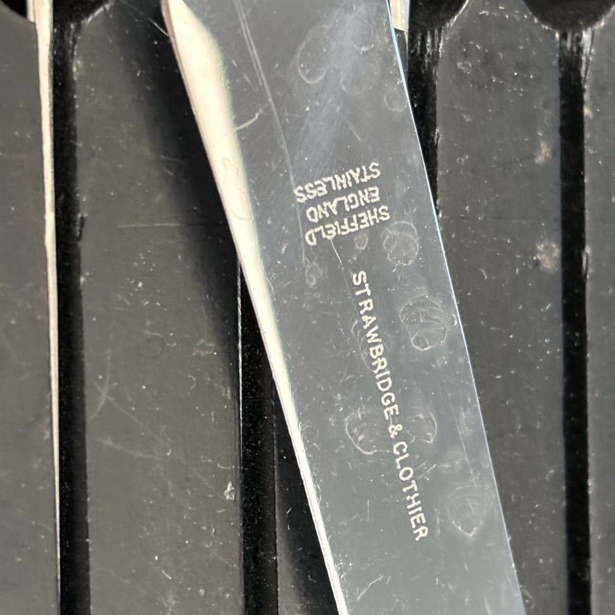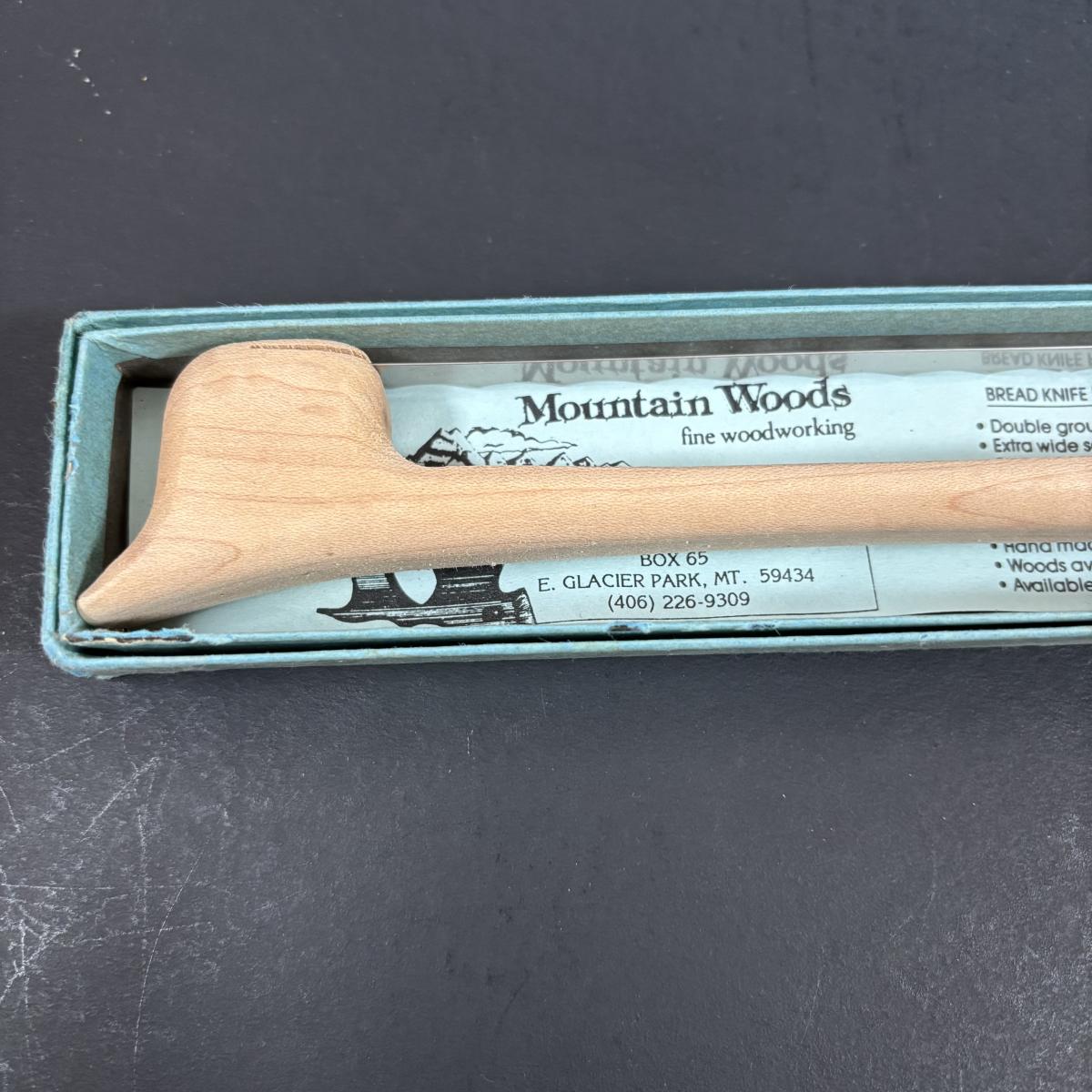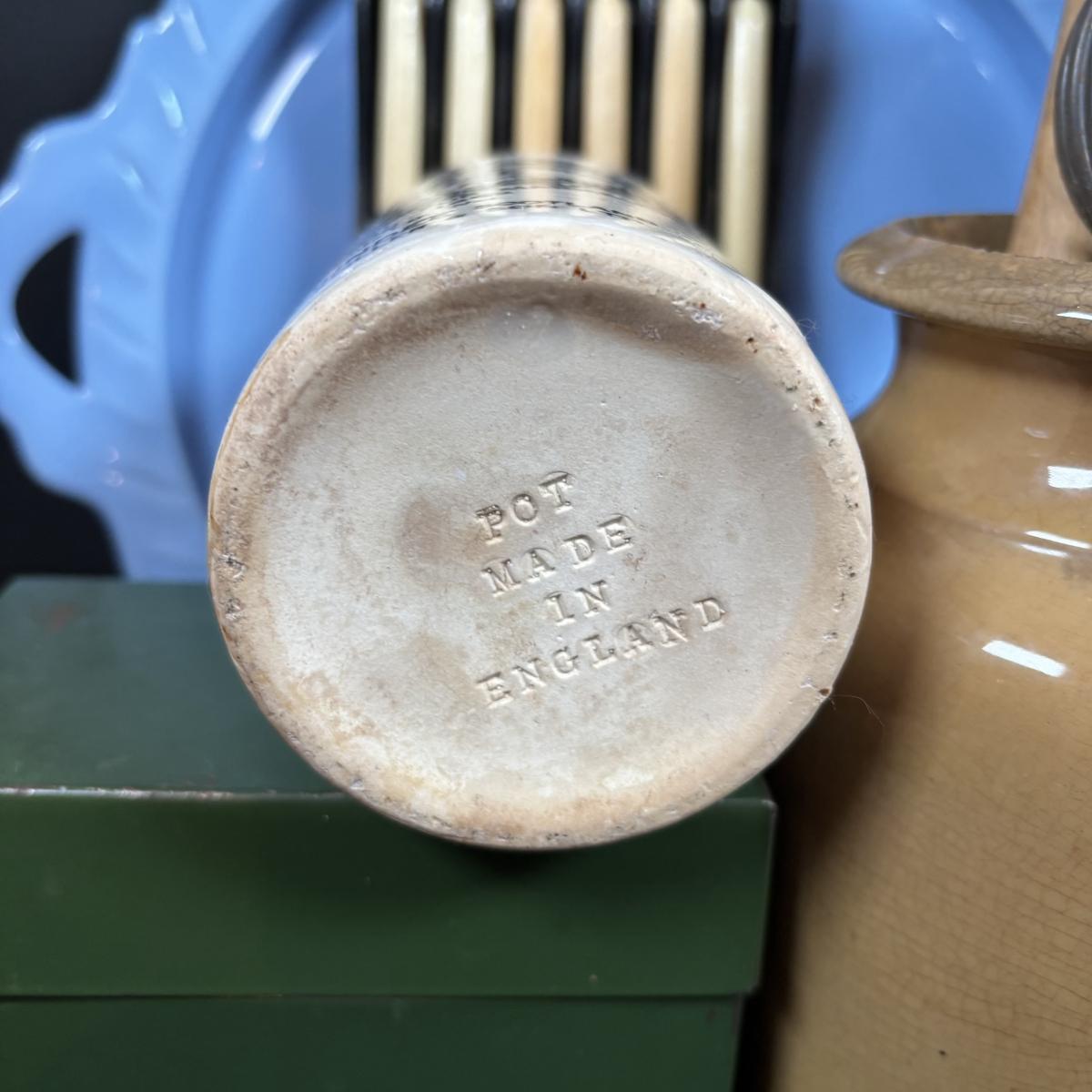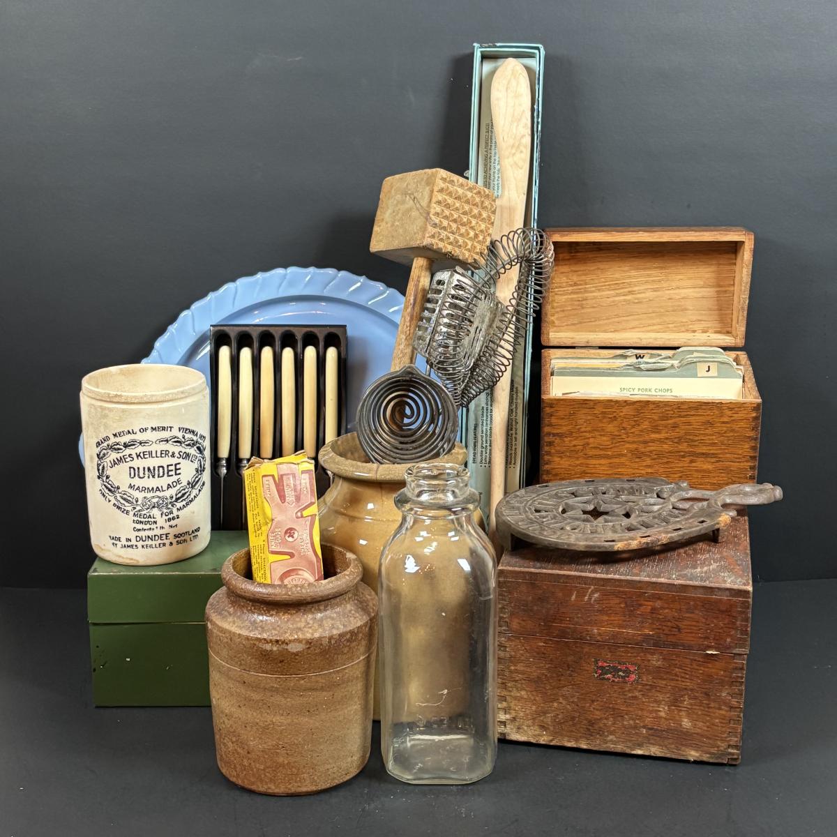 LOT 200: Wooden Recipe Holders, Dundee Marmalade Crock & Others, Strawbridge & Clothier Knife Set made by Sheffield England, Hand-Crafted Left-Hand Bread Knife