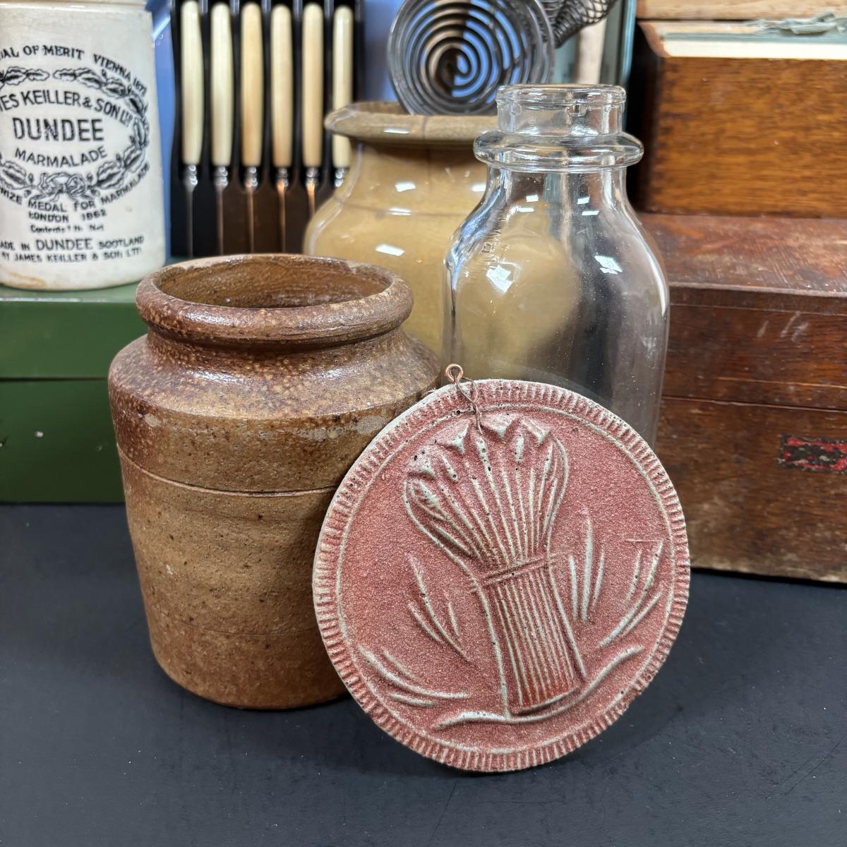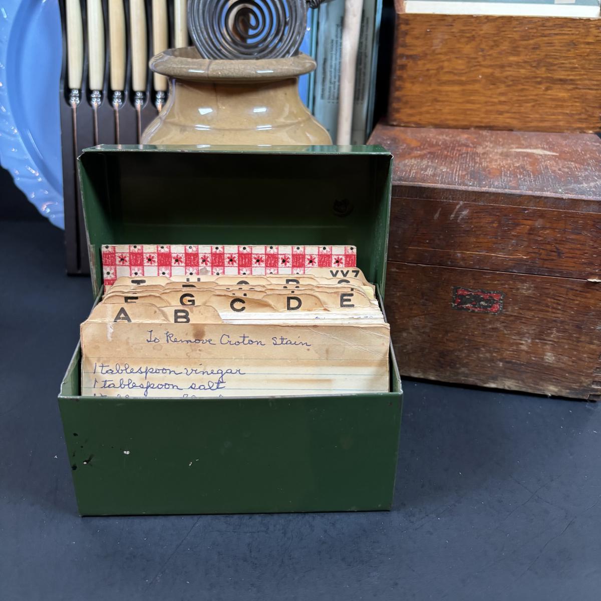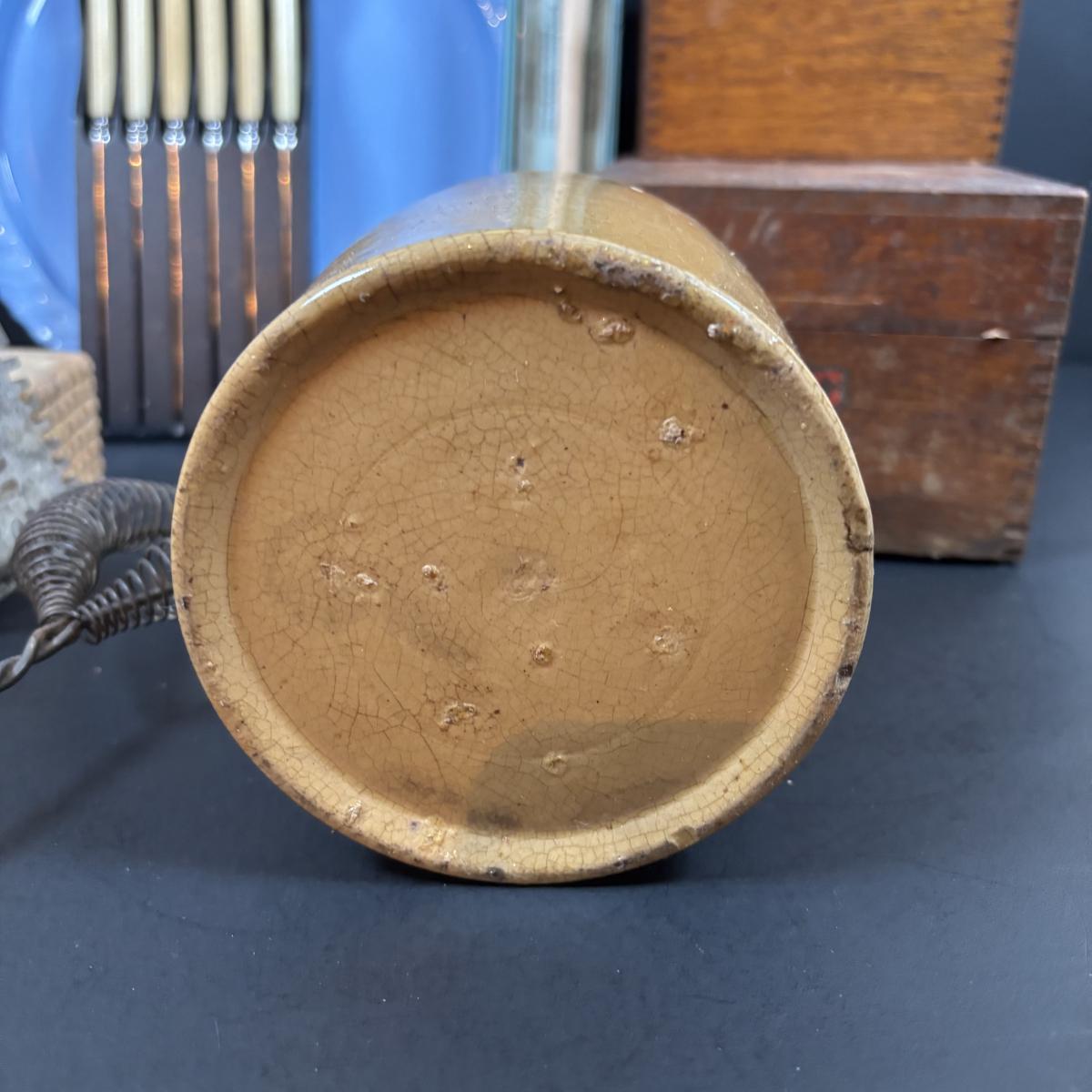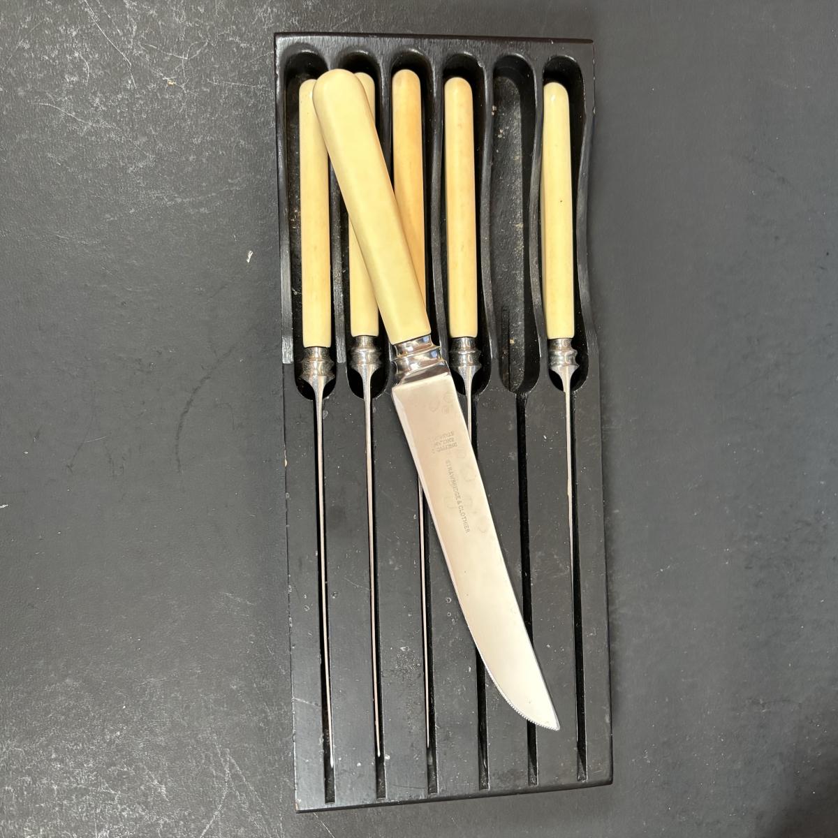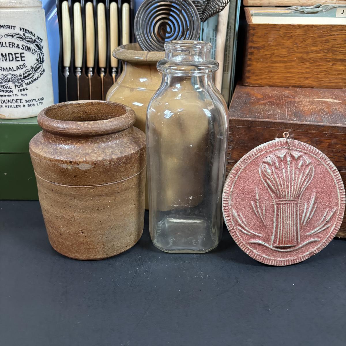 LOT 200: Wooden Recipe Holders, Dundee Marmalade Crock & Others, Strawbridge & Clothier Knife Set made by Sheffield England, Hand-Crafted Left-Hand Bread Knife
